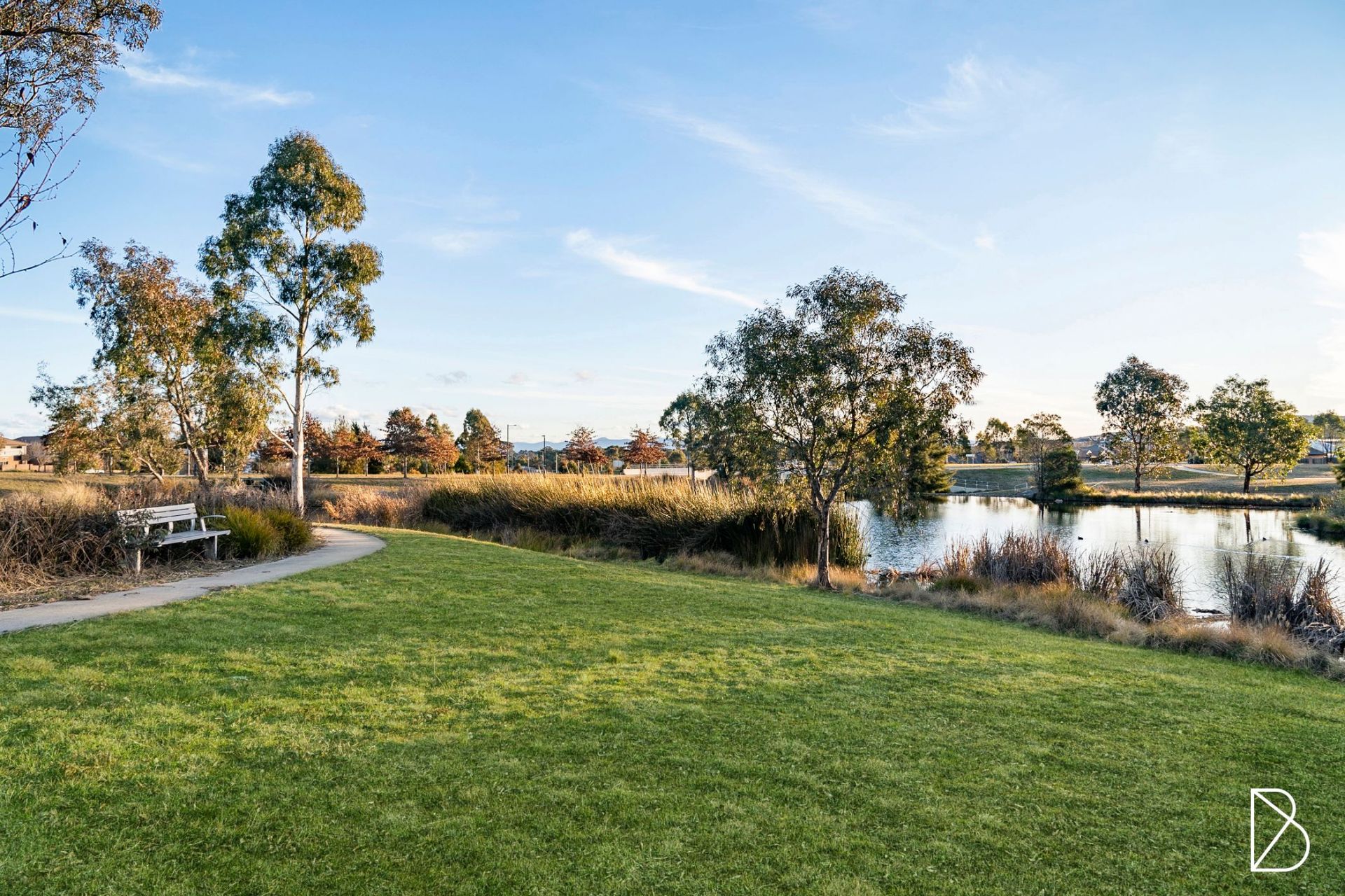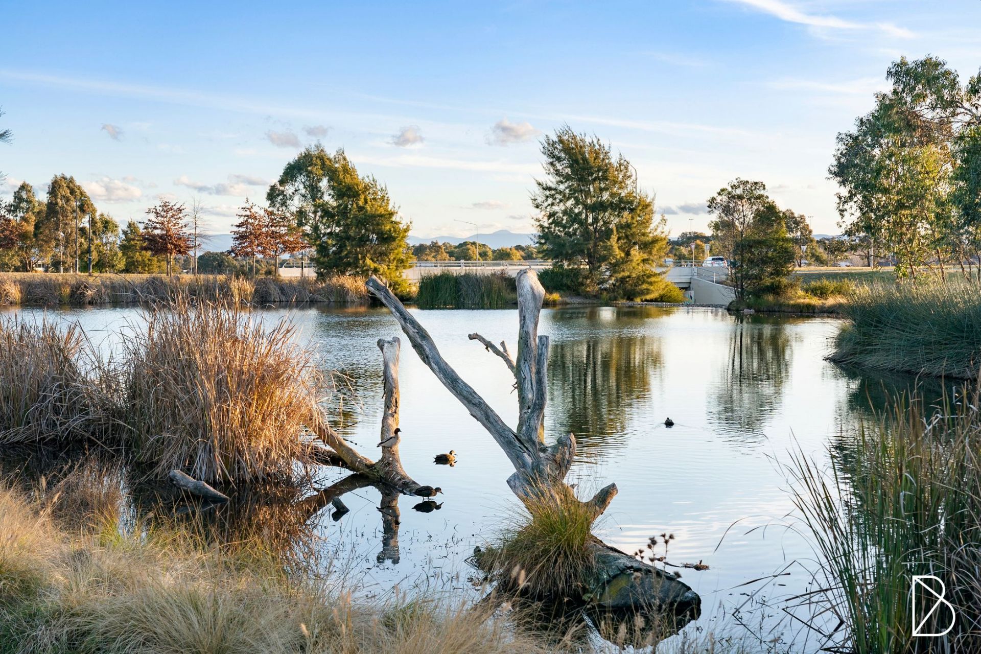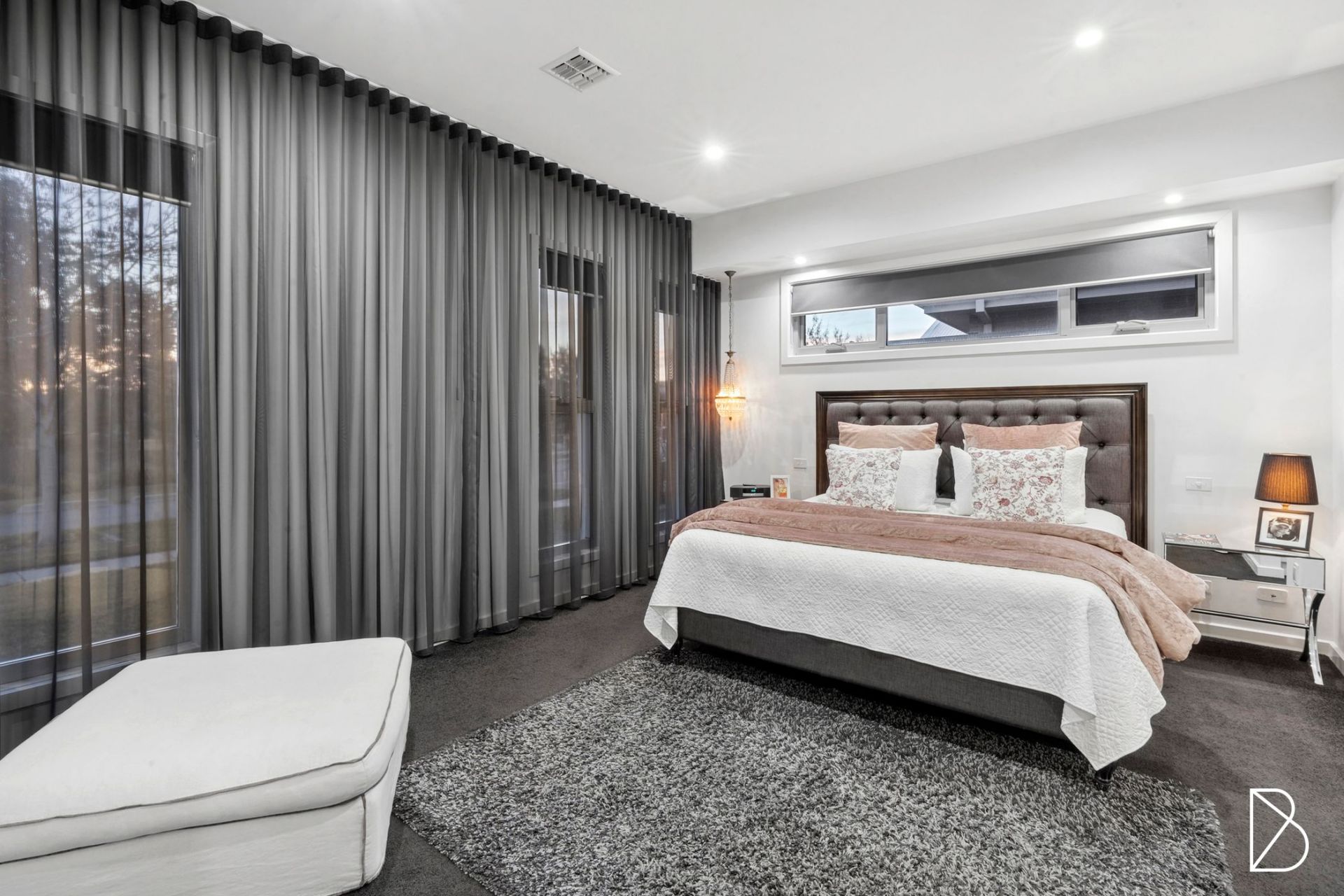 • Secluded master bedroom with scenic outlook towards the pond, with a custom walk-through robe, attic ceiling, and designer ensuite