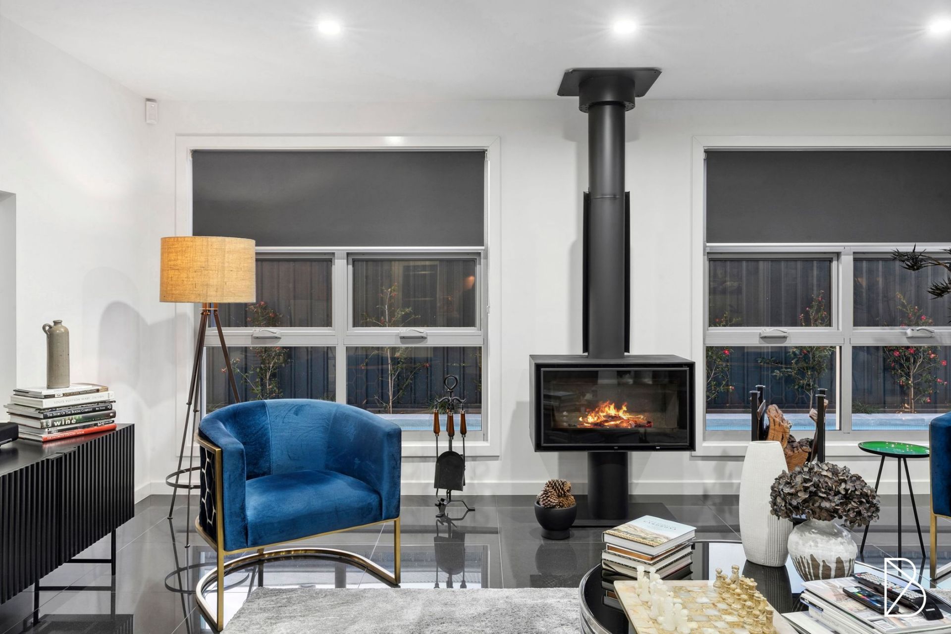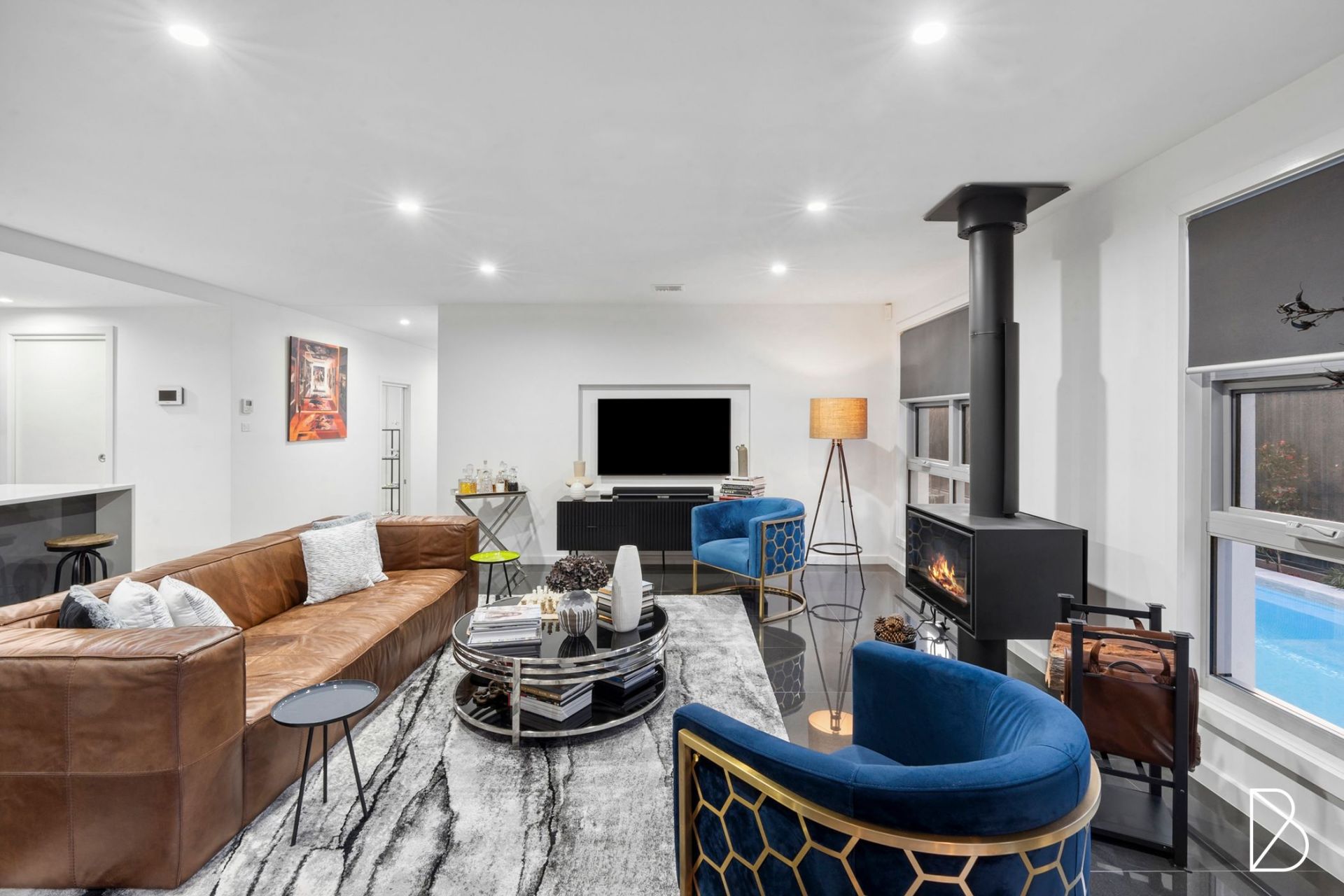 • Open plan lounge room featuring slow-combustion fireplace