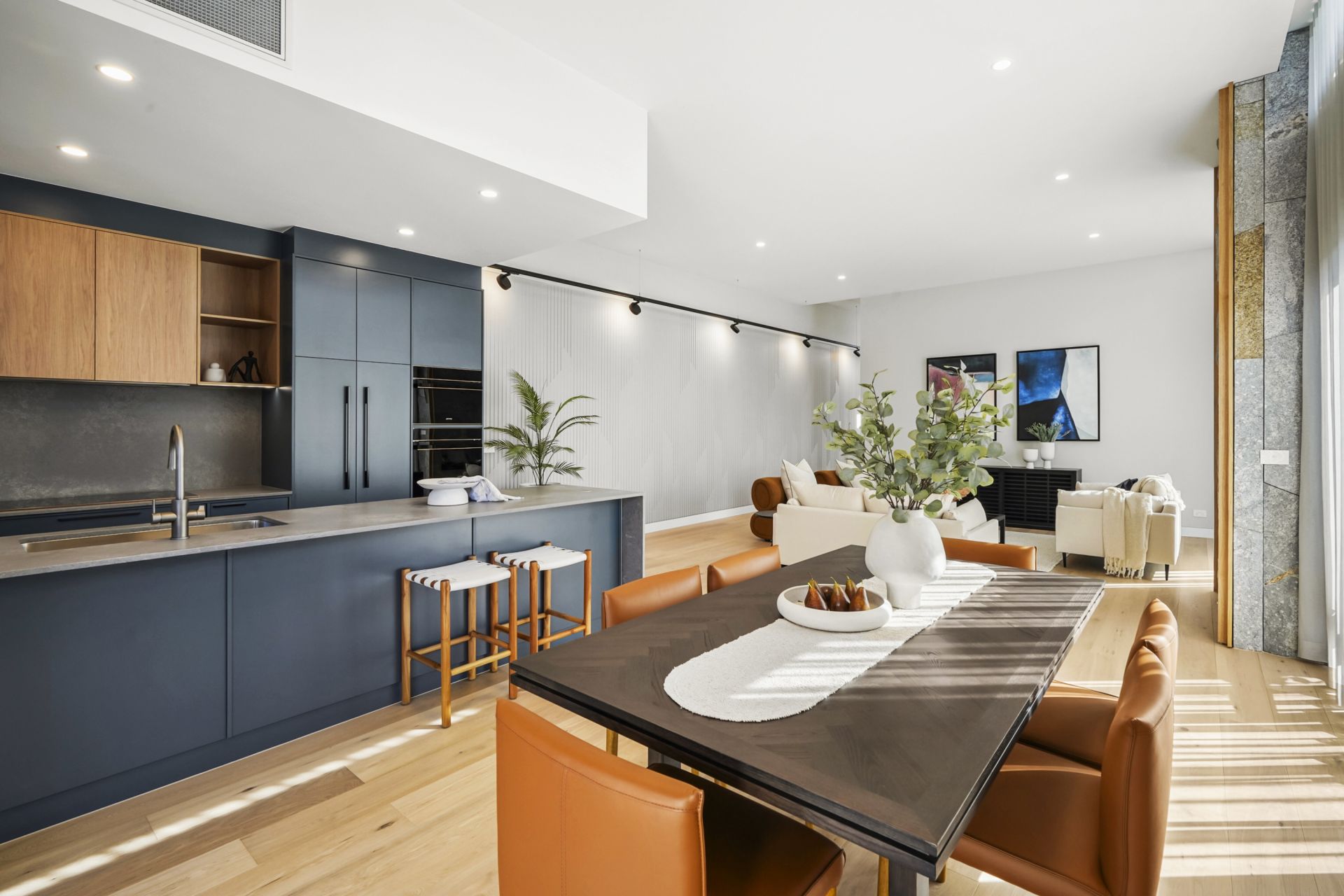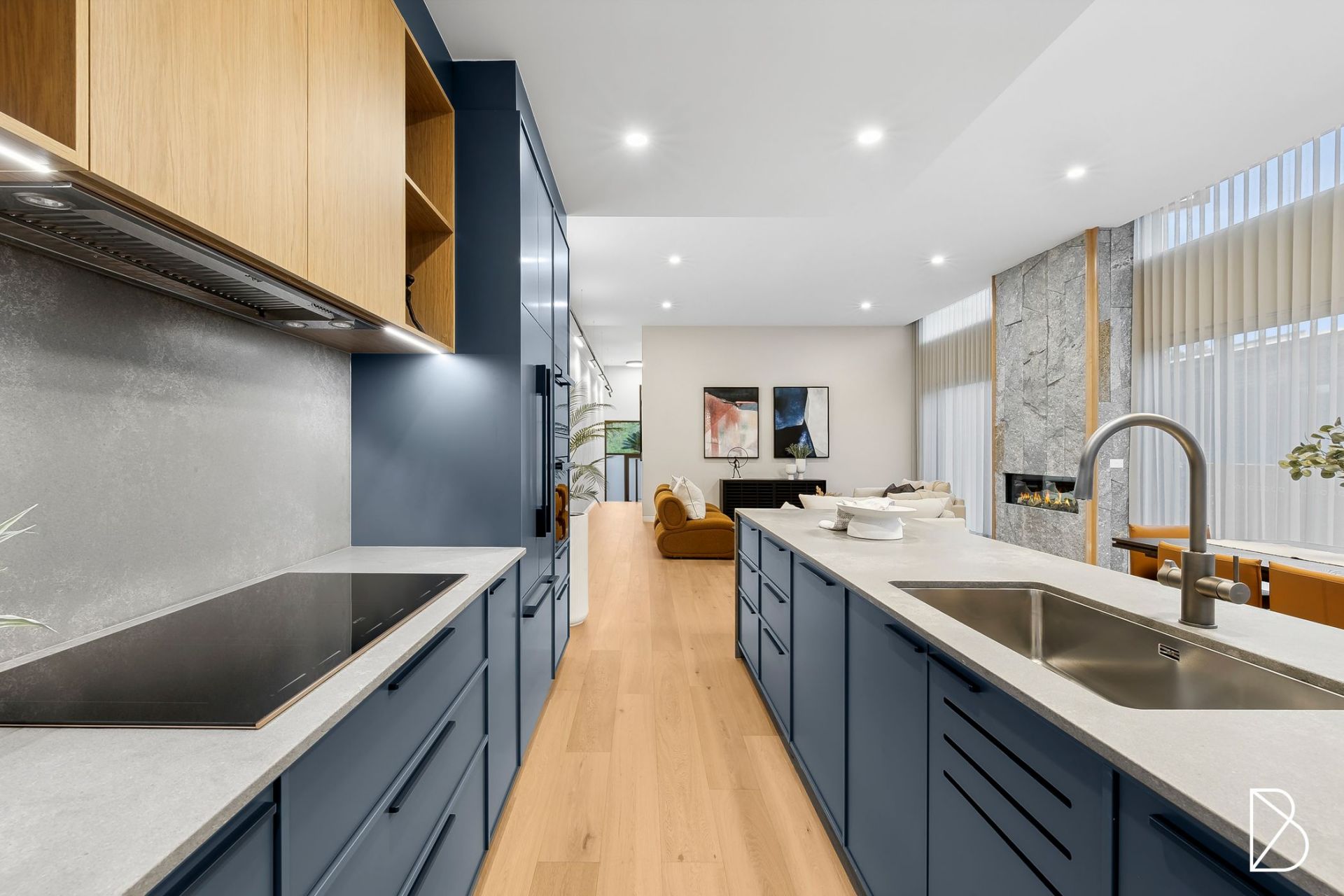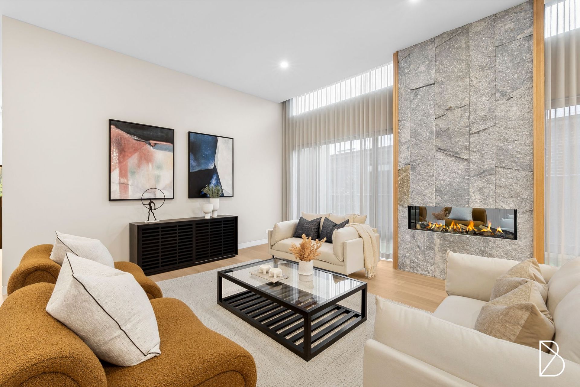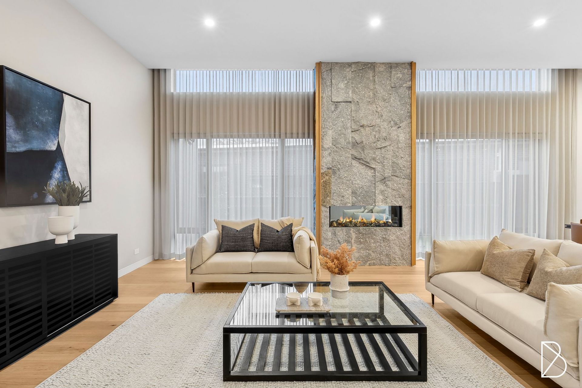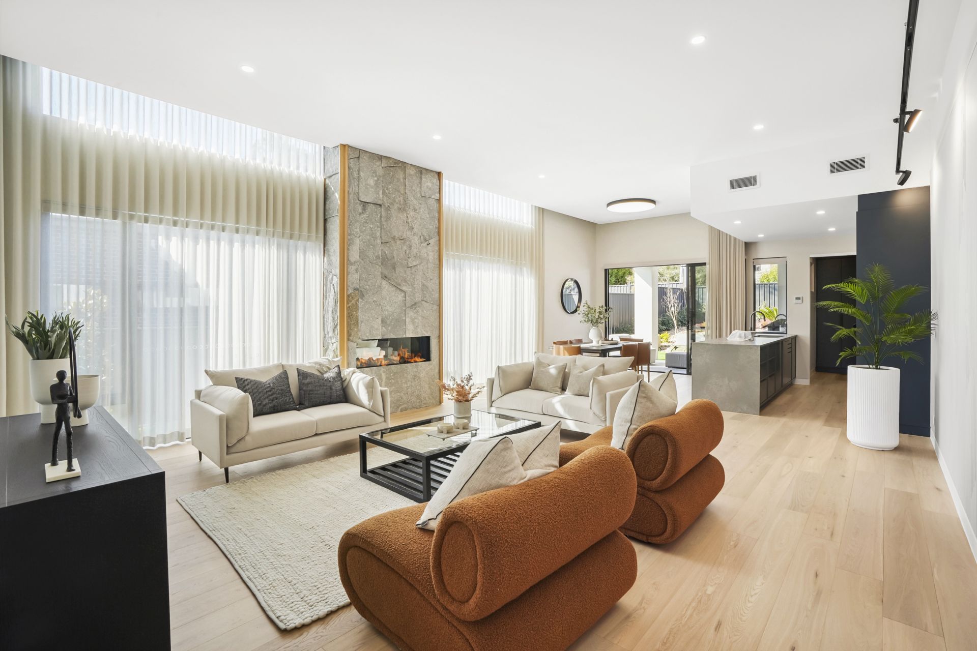 - Spacious open plan living and dining with timber veneer flooring, high ceilings with double glazed floor to ceiling windows, electric block out blinds and electric fireplace with feature Artisan Stone surround