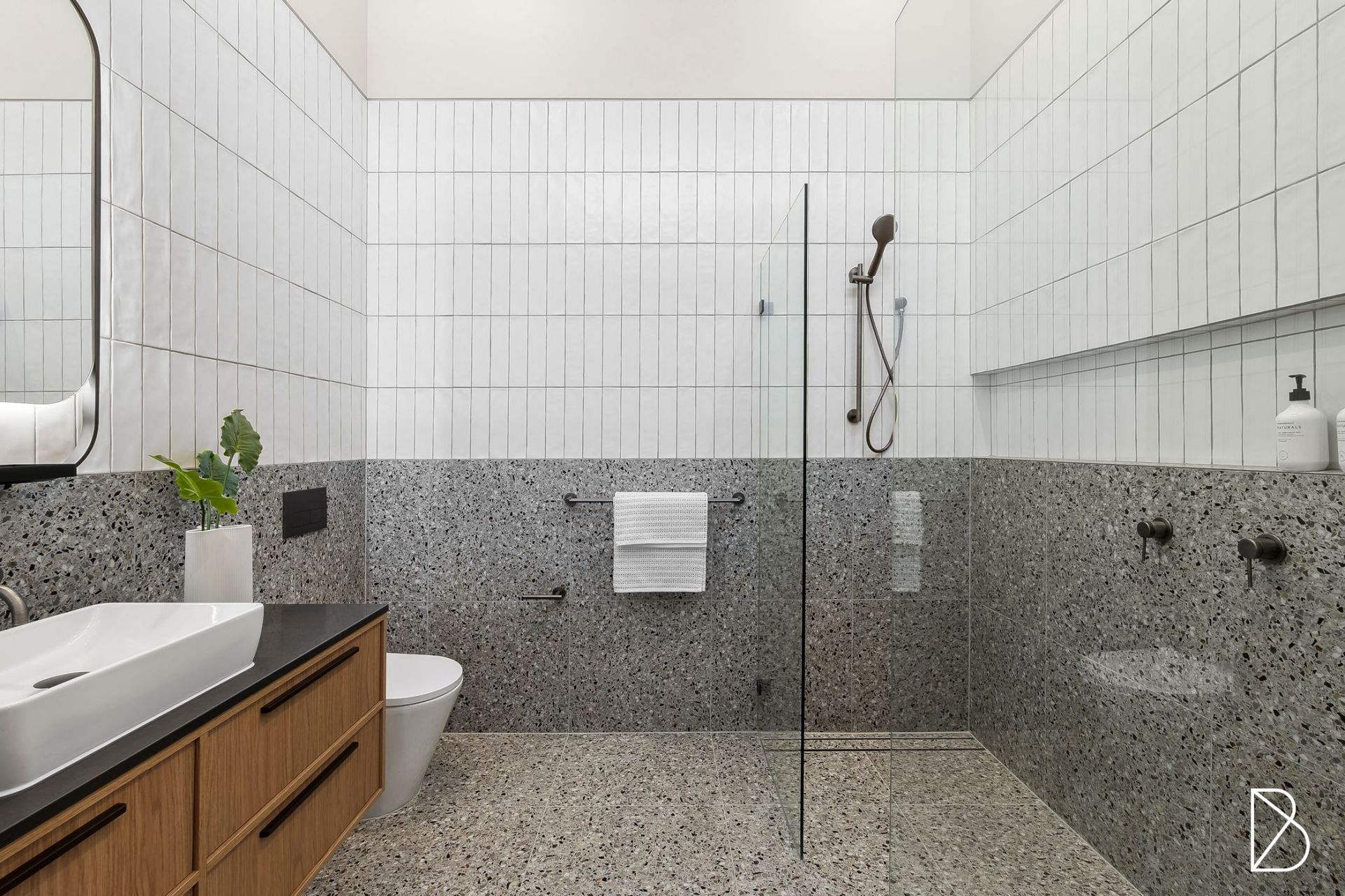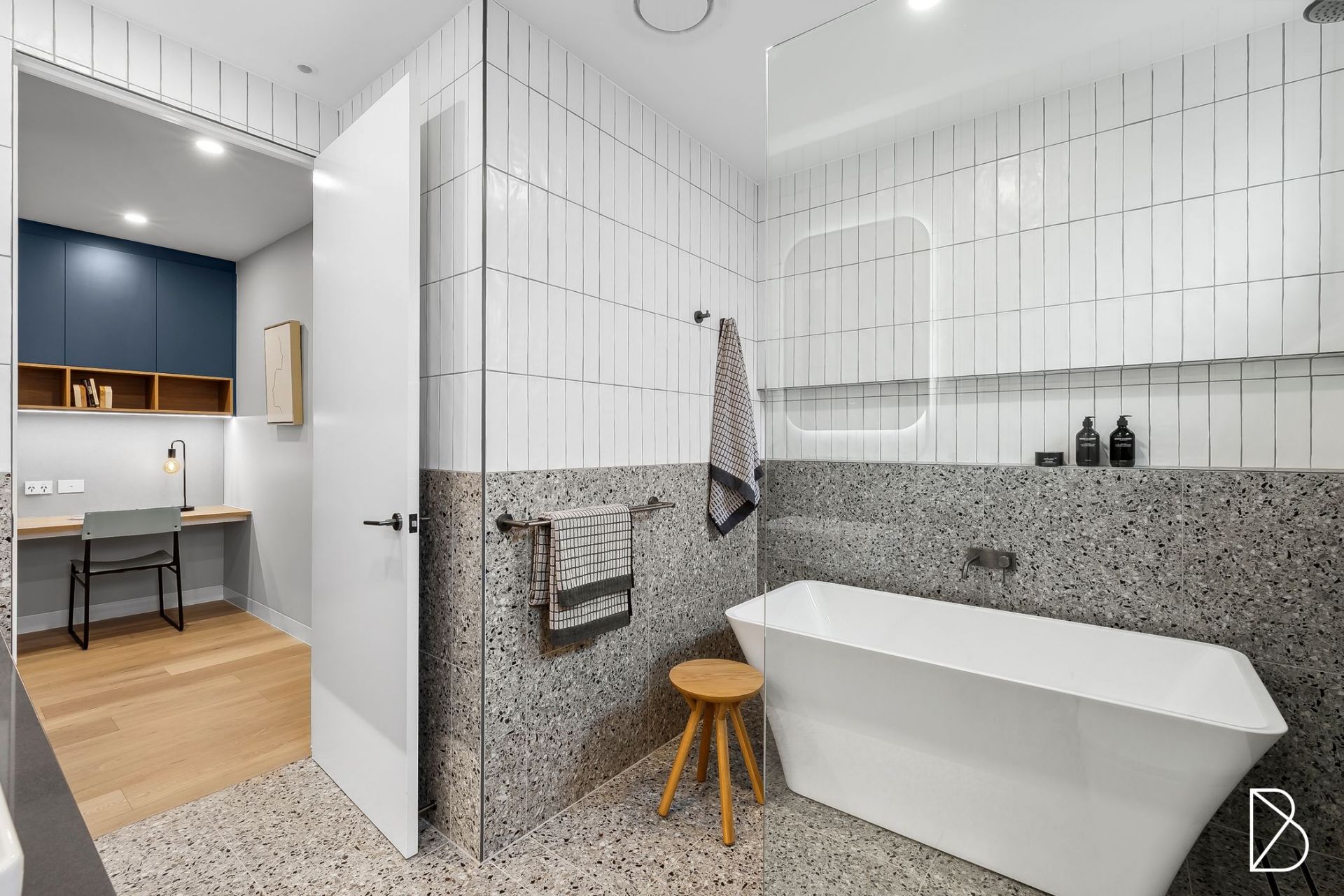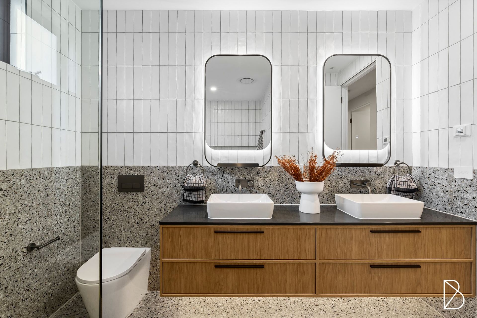 - Main bathroom also with under floor heating, chic two tone tiling, bathtub, backlit mirrors, stone top timber vanity with twin above bench basins, frameless shower and good storage + convenient separate powder room