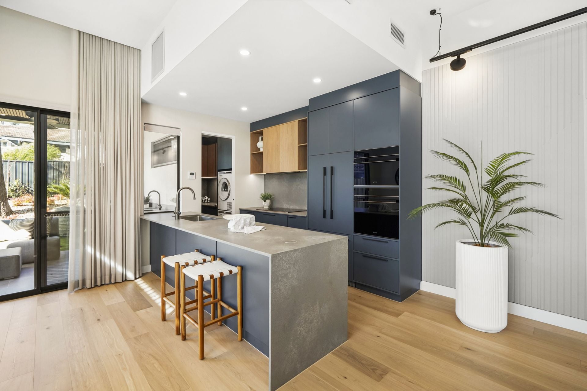 - Bespoke kitchen with Smeg appliances including pyrolytic oven, combi oven with microwave function, extra large integrated dishwasher, induction cooktop, matching rangehood and integrated Fisher and Paykel French door fridge, plus 4 in 1 zip tap with sparkling water