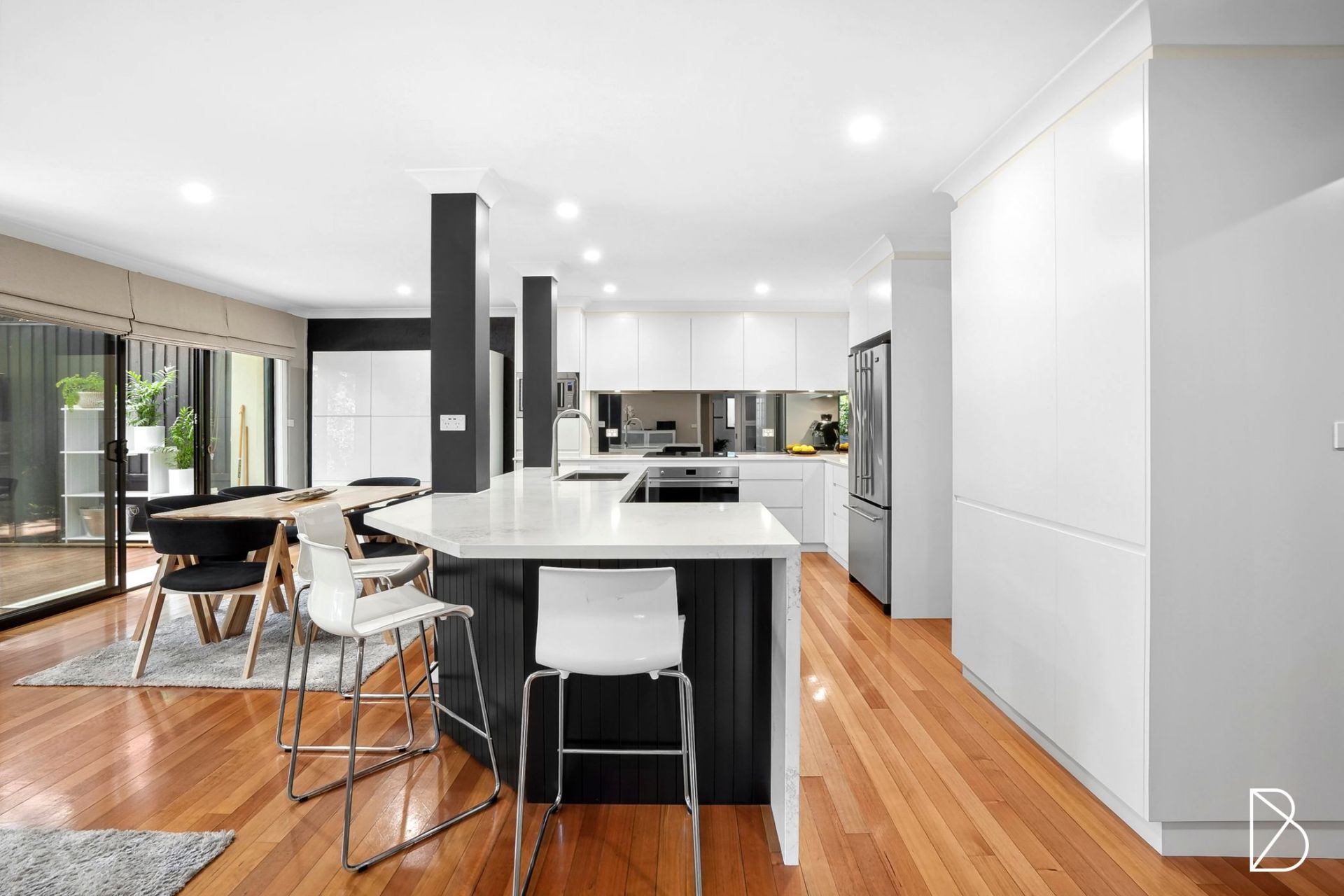 - Renovated entertainers' kitchen offering stone benchtops, waterfall edge island bench, induction cooktop, 1200mm oven, mirrored splashbacks, and plenty of storage behind quality cabinetry