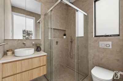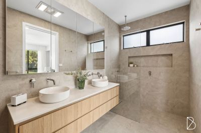 - Main suite with designer, walk in robe and ensuite, complete with floor to ceiling marble look tiling, recessed shelving, and floating stone top vanity with dual above bench basins