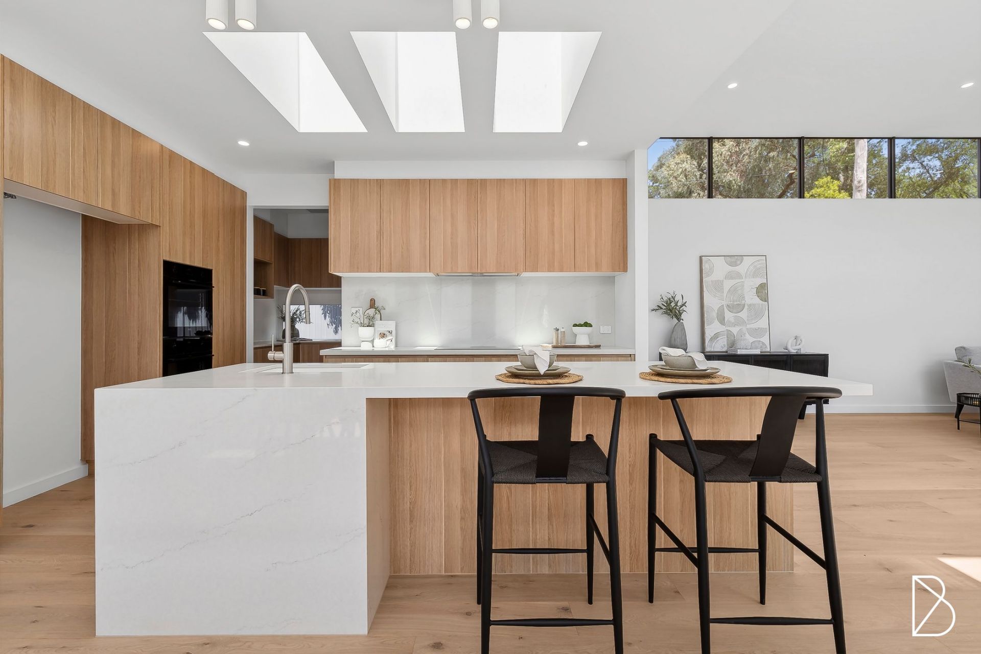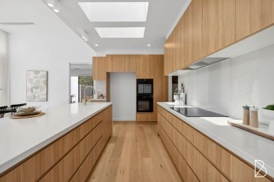 - Chefs' kitchen with butler's pantry, stone benchtops, waterfall edge eat-at kitchen island bench, induction cooktop, twin wall ovens, timber cabinetry and feature sky lighting