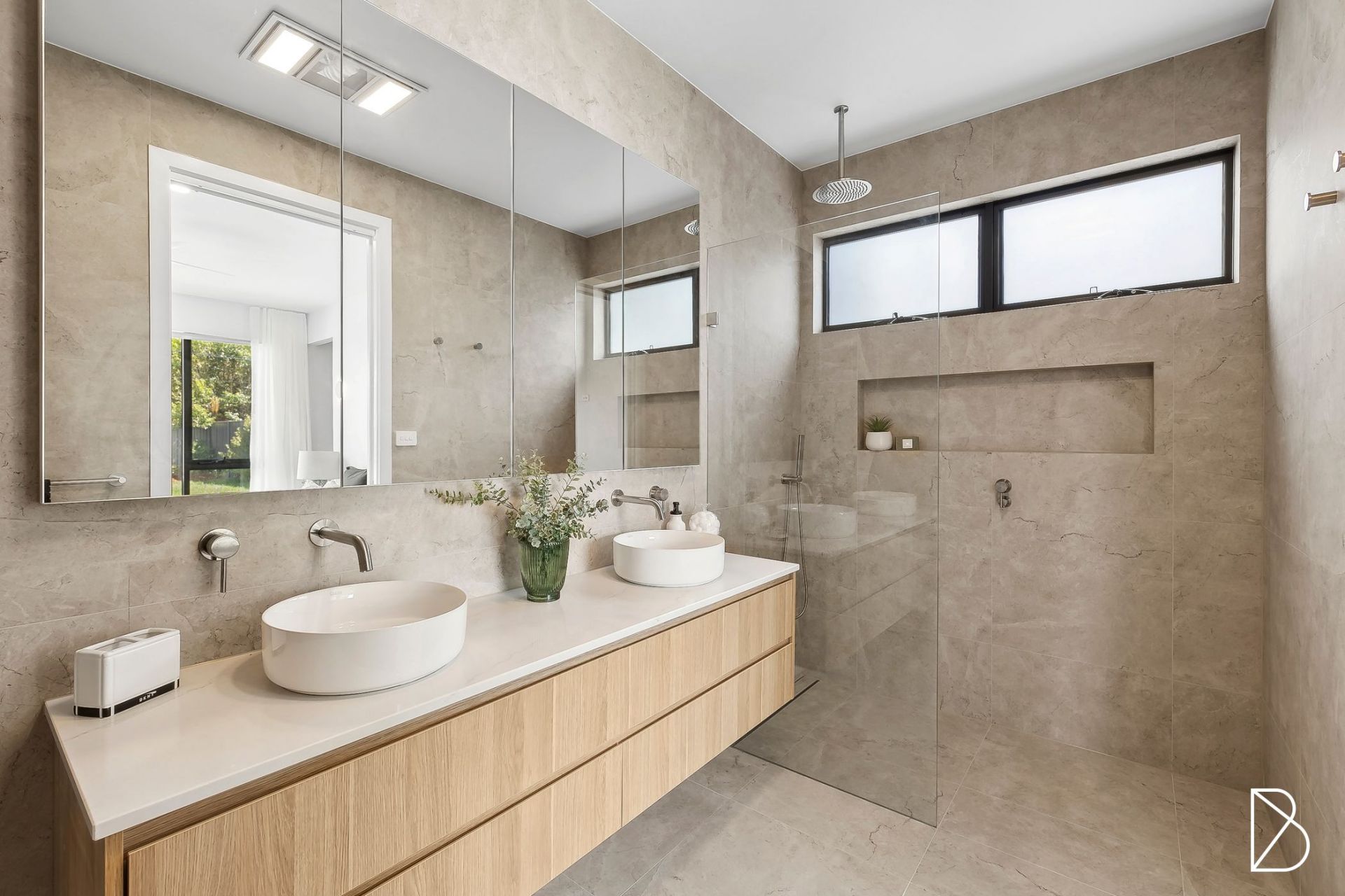 - Main bathroom enjoying oversized frameless shower with recessed shelving, freestanding bathtub, and floating timber vanity with above bench basin + 2 convenient separate powder rooms