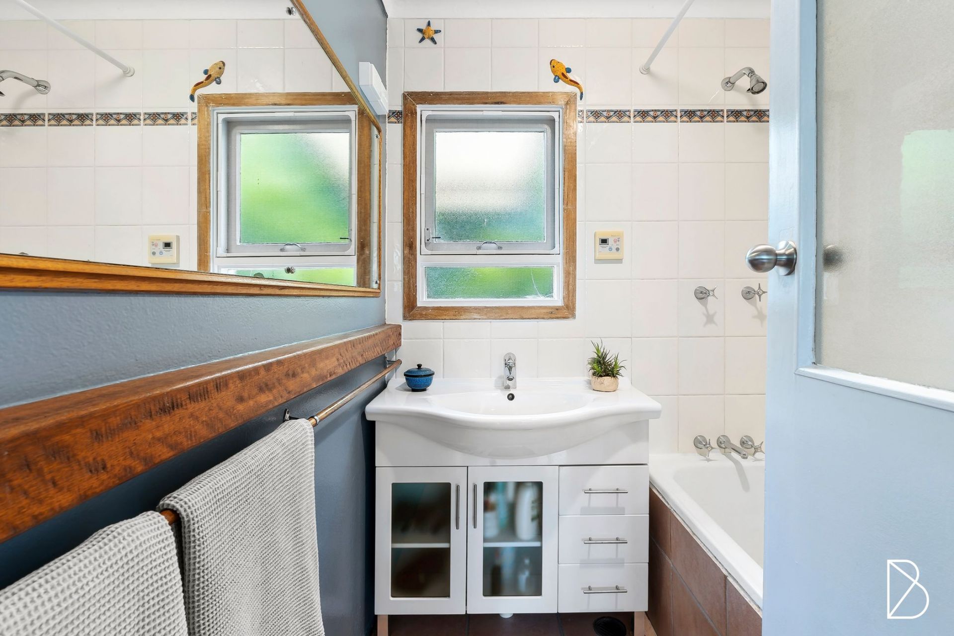 - Bathroom with bathtub, floor to ceiling tiling, timber features and free-standing vanity with good storage + convenient separate toilet