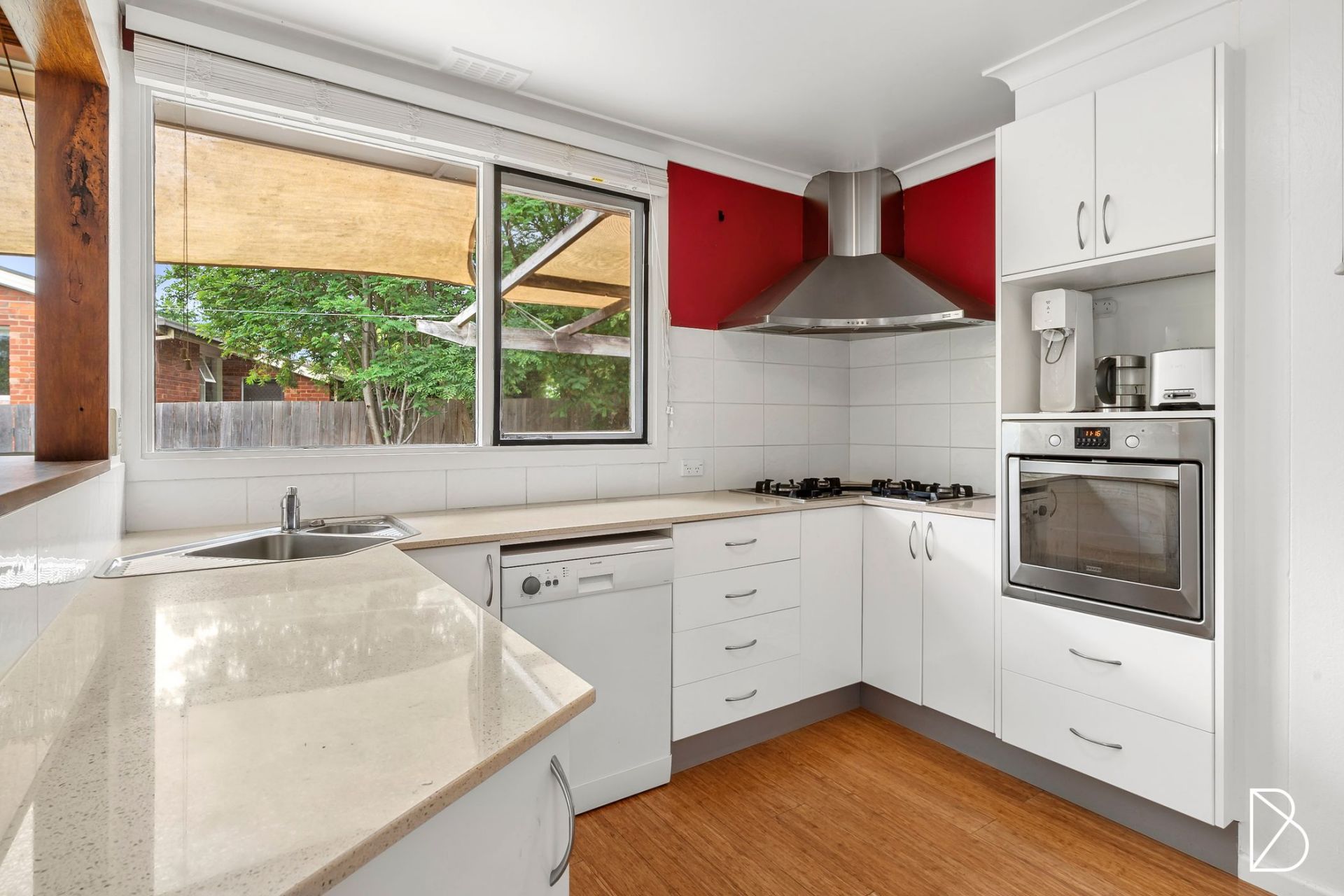 - Central kitchen offering stone benchtops, servery window, gas hob, wall oven, tiled splashback and plenty of storage throughout