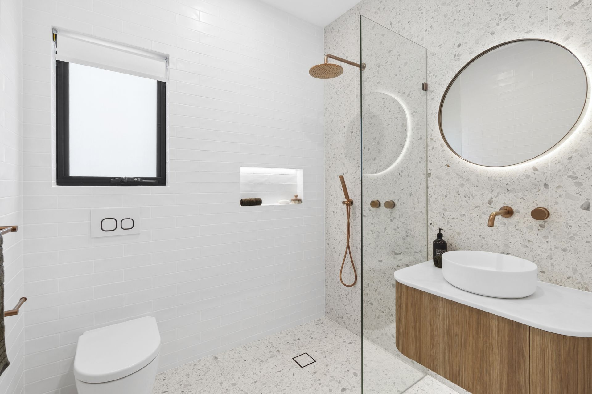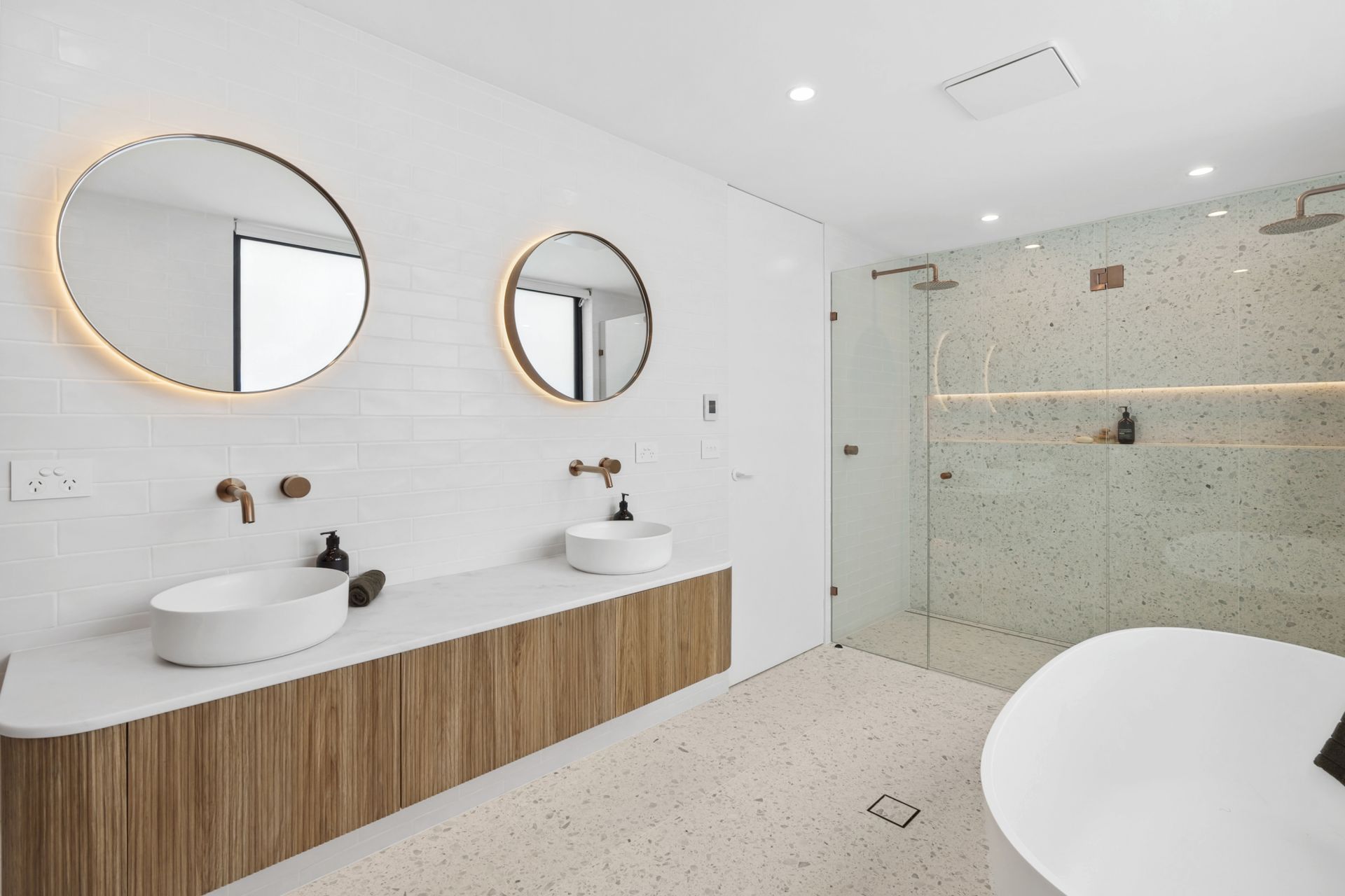 • Main upstairs bathroom featuring bathtub, and same quality features such as ABI brushed copper finishes and fixtures, floor to ceiling tiling, floating timber vanity with above bench basin, Terrazzo floor tiles with under floor heating + separate upstairs and downstairs powder rooms