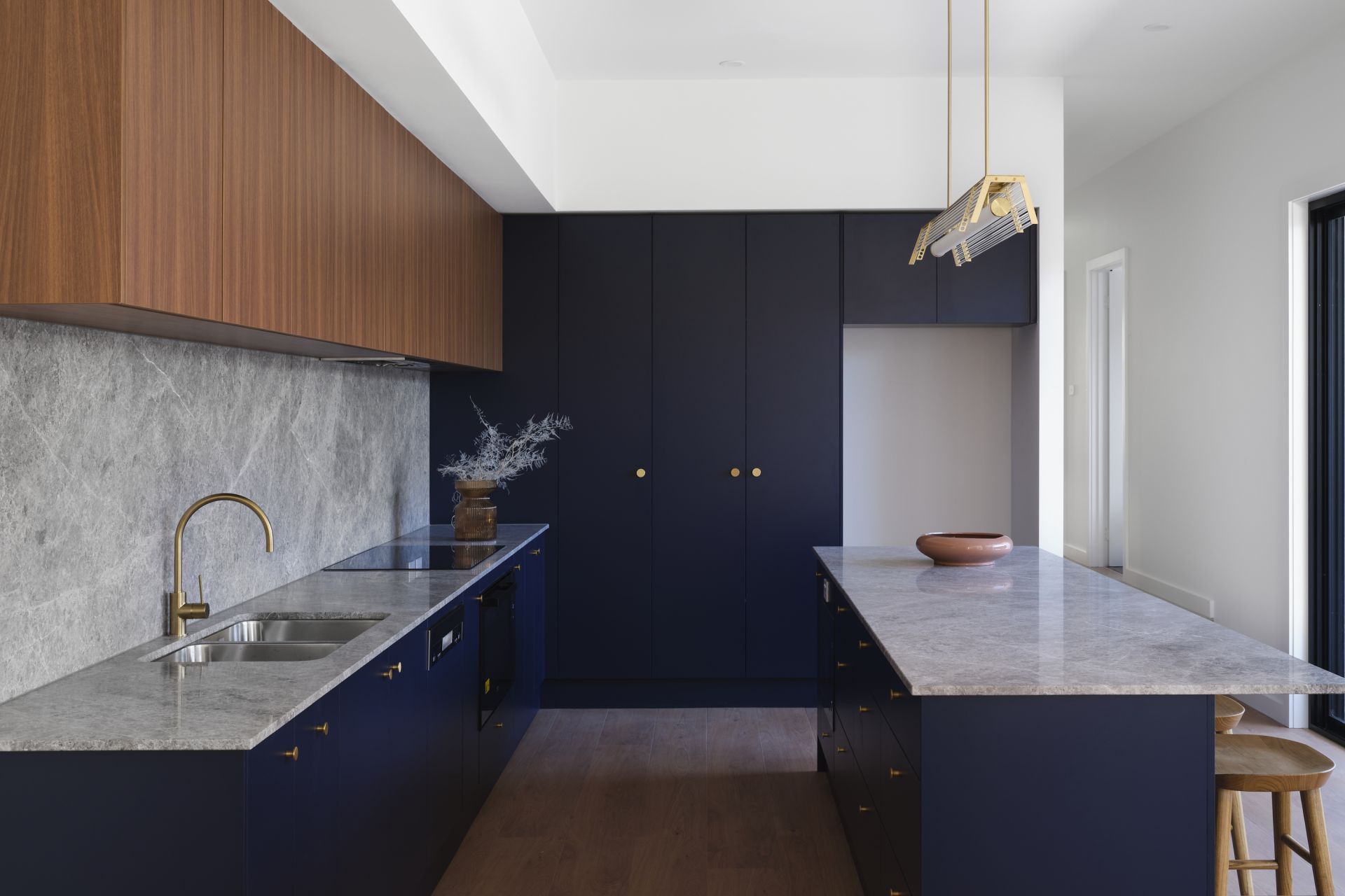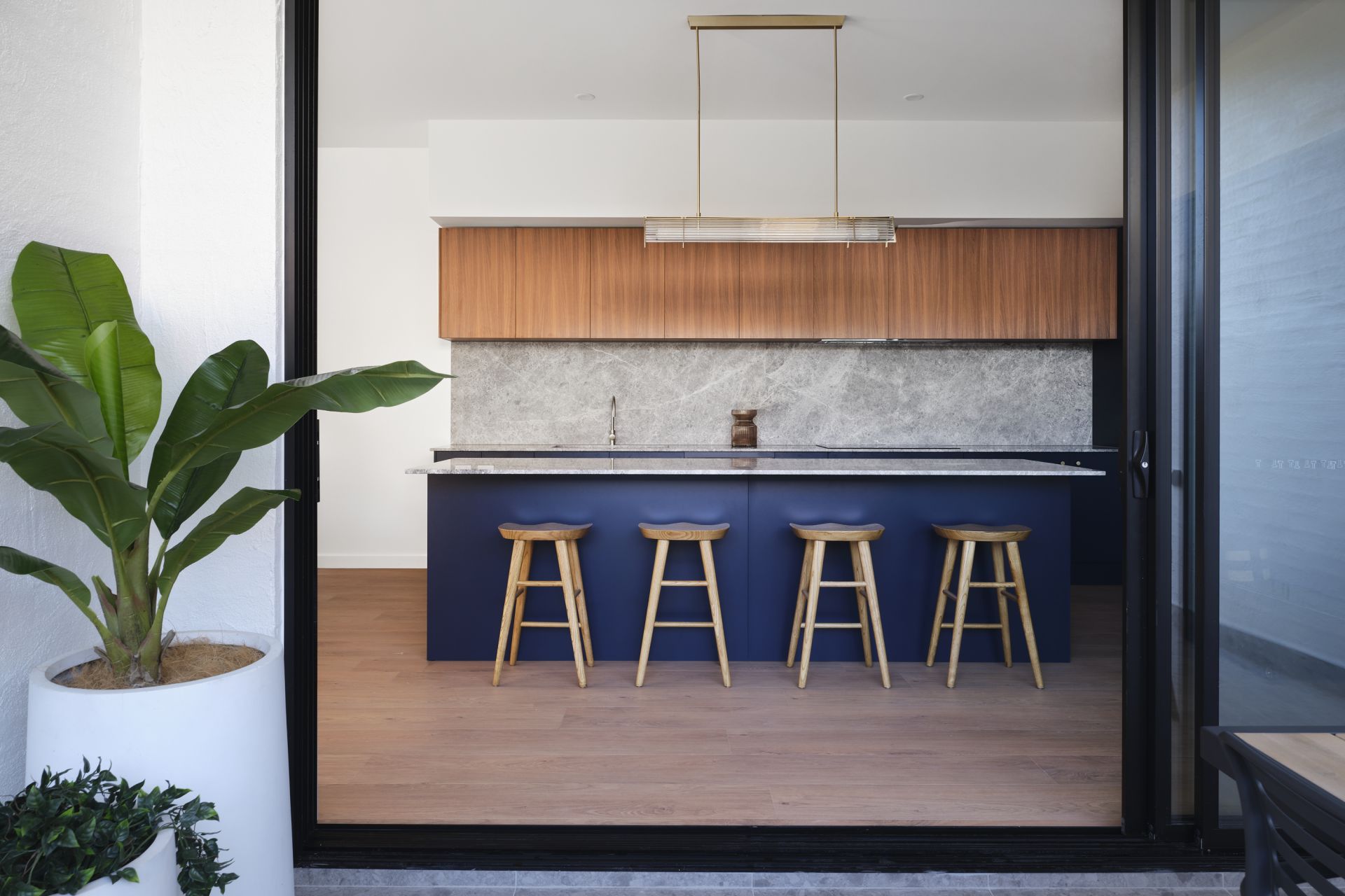 - modern kitchen with breakfast bar and marble stone benchtops