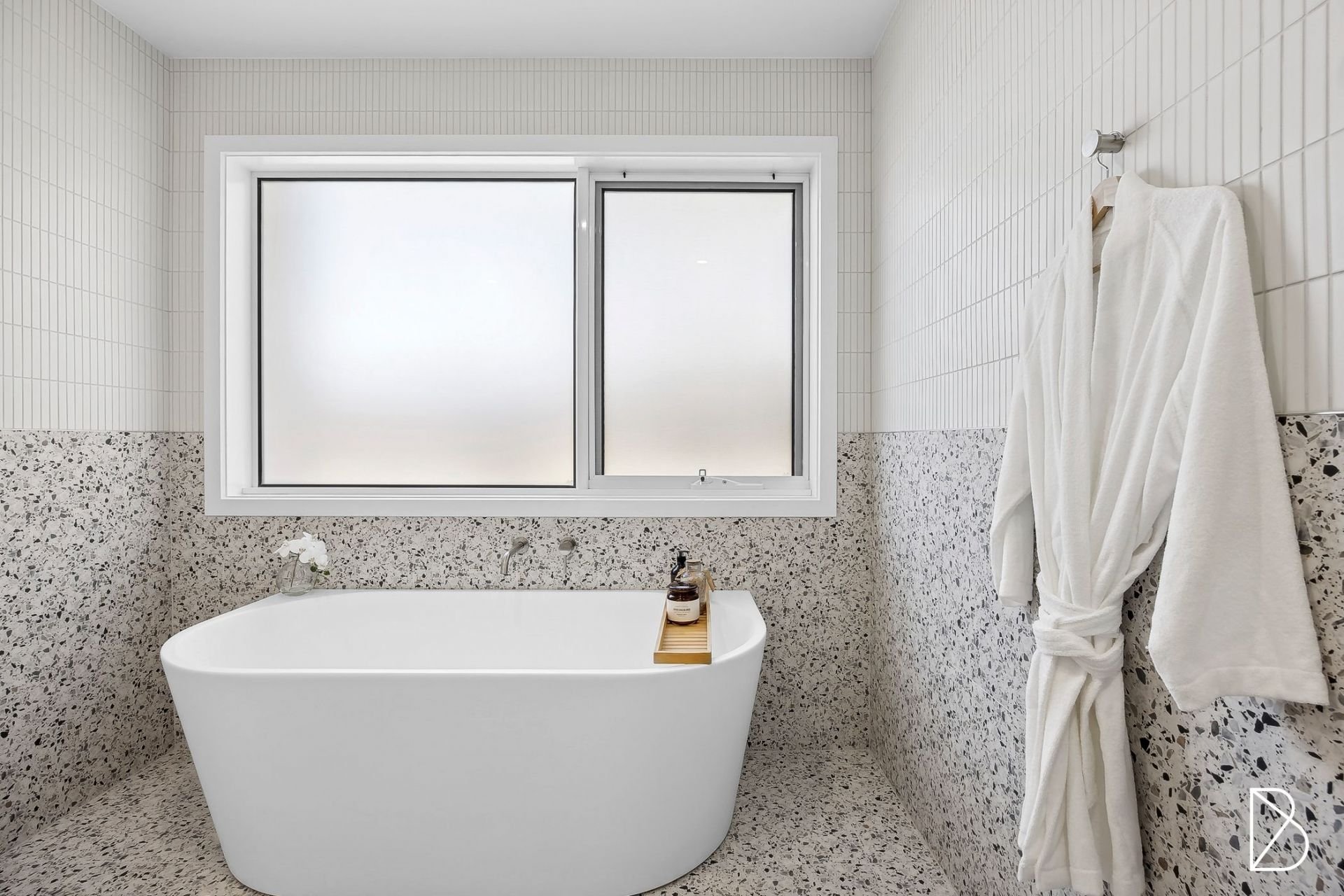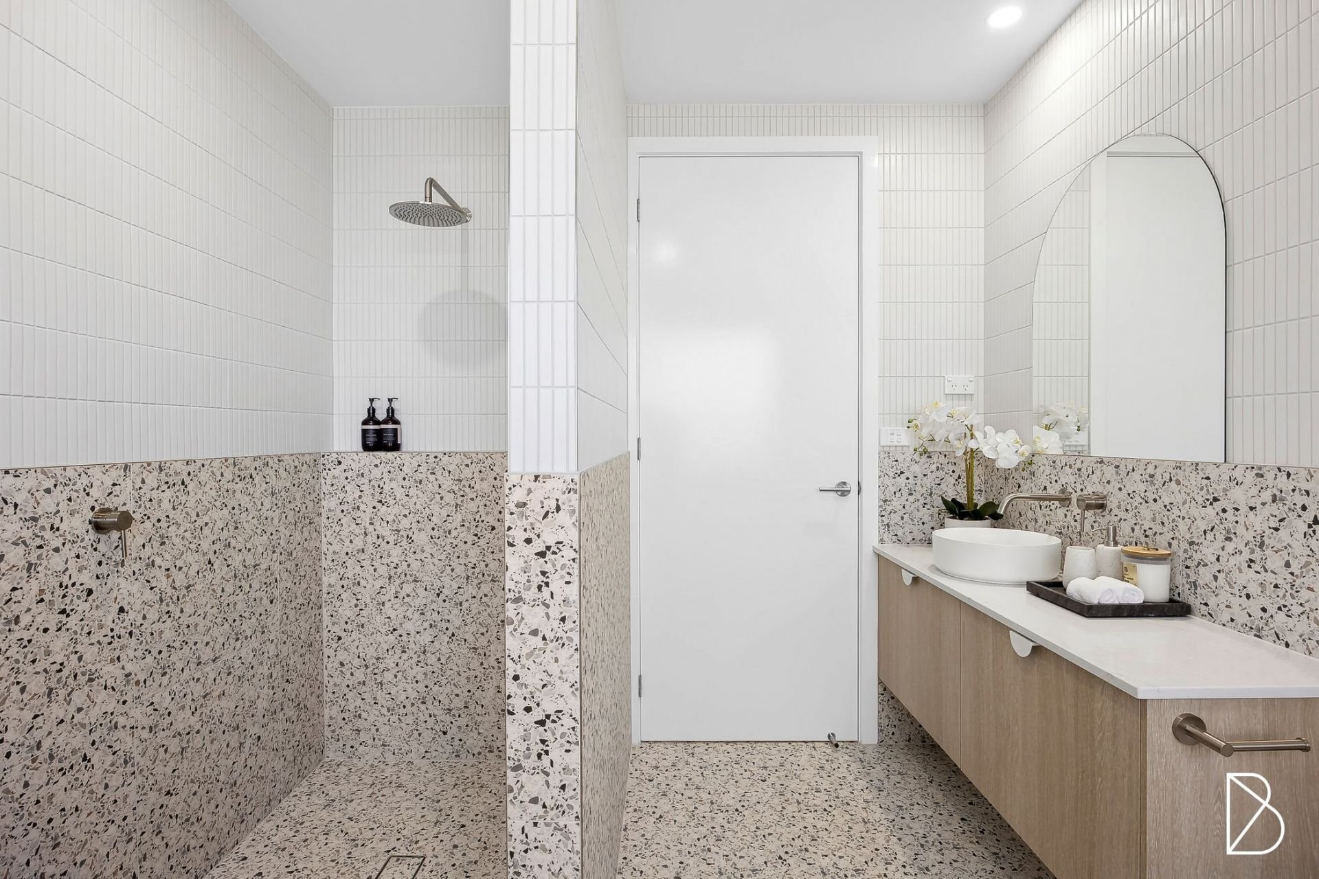 - Main bathroom with full size bath tub, chic tiling design, frameless shower, recessed shelving, and floating timber vanity with stone top.