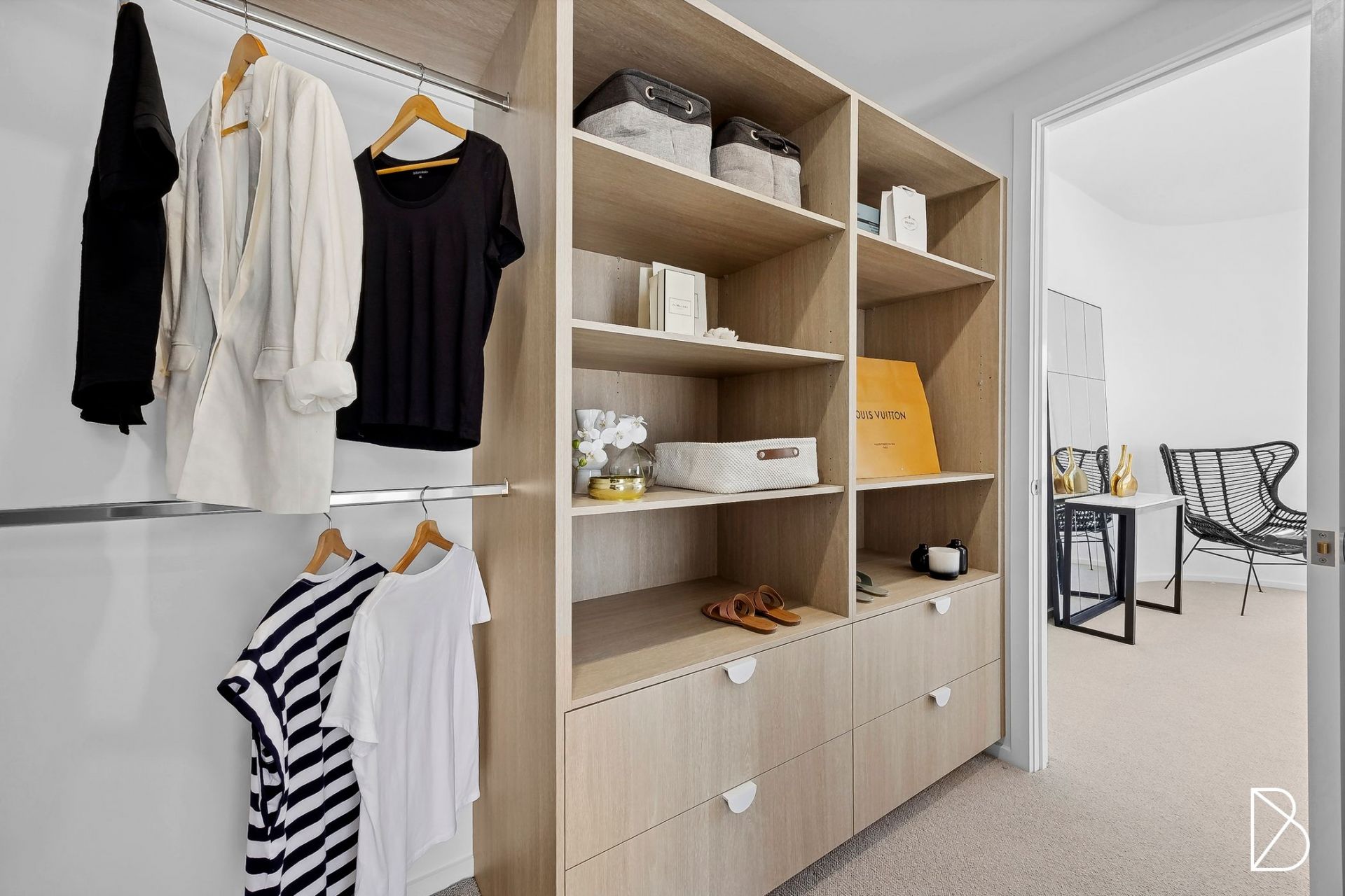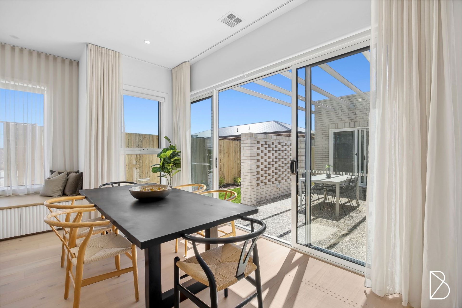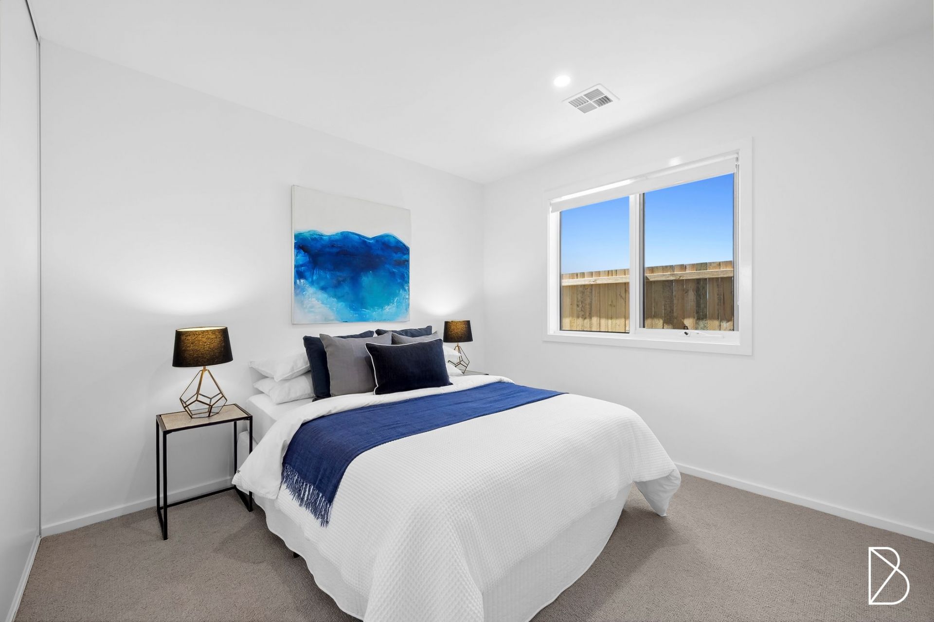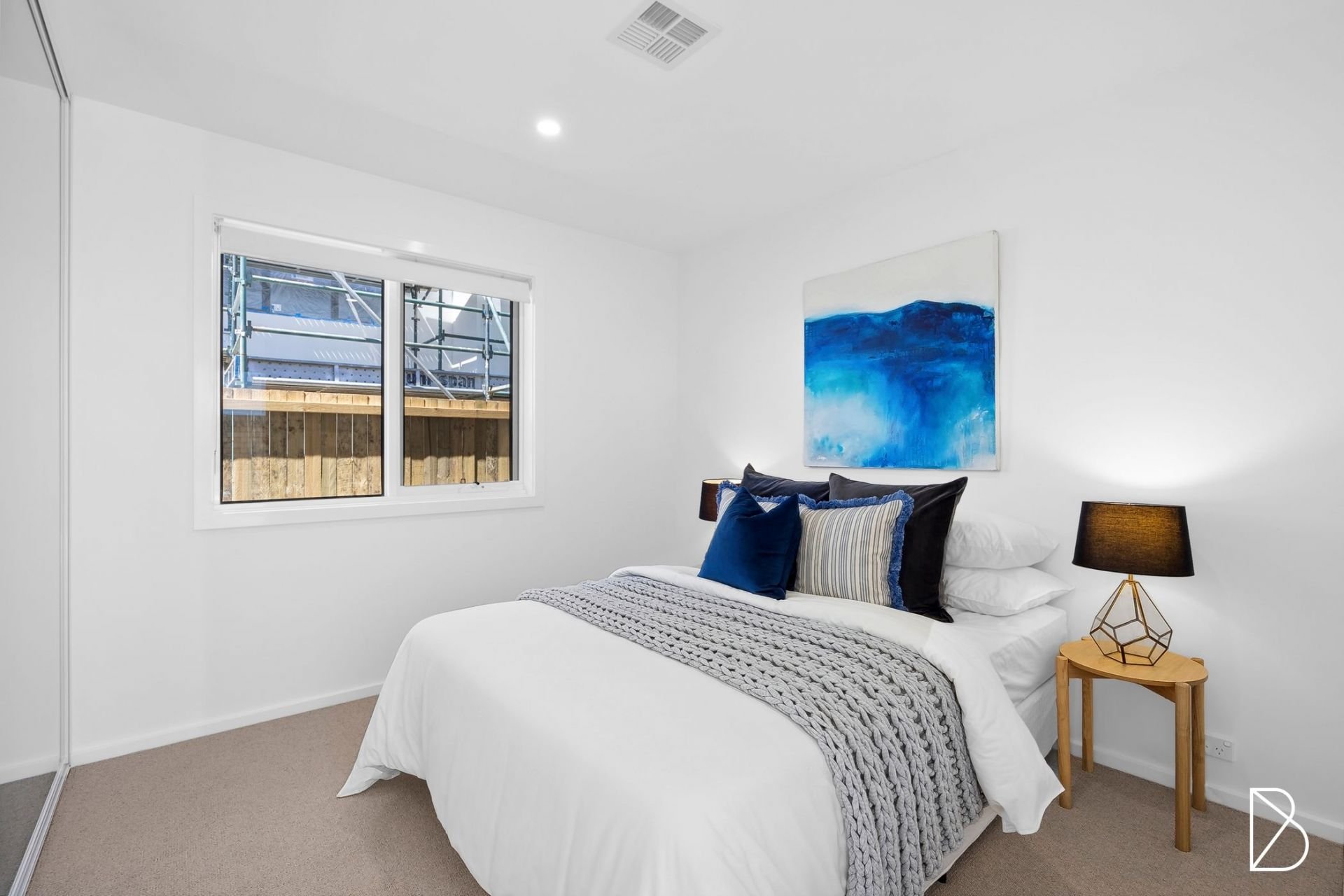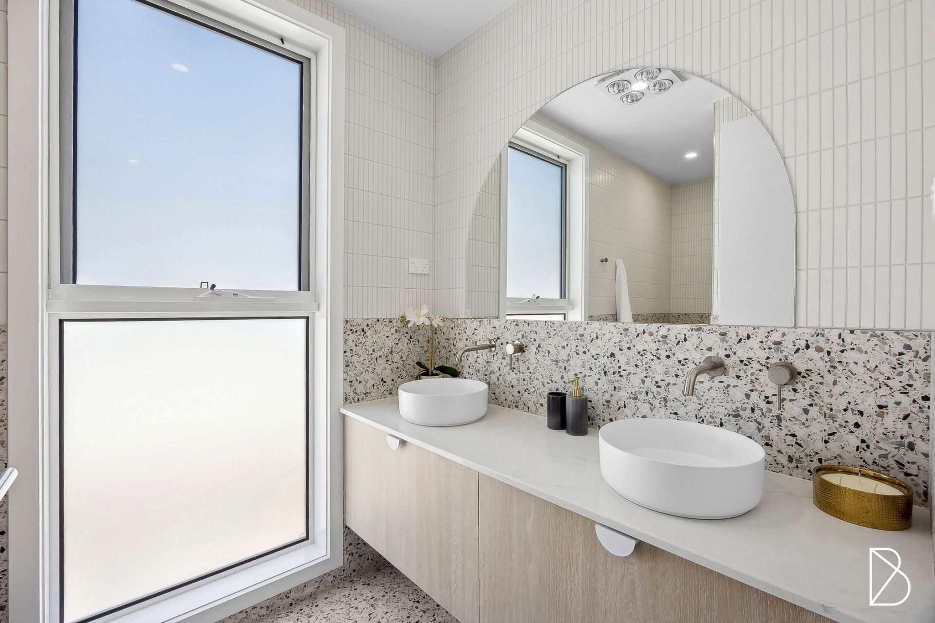 - Main suite with walk in robe and chic ensuite, offering unique floor to ceiling tiling and floating stone top timber vanity with twin above bench basins + 2 additional bedrooms, both with built ins