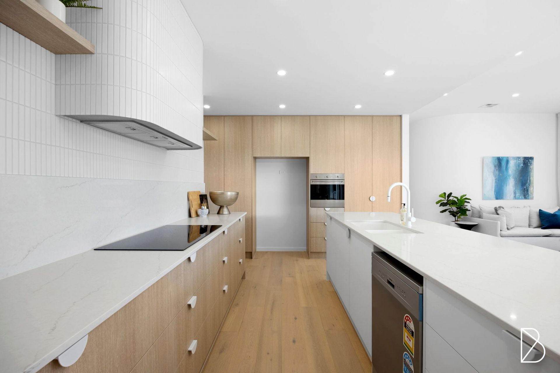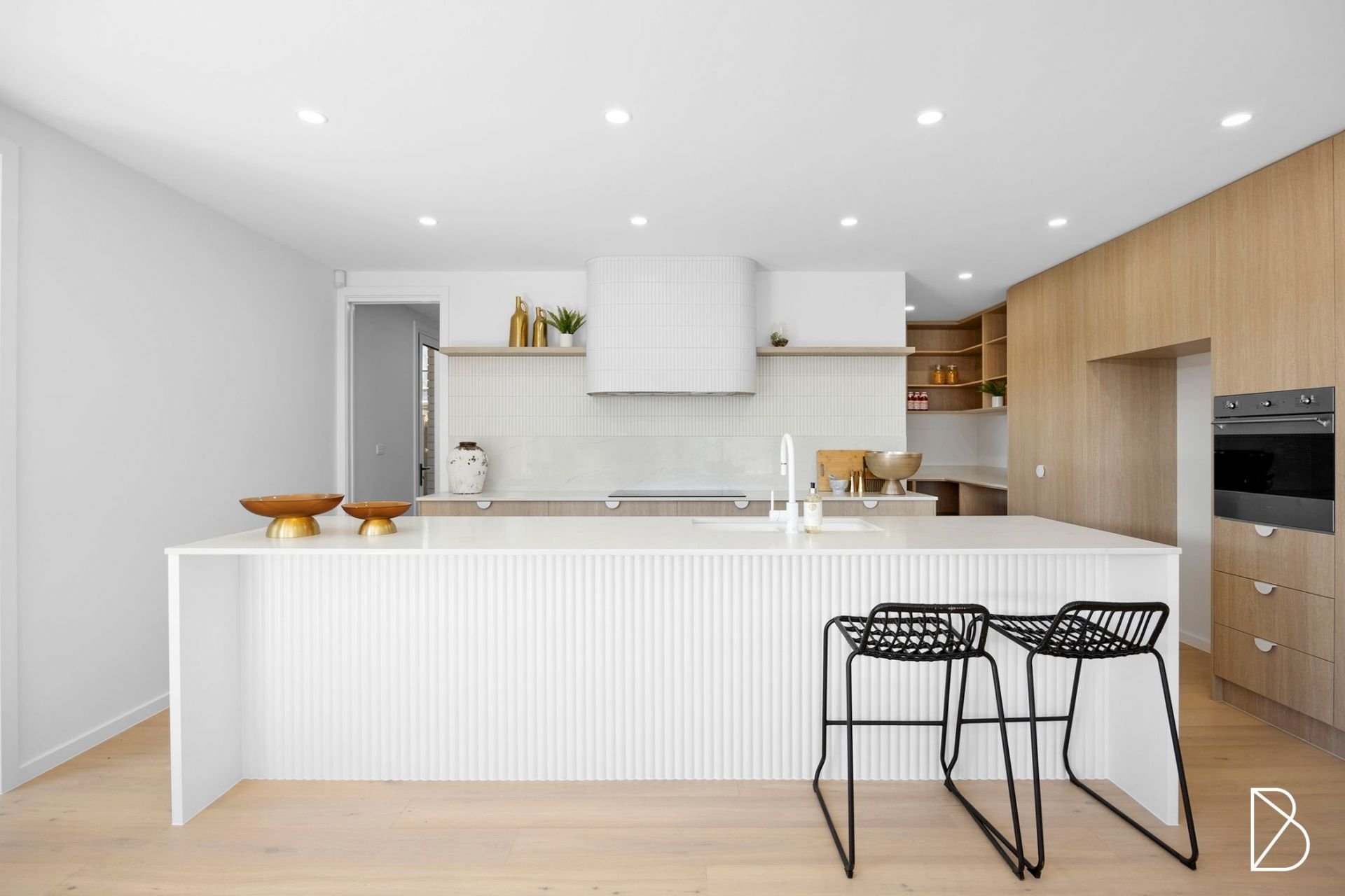 - Designer kitchen offering stone benchtops, eat at island bench, walk in pantry, all electric cooking, tiled splashbacks, and plenty of storage behind bespoke cabinetry