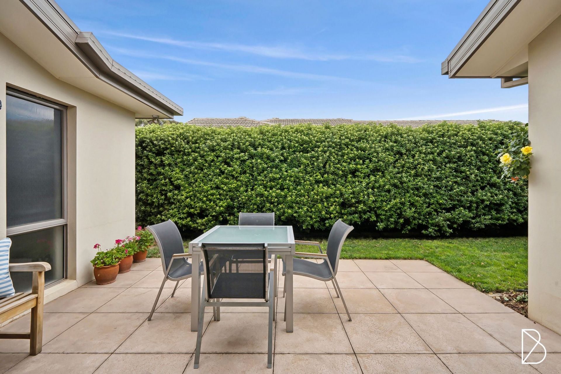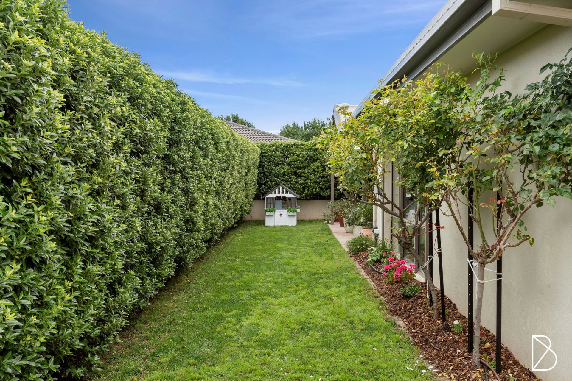 - private rear yard with large established hedges