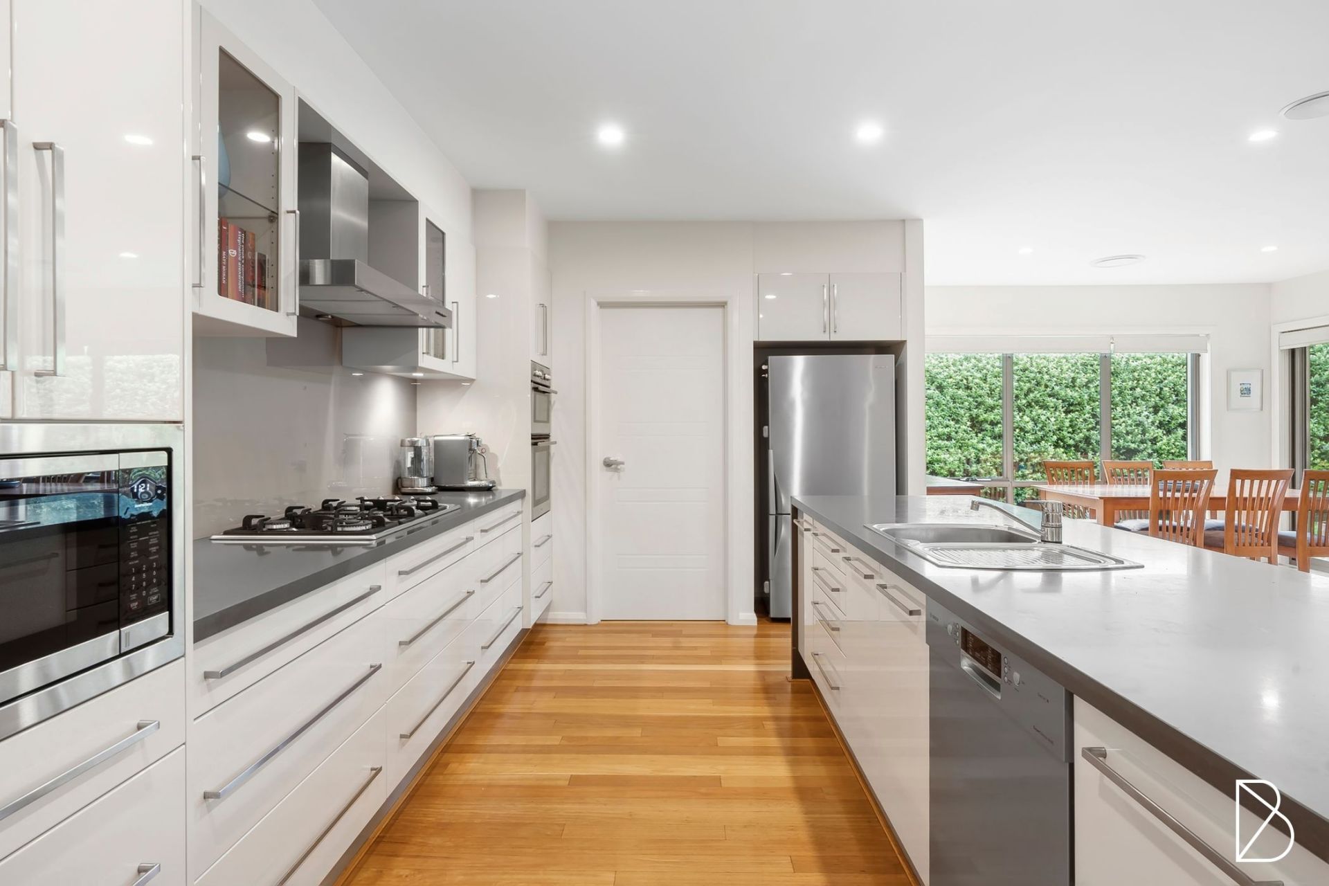 - well appointed kitchen with large stone island bench, walk-in pantry and five burner gas cooktop