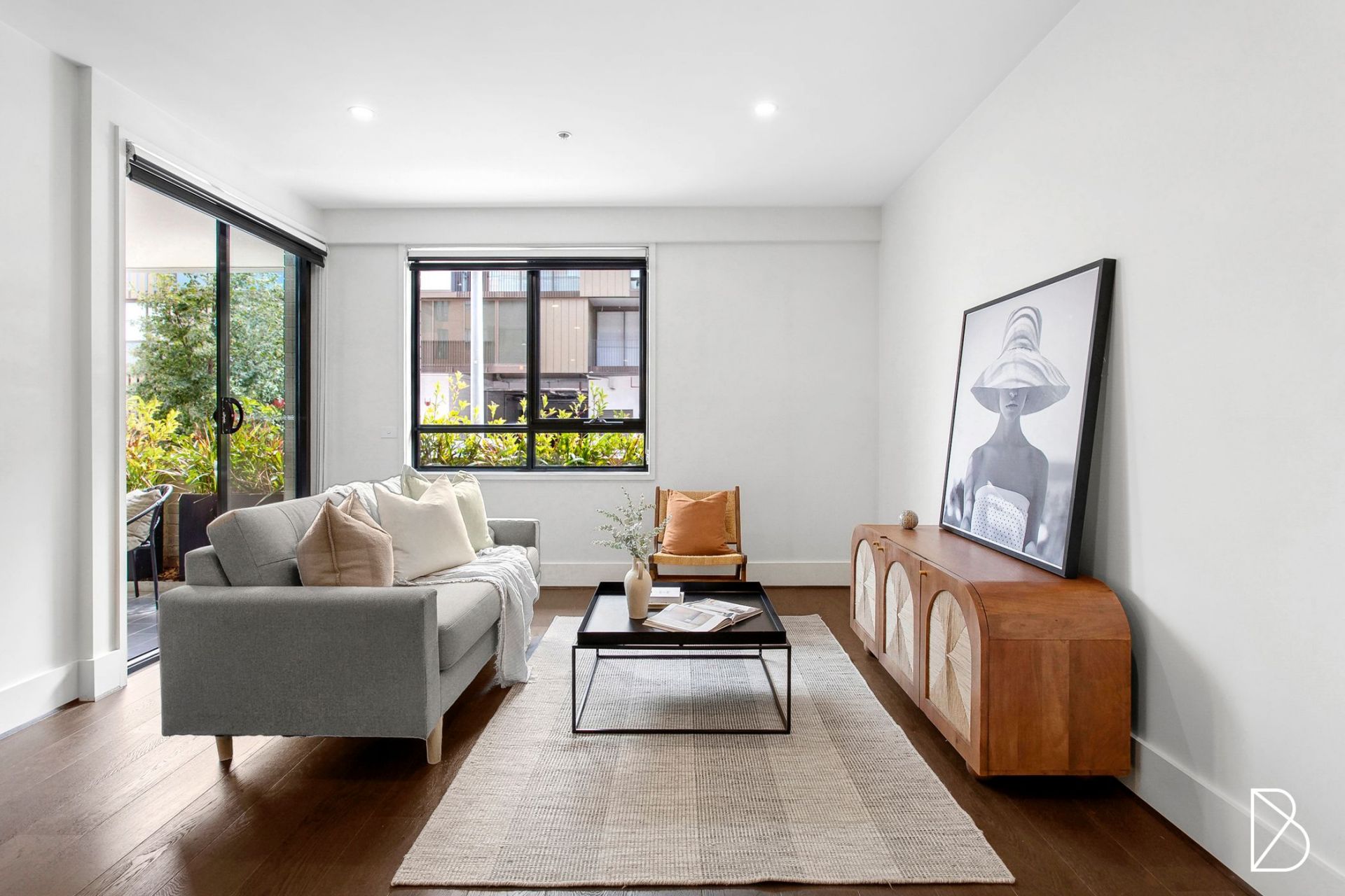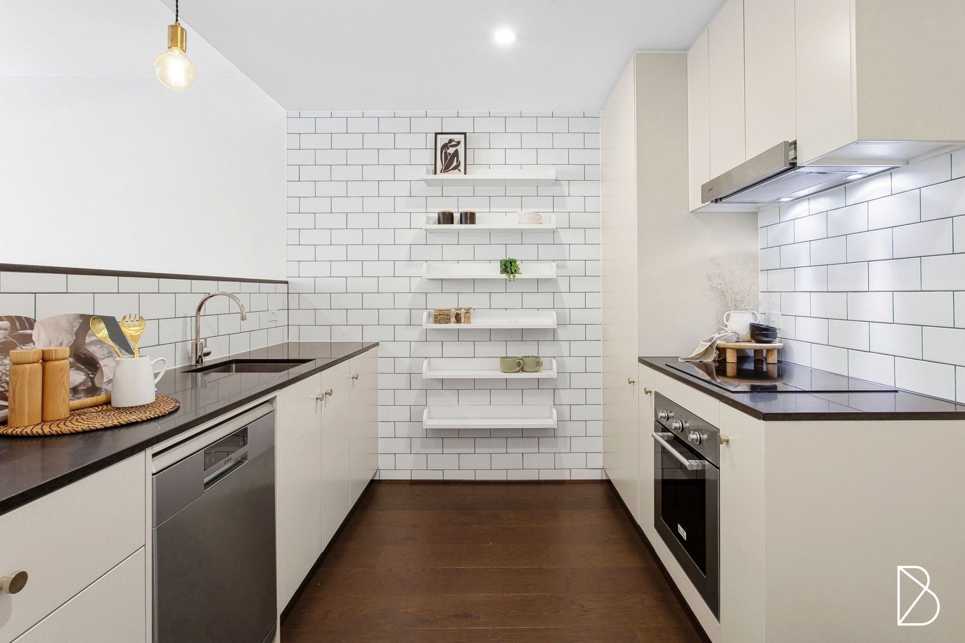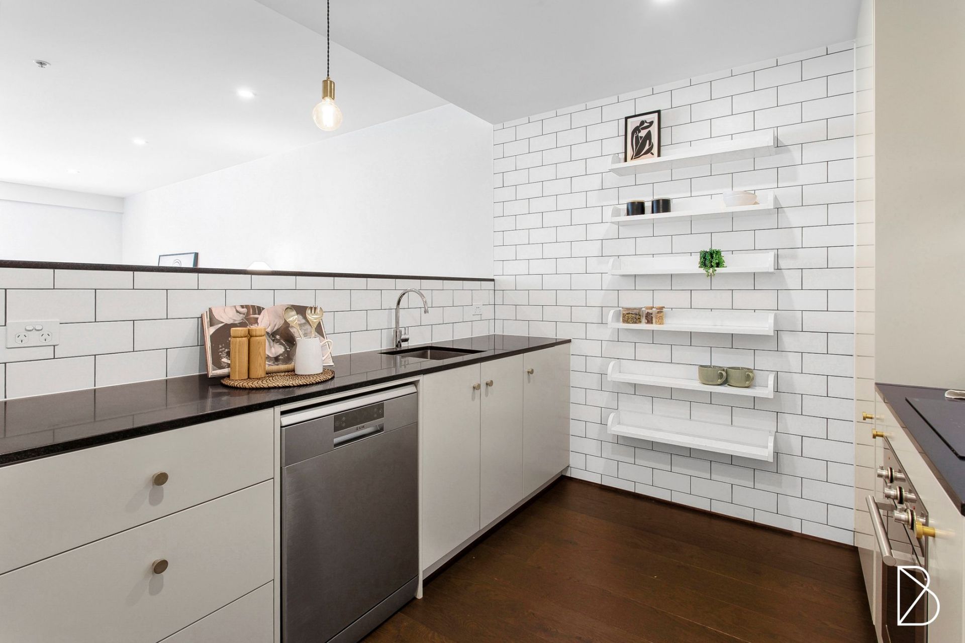 Spanning 69 sqm, the apartment is filled with natural light thanks to its north-facing orientation and large double-glazed windows. The open-plan living space features beautiful engineered oak flooring, while the sleek, modern kitchen is equipped with stone bench tops and high-end appliances, including a 600mm induction cooktop, oven, and range hood. The bathroom is complete with chic New York subway tiles.