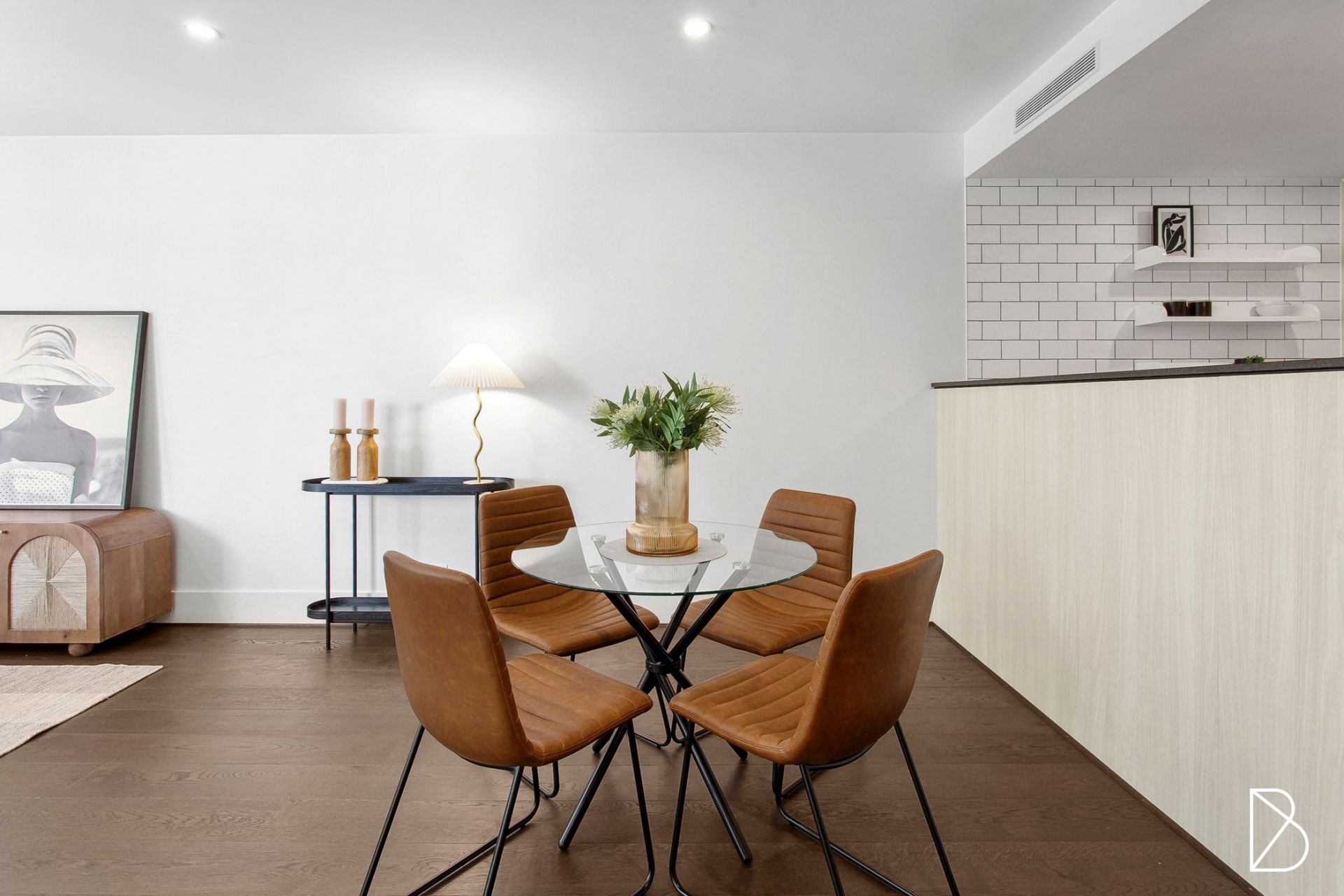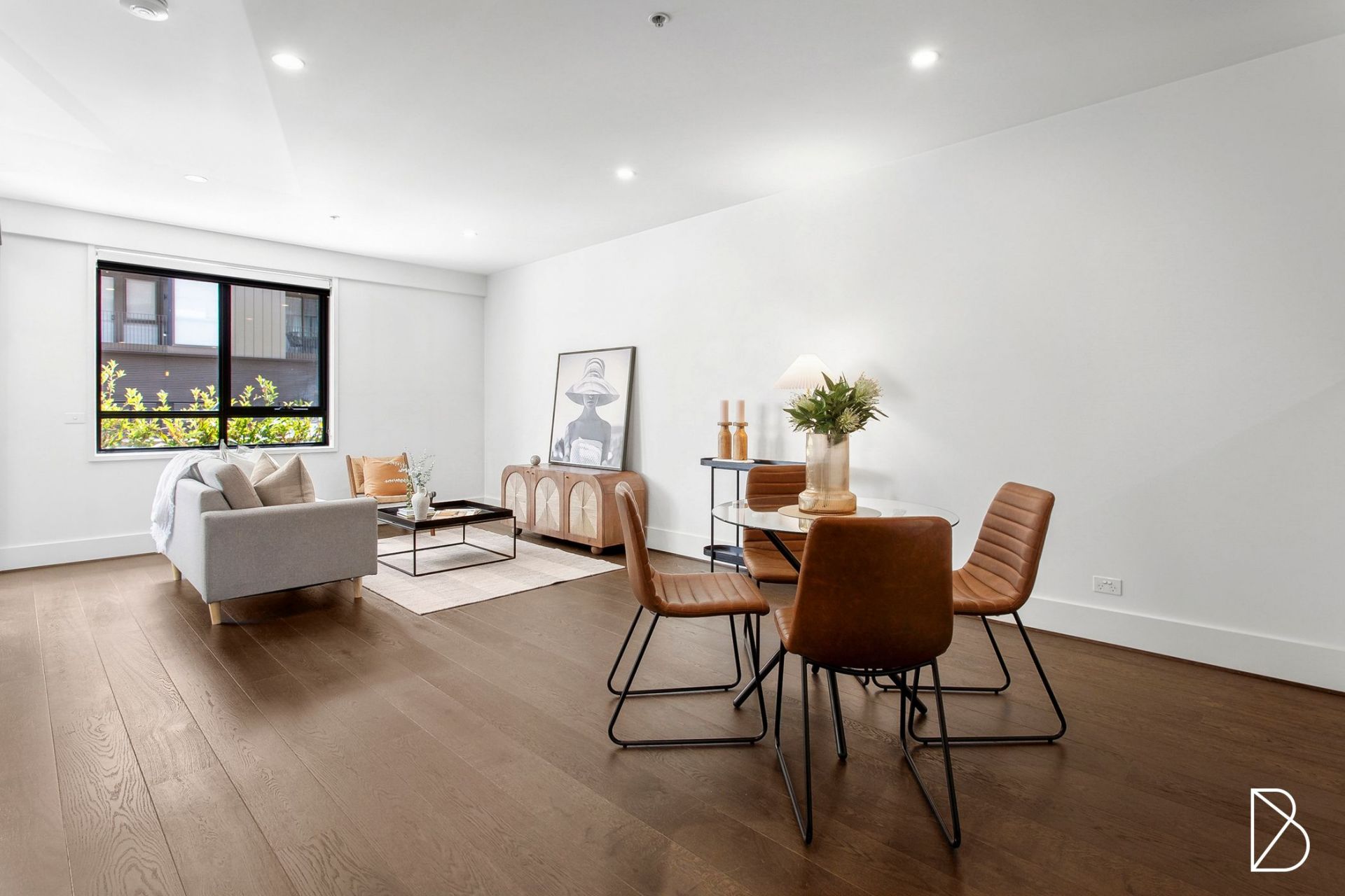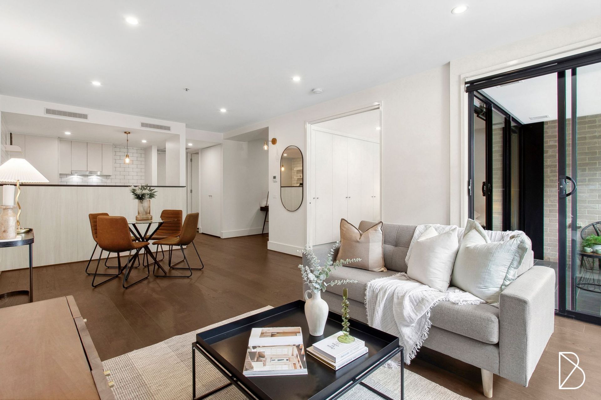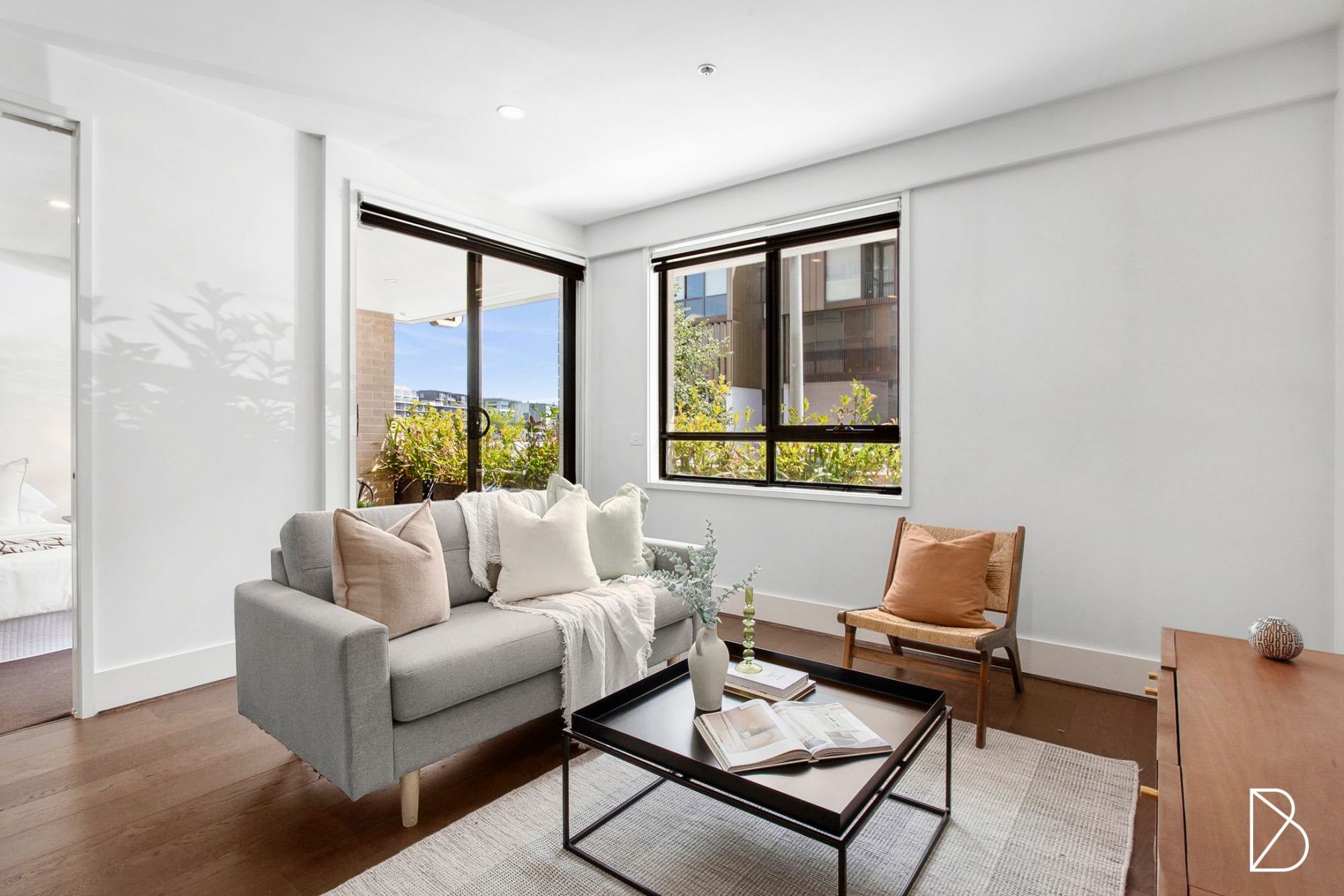 Spanning 69 sqm, the apartment is filled with natural light thanks to its north-facing orientation and large double-glazed windows. The open-plan living space features beautiful engineered oak flooring, while the sleek, modern kitchen is equipped with stone bench tops and high-end appliances, including a 600mm induction cooktop, oven, and range hood. The bathroom is complete with chic New York subway tiles.