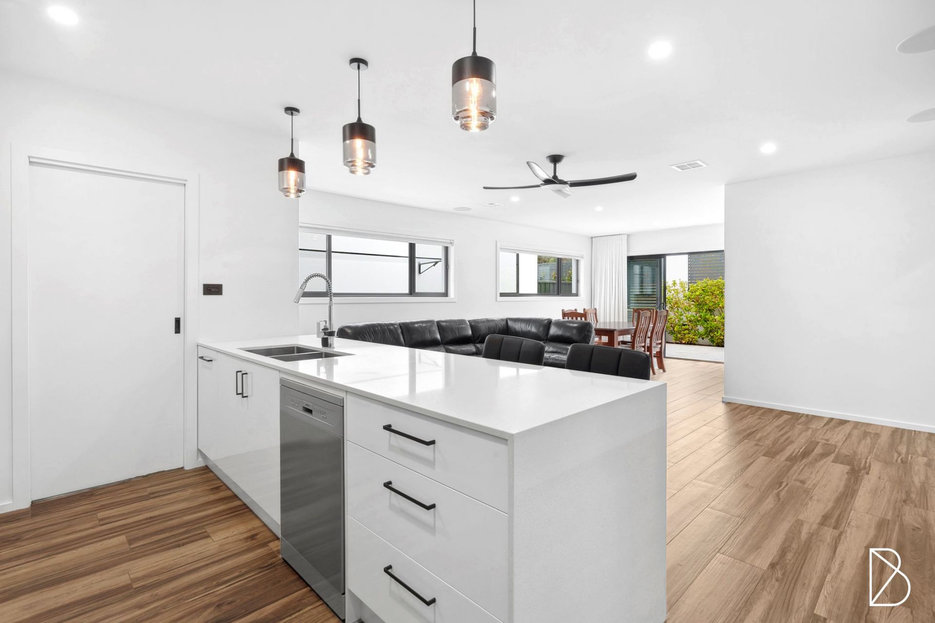 - Sleek kitchen offering stylish pendant lighting, mirrored splashback, stone benchtops, waterfall edge breakfast bar, 5-burner gas hob, 1200mm oven, dishwasher, and plenty of storage throughout