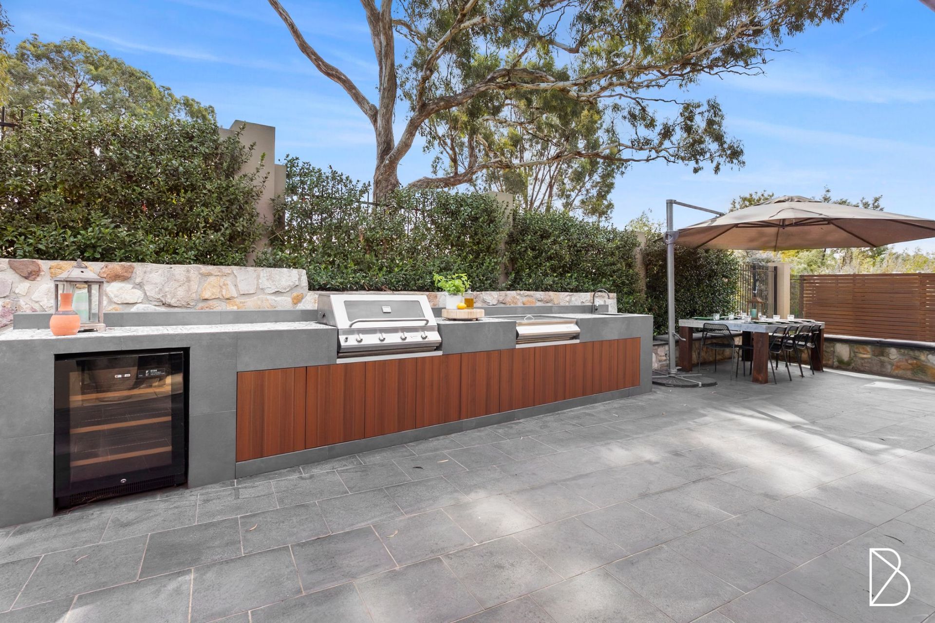 - Integrated outdoor kitchen with gas barbeque, charcoal barbeque, built in sink and Vintec drinks fridge