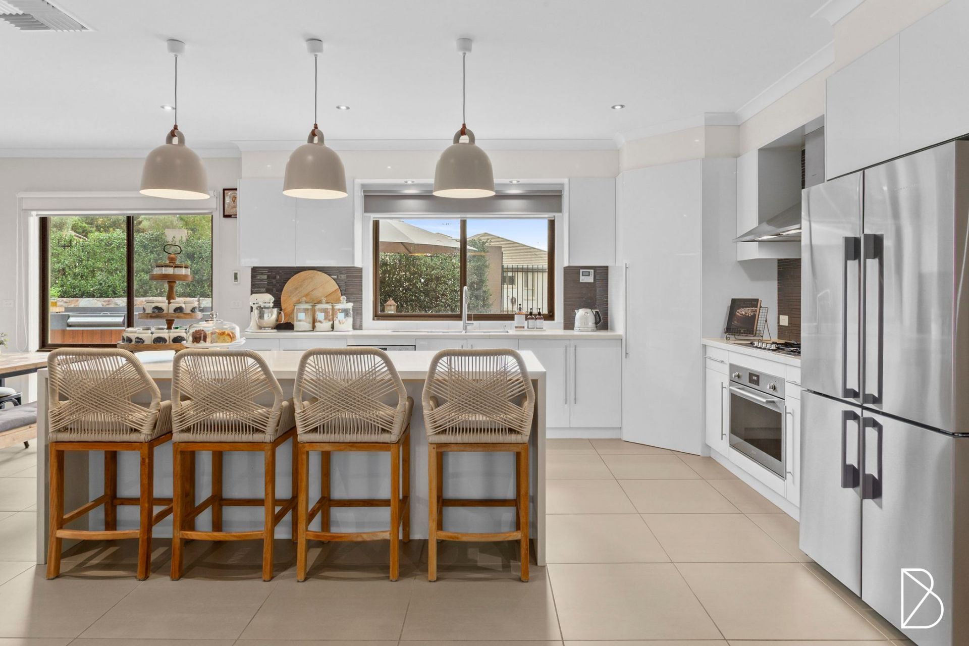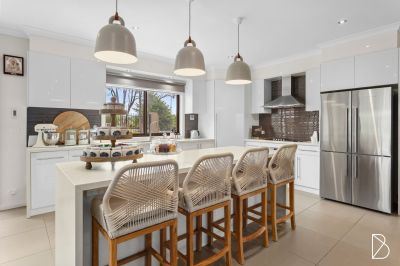 - Central entertainers' kitchen offering 40mm stone benchtops, waterfall edge kitchen island, gas cooktop and electric oven, chic tiled splashbacks, pendant lighting, and plenty of storage throughout