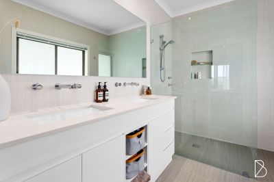 The luxurious main suite offers a walk-in robe and a resort-style ensuite featuring a twin basin stone-top vanity, floor-to-ceiling tiling with recessed shelving and a frameless shower, providing the ultimate retreat. Upstairs, you'll find three additional bedrooms, each with built-in robes, while the versatile fifth bedroom or study is conveniently located downstairs. The main bathroom includes a bathtub, frameless shower, and twin basin vanity with ample storage, complemented by a convenient powder room on the lower level. The large internal laundry offers side access for added practicality, and the oversized double lock-up garage features a workshop space with internal entry, combining style, comfort, and functionality throughout the home.