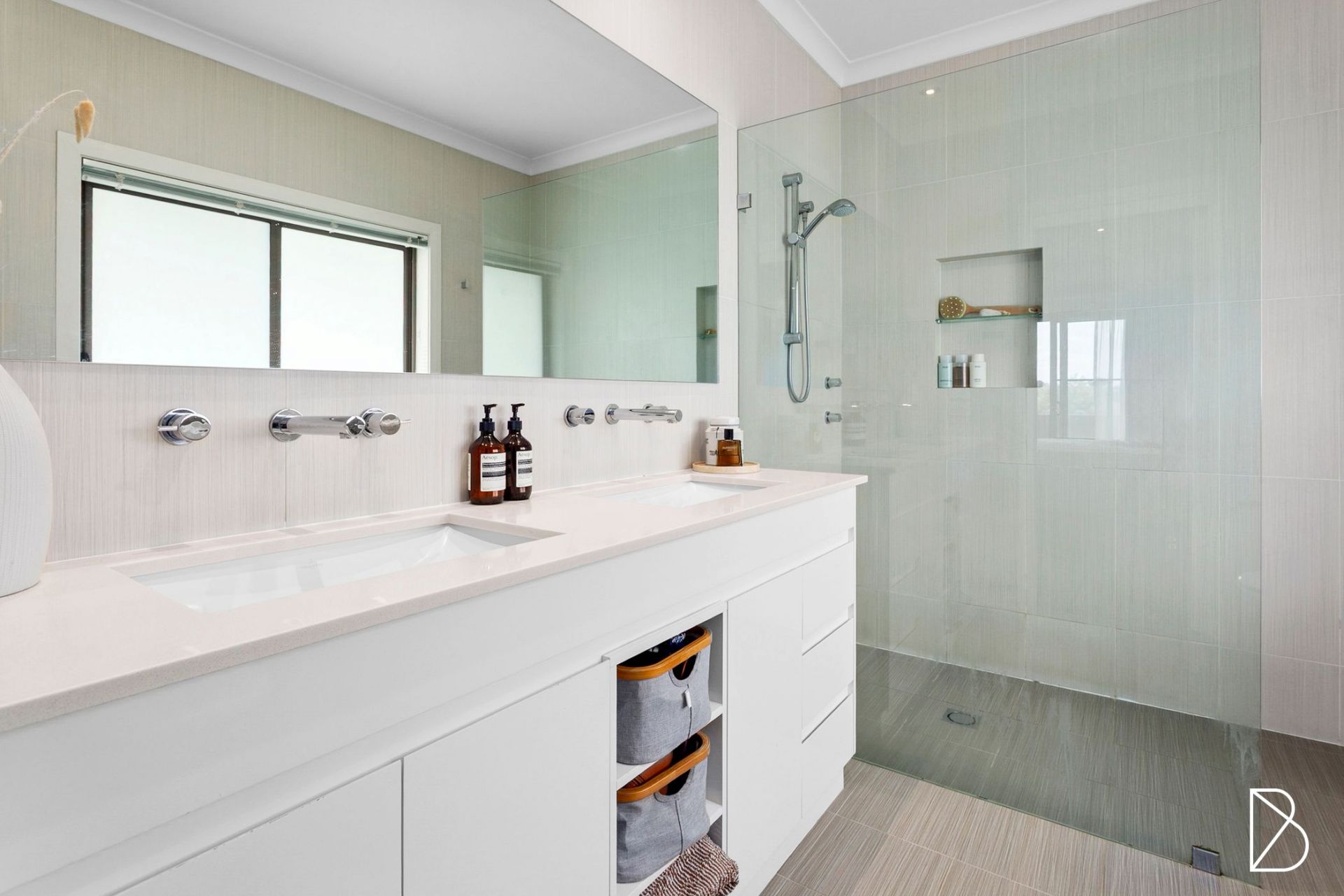 - Main bathroom with Astra Walker designer tapware, bathtub, frameless shower and twin basin vanity with good storage + convenient downstairs powder room