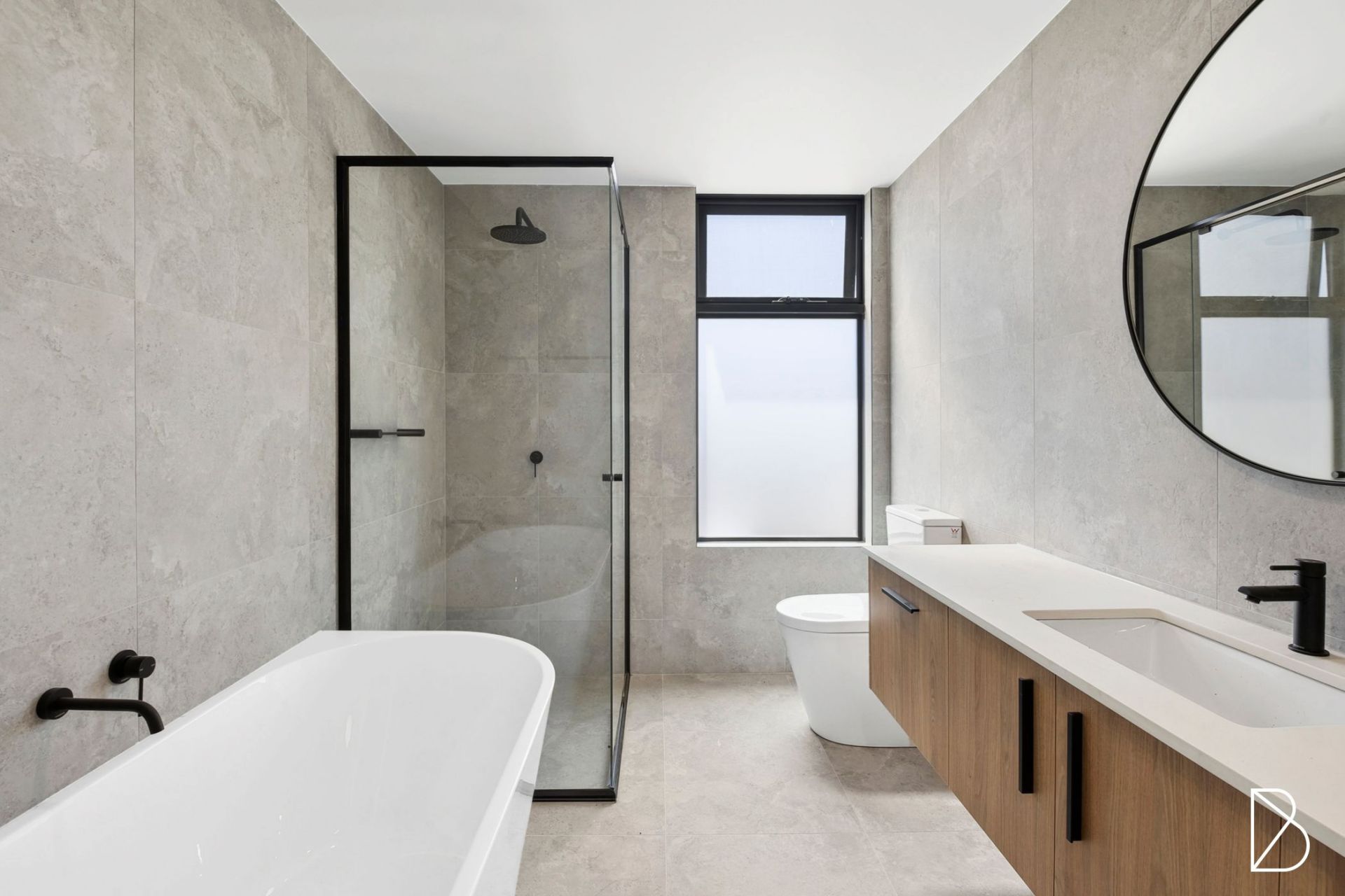 The ground level master suite is a luxurious retreat, complete with a built-in wardrobe and large ensuite. The ensuite boasts floor-to-ceiling tiling and a stunning floating timber vanity with twin above-bench basins, offering both elegance and practicality. Upstairs you'll find the spacious study area adds to the home's versatility, plus two additional generously sized bedrooms, all with built-in robes. The main bathroom on the upper level is designed to impress, featuring a freestanding bathtub and designer floor-to-ceiling tiling. For added convenience, the home also includes a powder room on the ground floor, ensuring seamless functionality for both residents and guests.