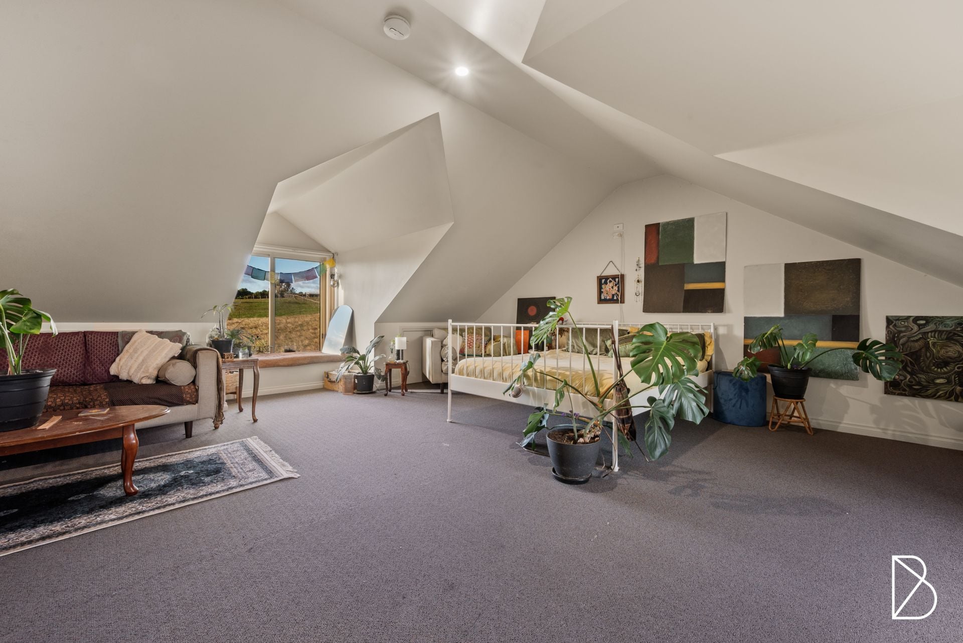 - Upstairs retreat with peaked ceilings, own bathroom.