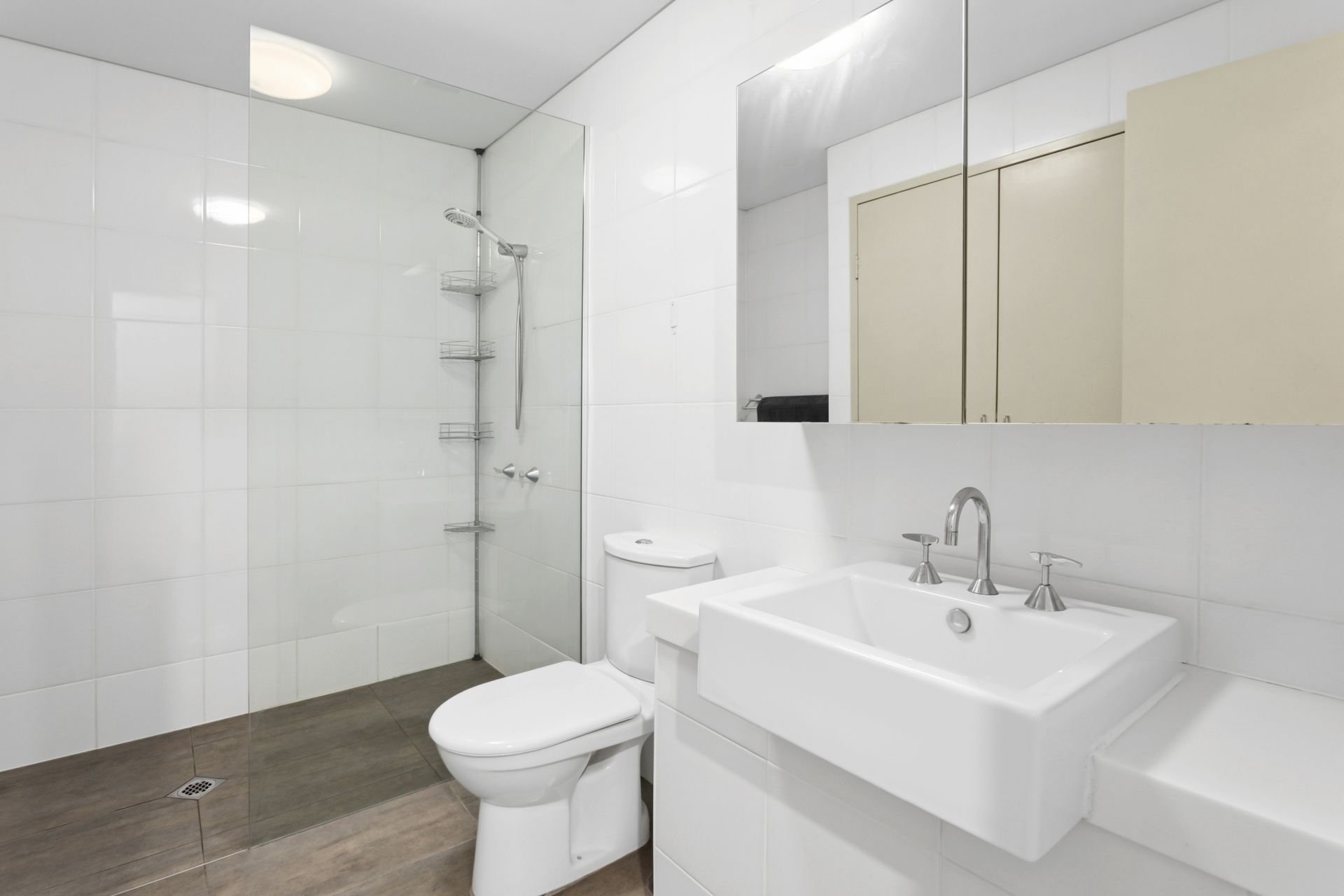 • Good sized bathroom with floor to ceiling tiling, frameless shower, and stone top vanity with storage + integrated laundry