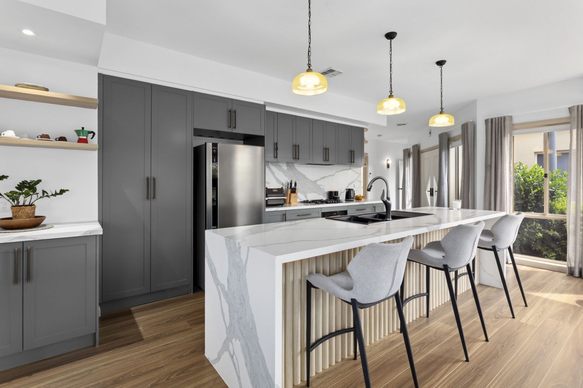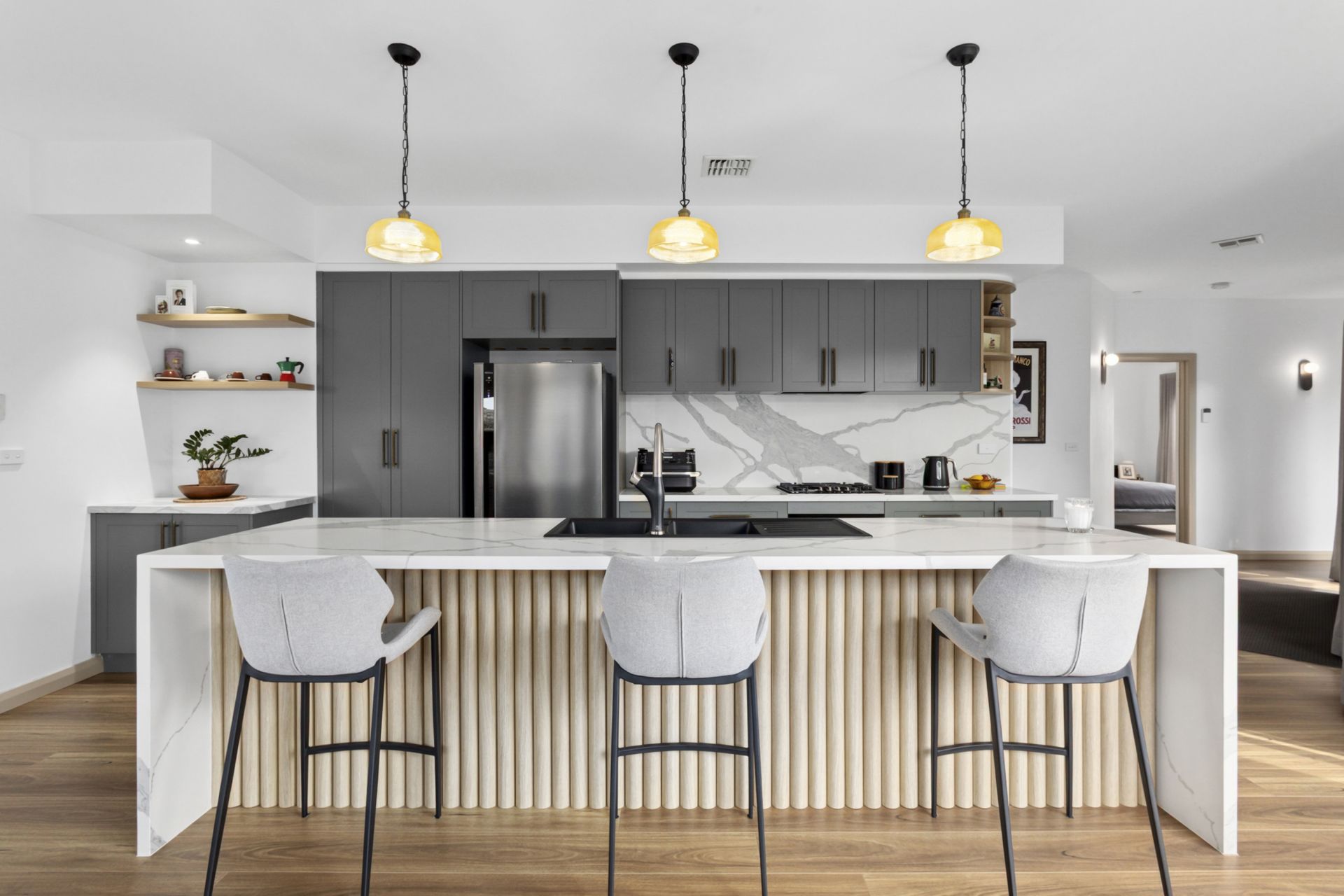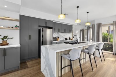 At the heart of the home, the central entertainer's kitchen boasts stone benchtops with a waterfall-edge island, a gas hob, marble-look splashback, dishwasher, and ample storage within sleek, high-quality cabinetry.