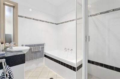 Accommodation is thoughtfully laid out, featuring three generously sized bedrooms, including a luxurious main suite complete with a walk-in robe, private patio, and a stylish ensuite with a full bathtub. The additional bedrooms include built-in robes and are serviced by a modern main bathroom with a separate shower, bathtub, and large vanity, plus a convenient separate toilet.