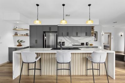 • Central entertainers' kitchen with stone benchtops, waterfall edge eat-at kitchen island bench, Bosch appliances, marble look splashback, and plenty of storage behind quality cabinetry
