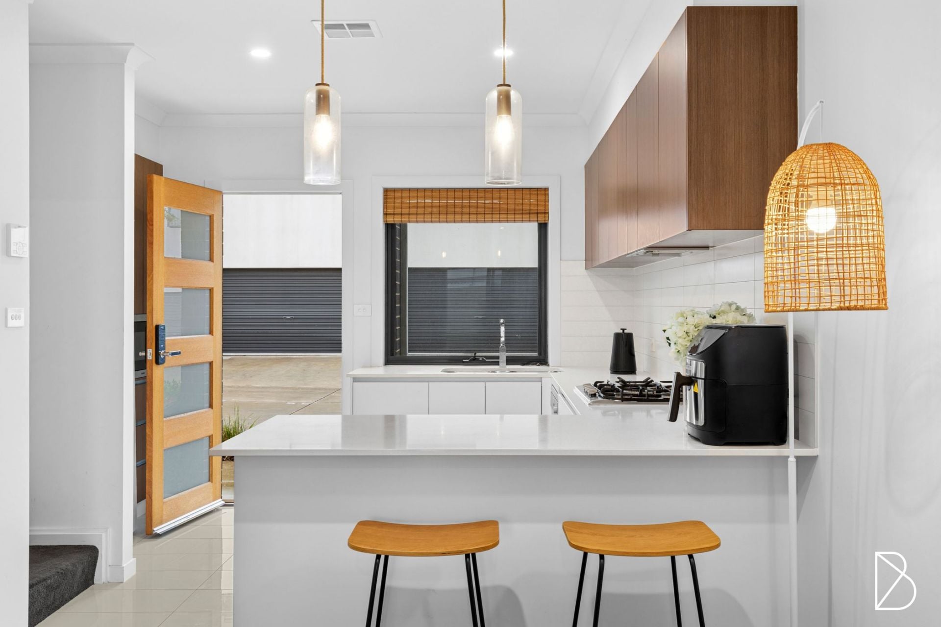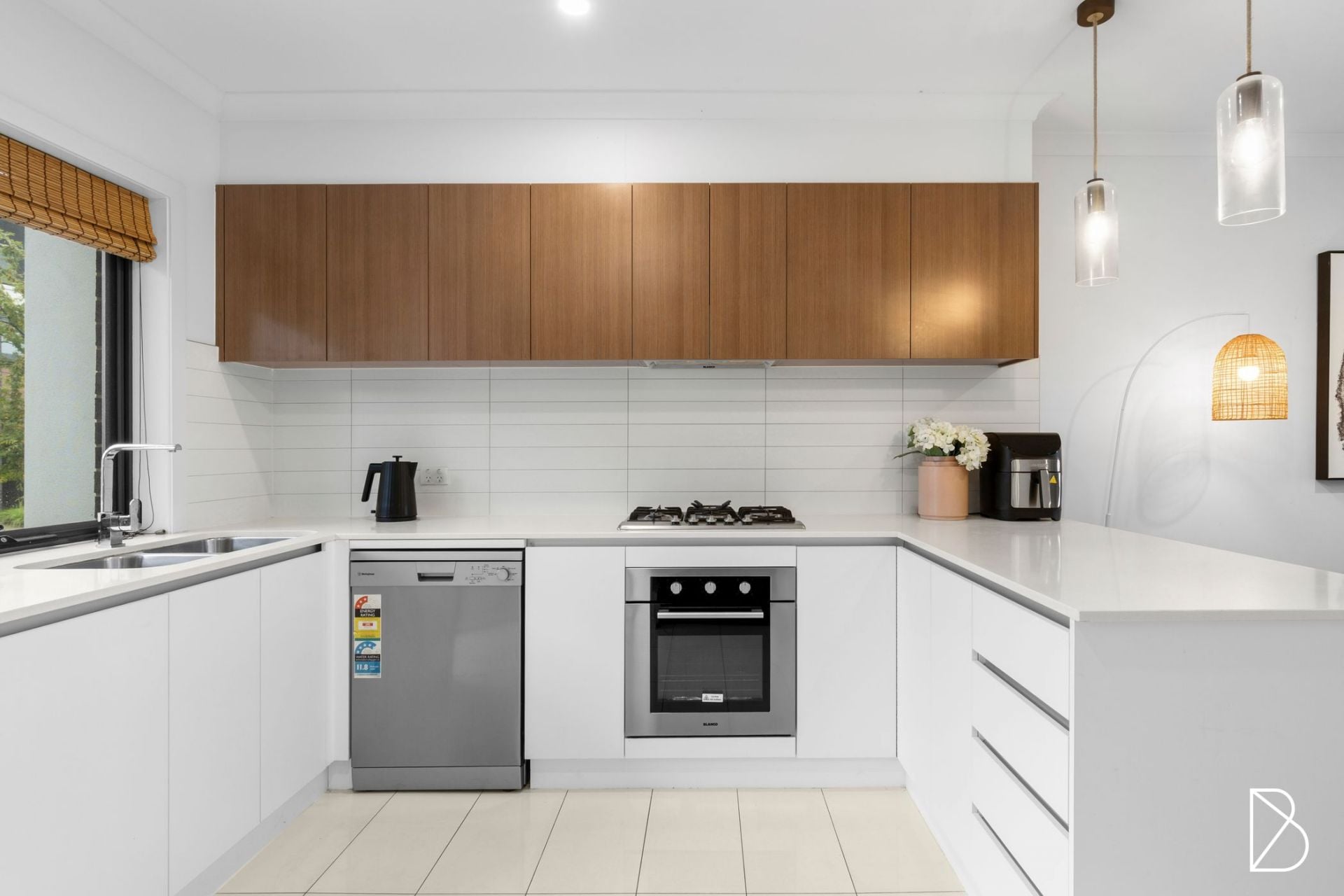 • Generous kitchen with stone benchtops, breakfast bar, gas cooktop, tiled splashback, dishwasher, and plenty of storage behind two tone cabinetry