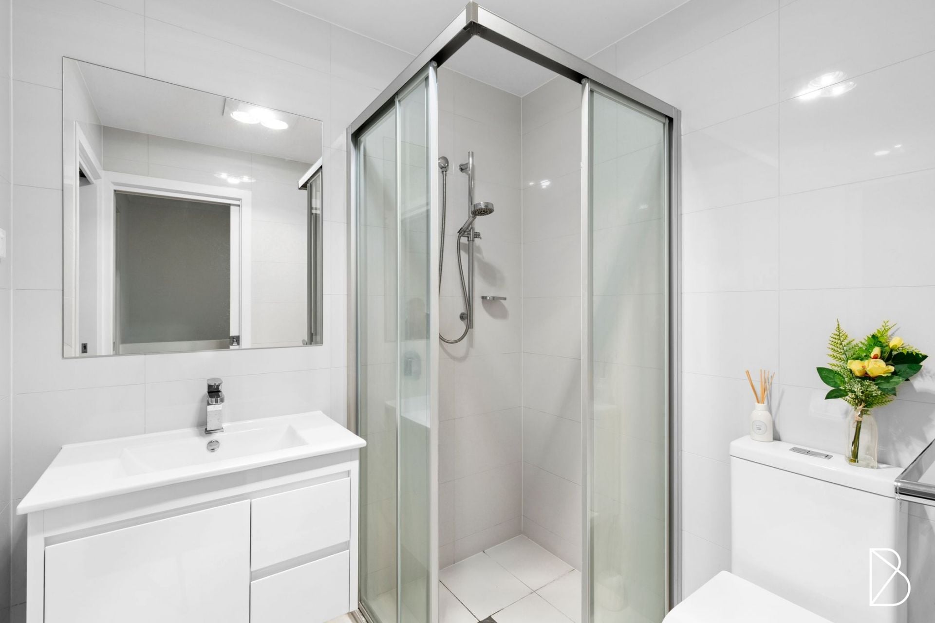 • Main bathroom with corner shower, floating stone top vanity, and floor to ceiling tiling