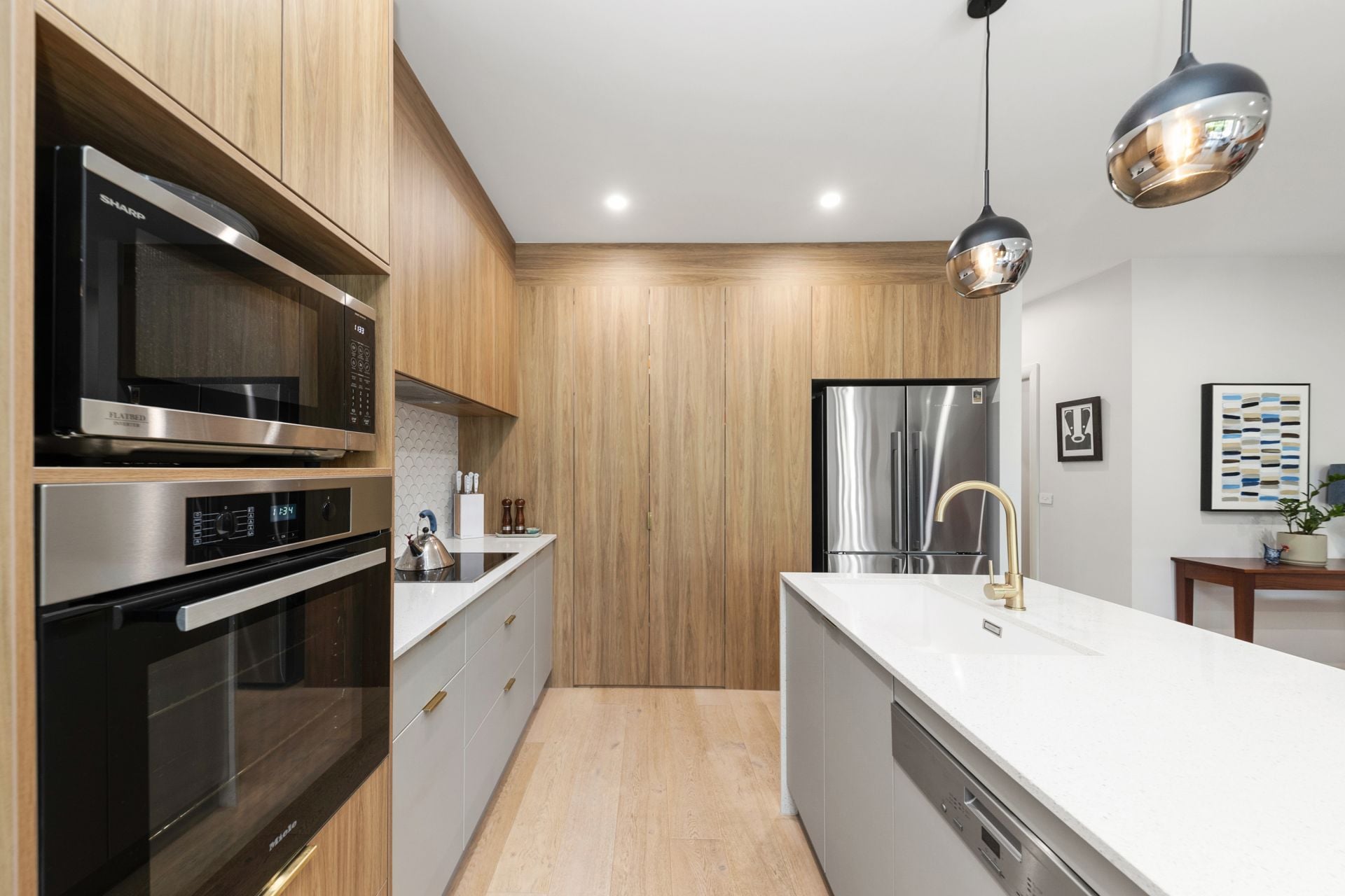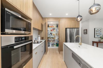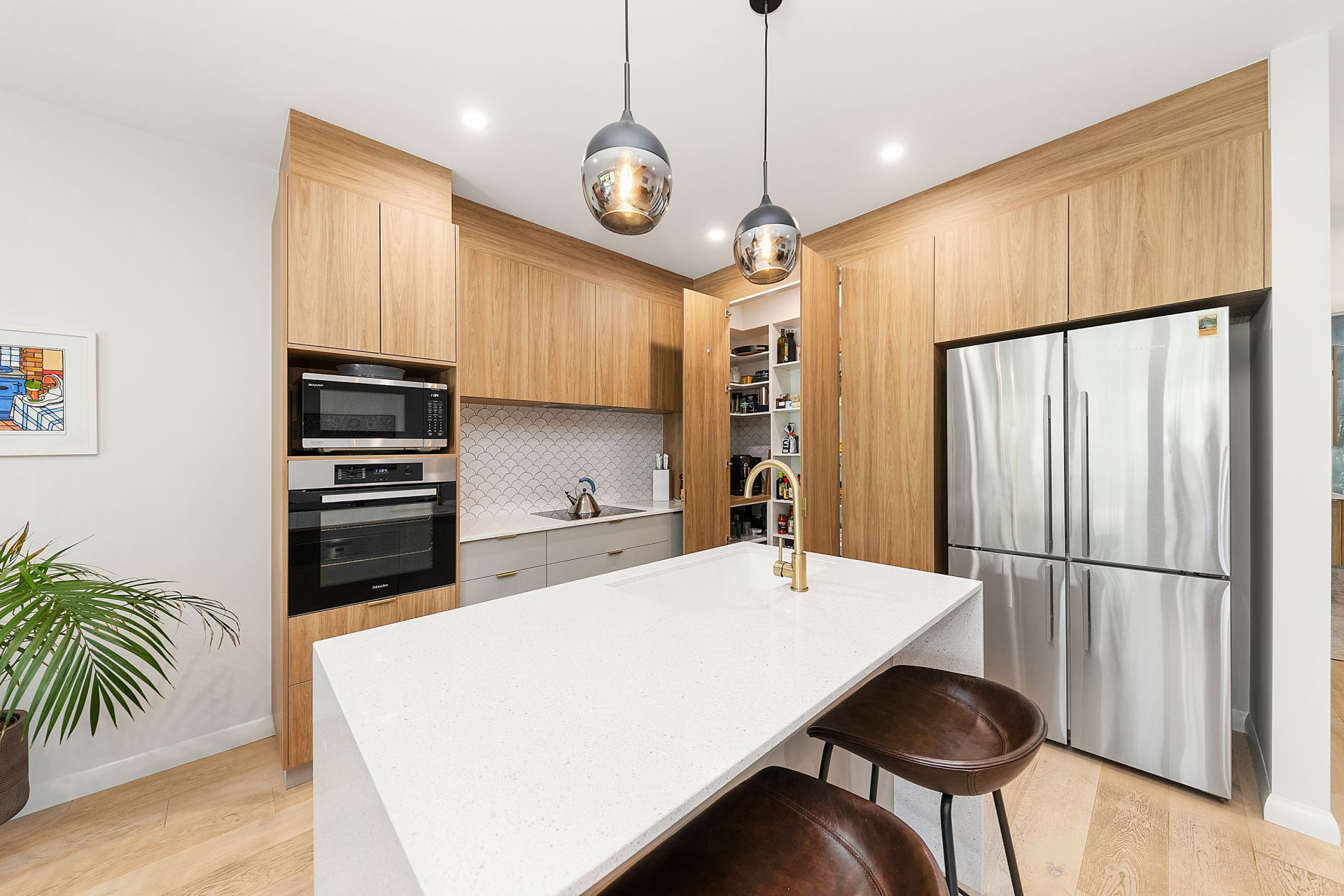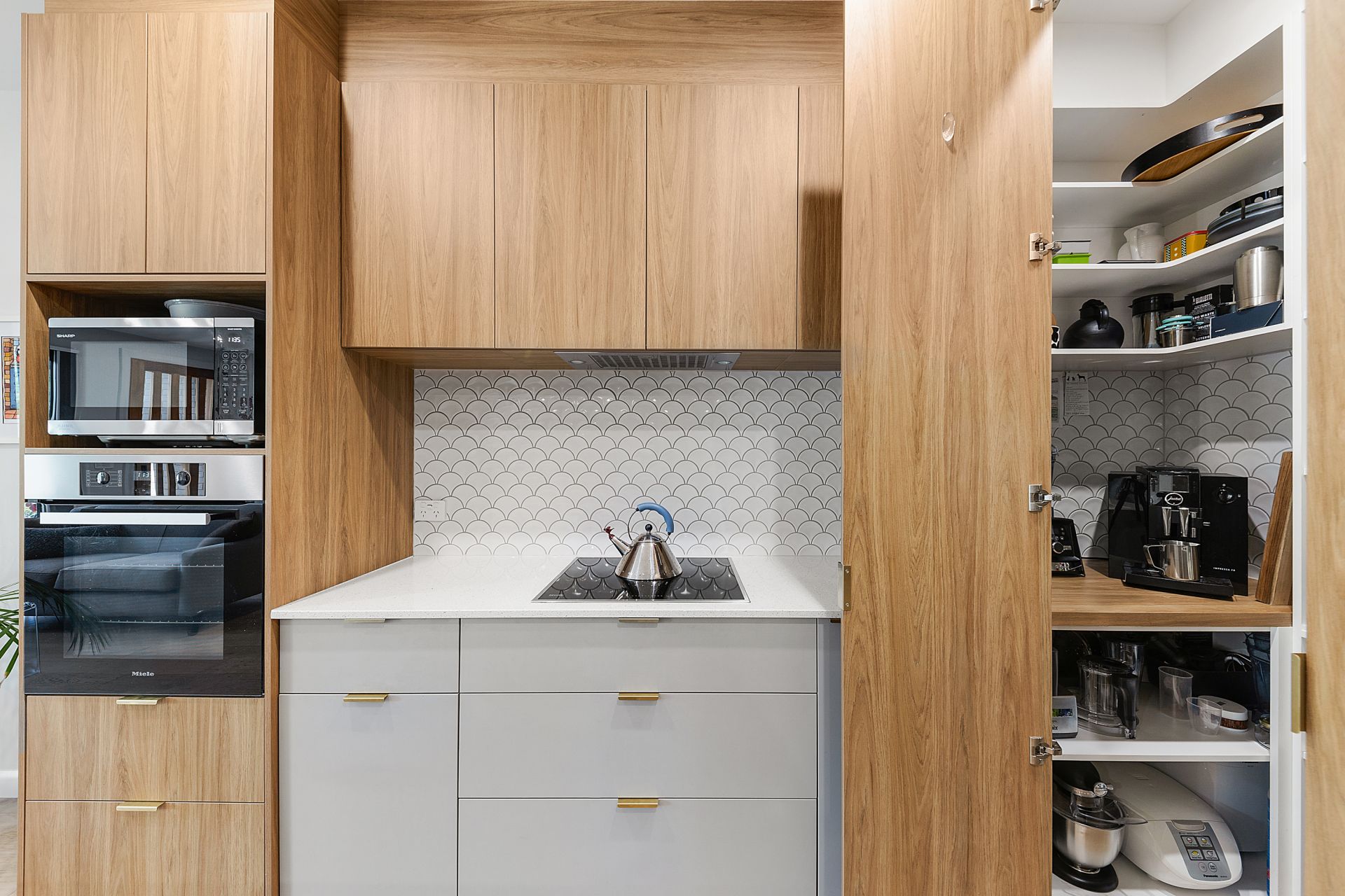 • Designer kitchen featuring Miele appliances, concealed walk-in pantry, stone benchtops, and feature tiling