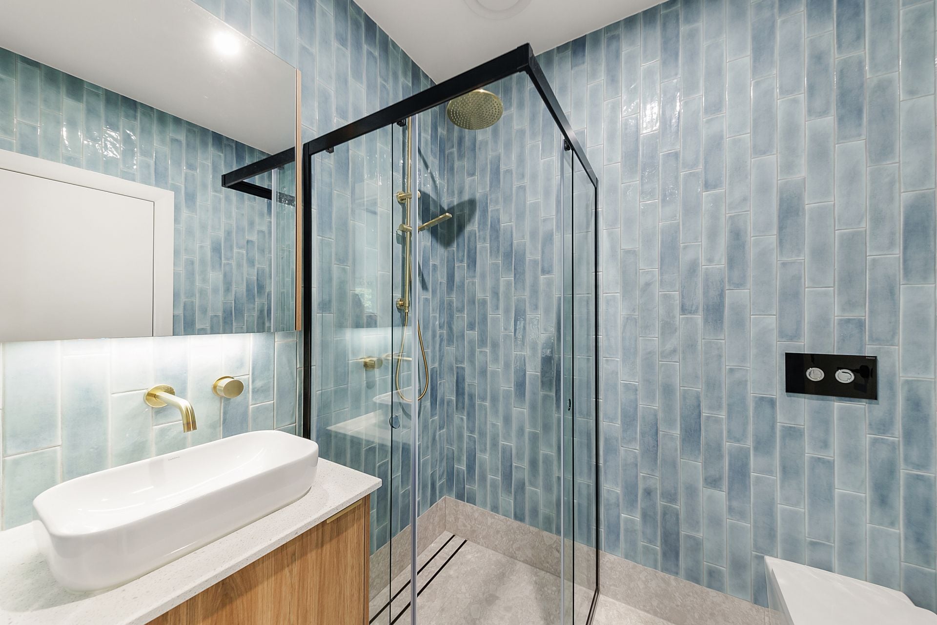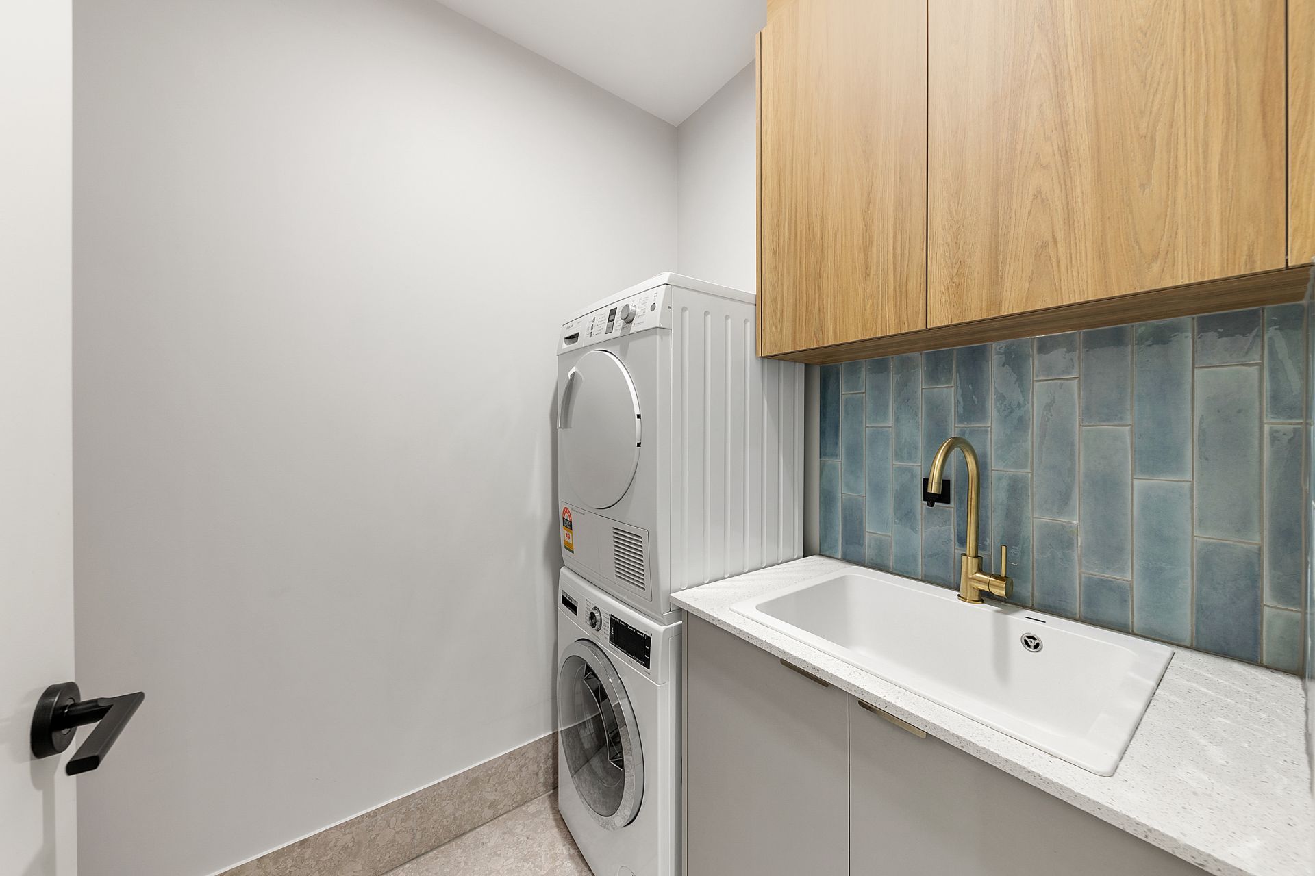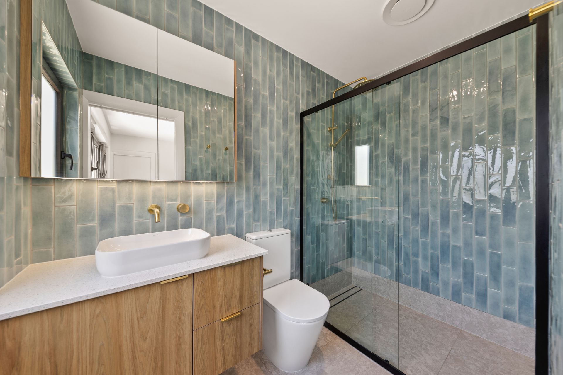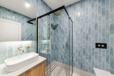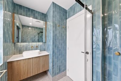 • Bathrooms finished with floor-to-ceiling tiles, gold tapware, and thoughtful storage