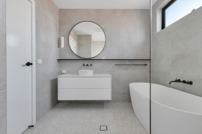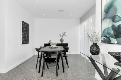 The kitchen is a chef's delight, featuring sleek waterfall-edge stone benchtops and top-of-the-line Bosch stainless steel appliances. With ample counter space and a separate dining area that opens onto a private 24m courtyard, it's an ideal setting for everyday meals and entertaining guests.