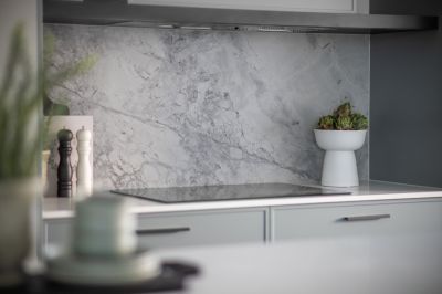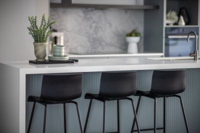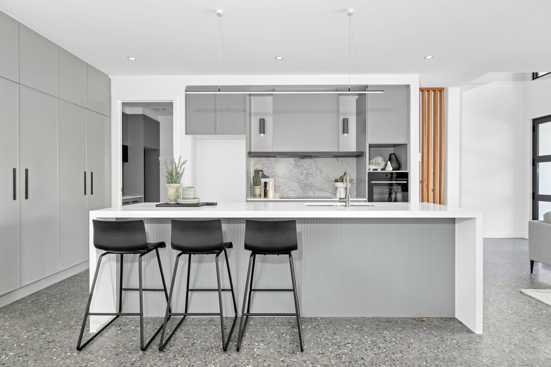- Kitchen with waterfall-edge stone benchtops and Bosch stainless steel appliances