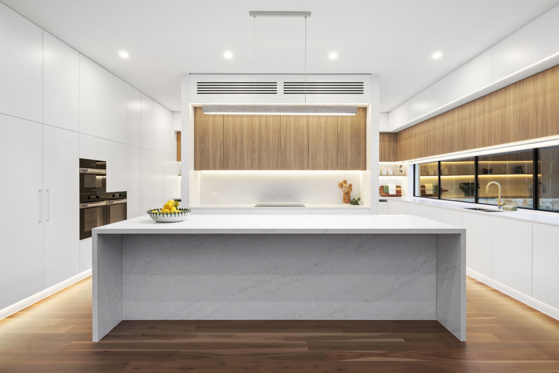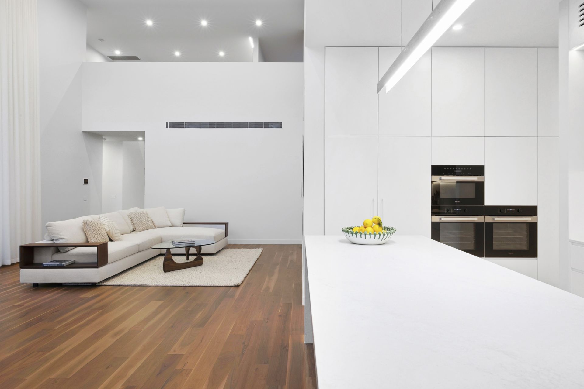 • Central open-plan kitchen with stone benchtops, quality integrated Miele appliances, island bench, and adjoining butler's pantry