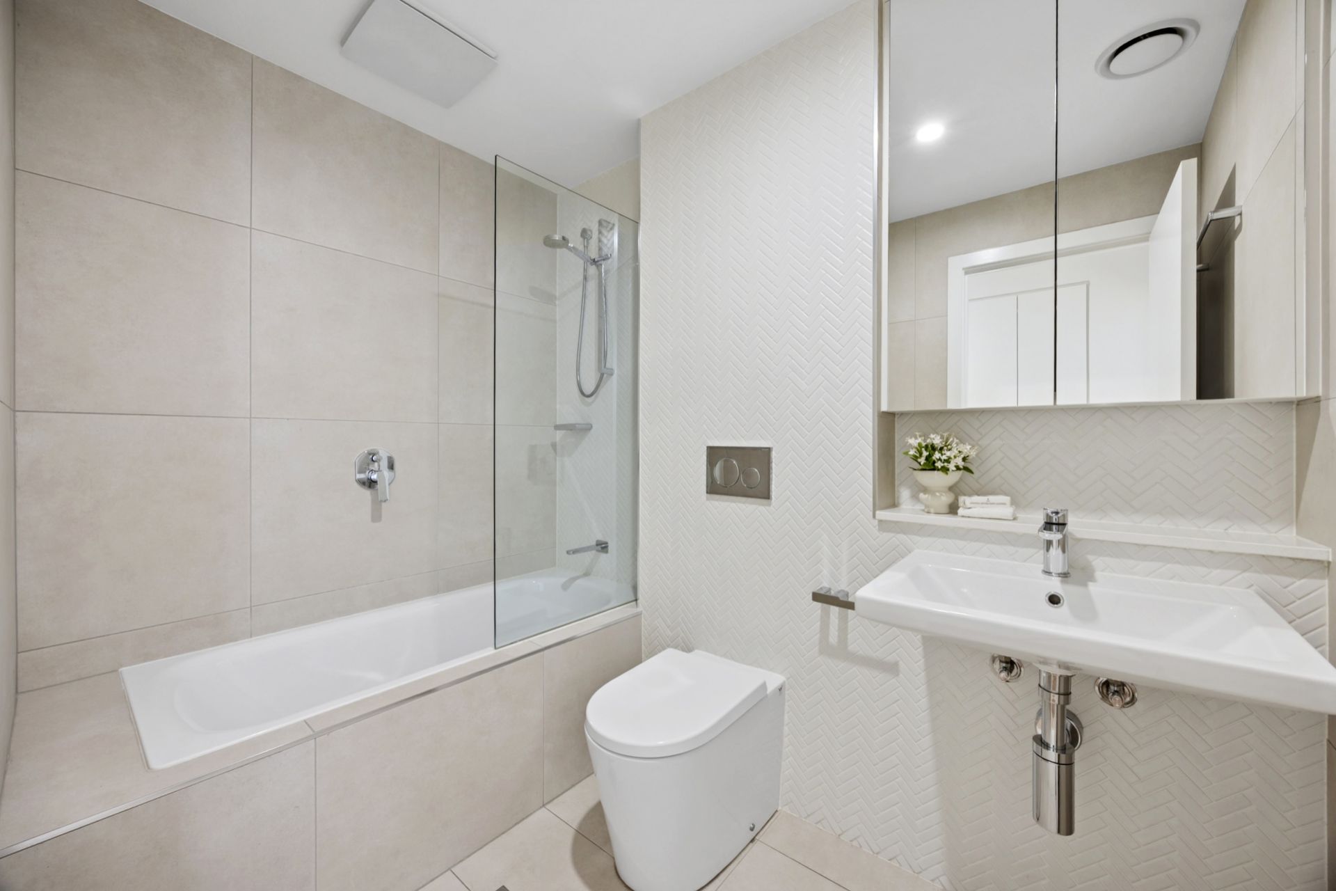 • Main bathroom featuring bathtub, designer herringbone tiling, recessed shelving and storage