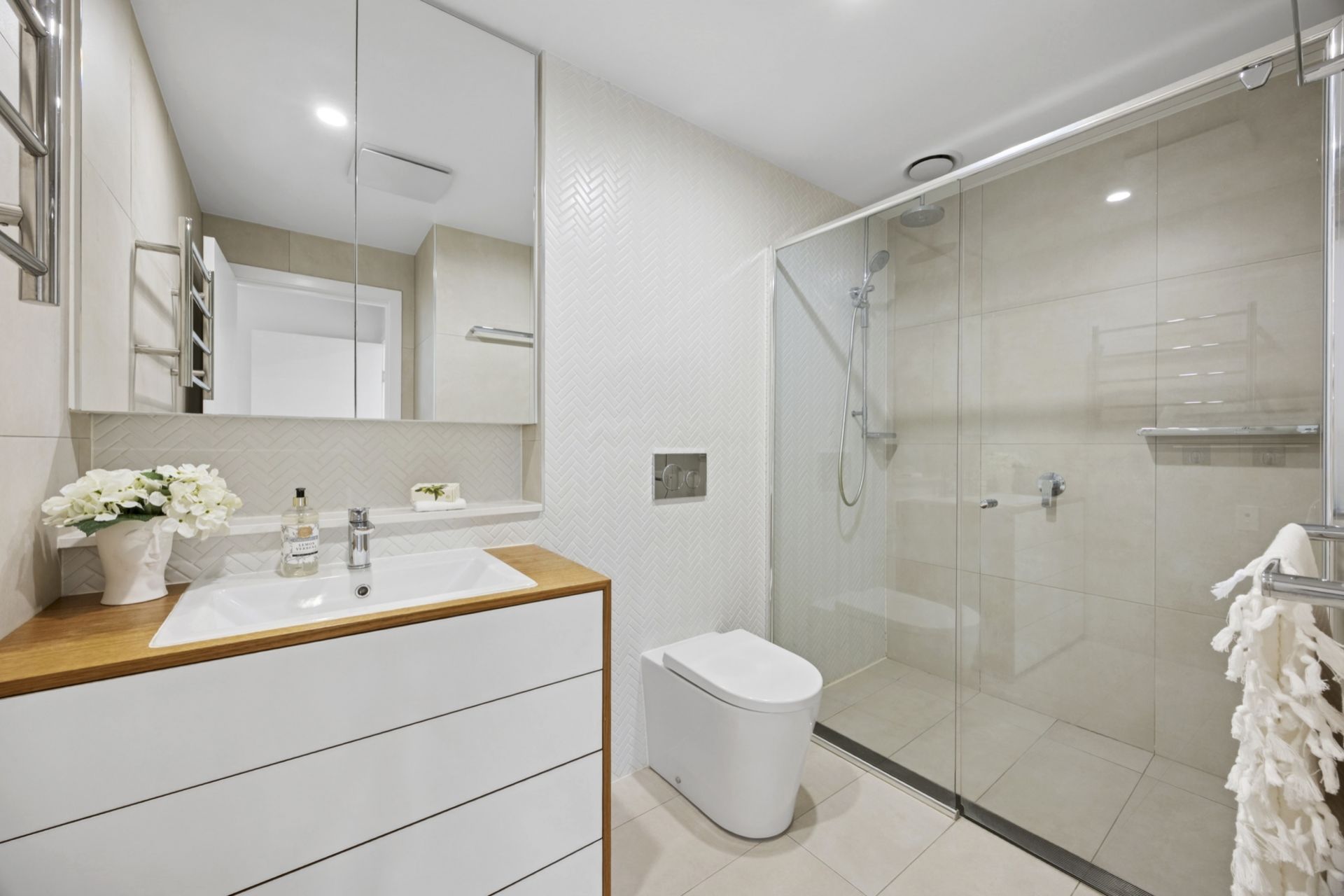 • Main suite with walk through robe and ensuite complete with over-sized frameless shower, floor to ceiling tiling and timber edged vanity with great storage