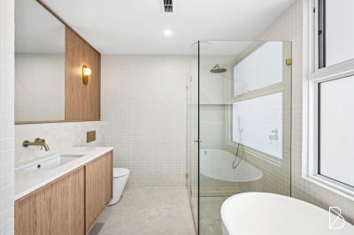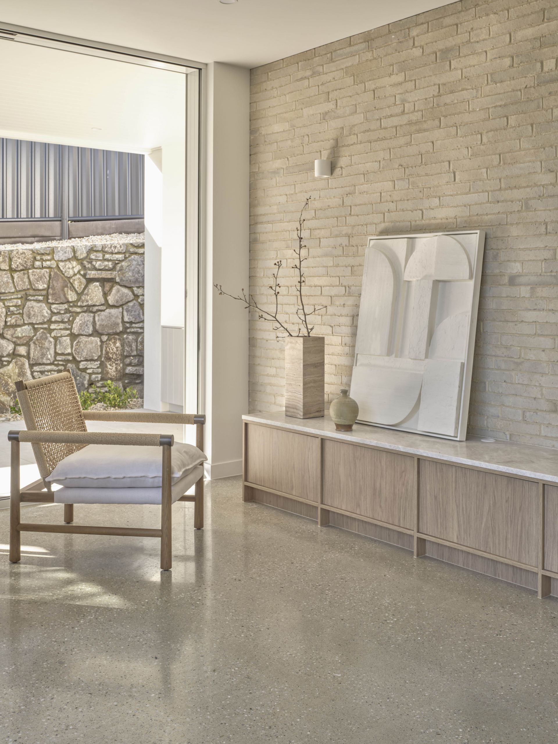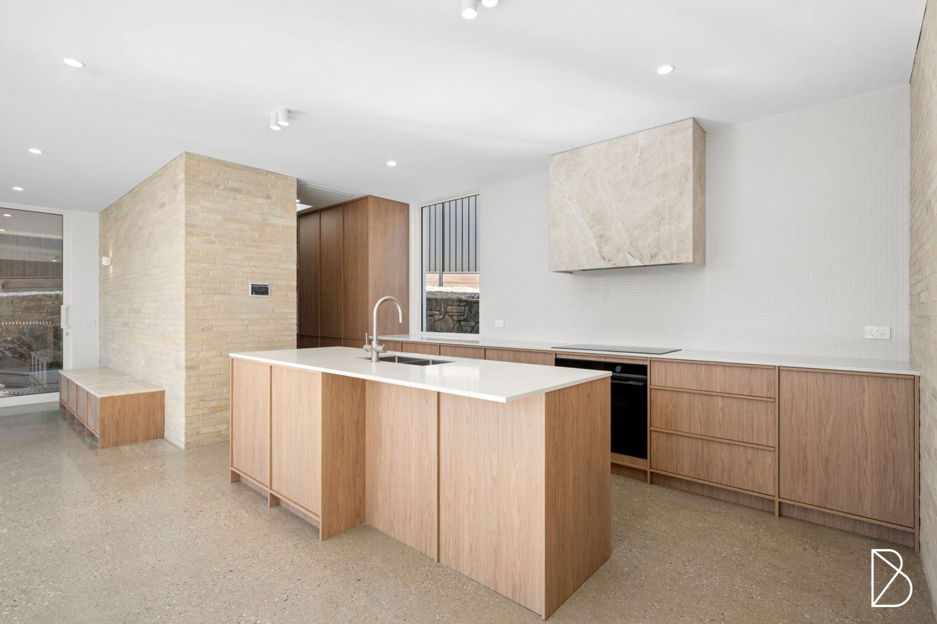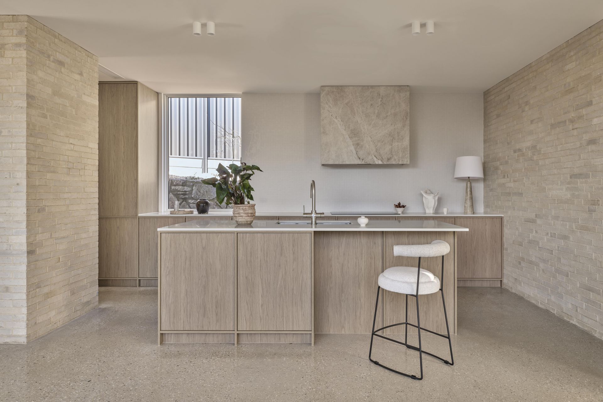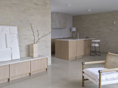 The property features a refined, minimalist design with clean lines, light timber cabinetry. The soft, natural tones are complemented by textured brickwork, creating a warm yet modern atmosphere. Large windows invite plenty of natural light, enhancing the open and sophisticated feel of the space.