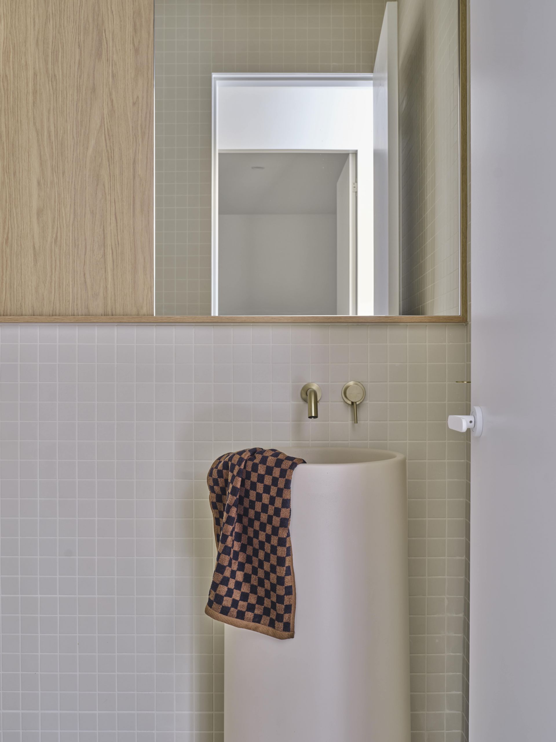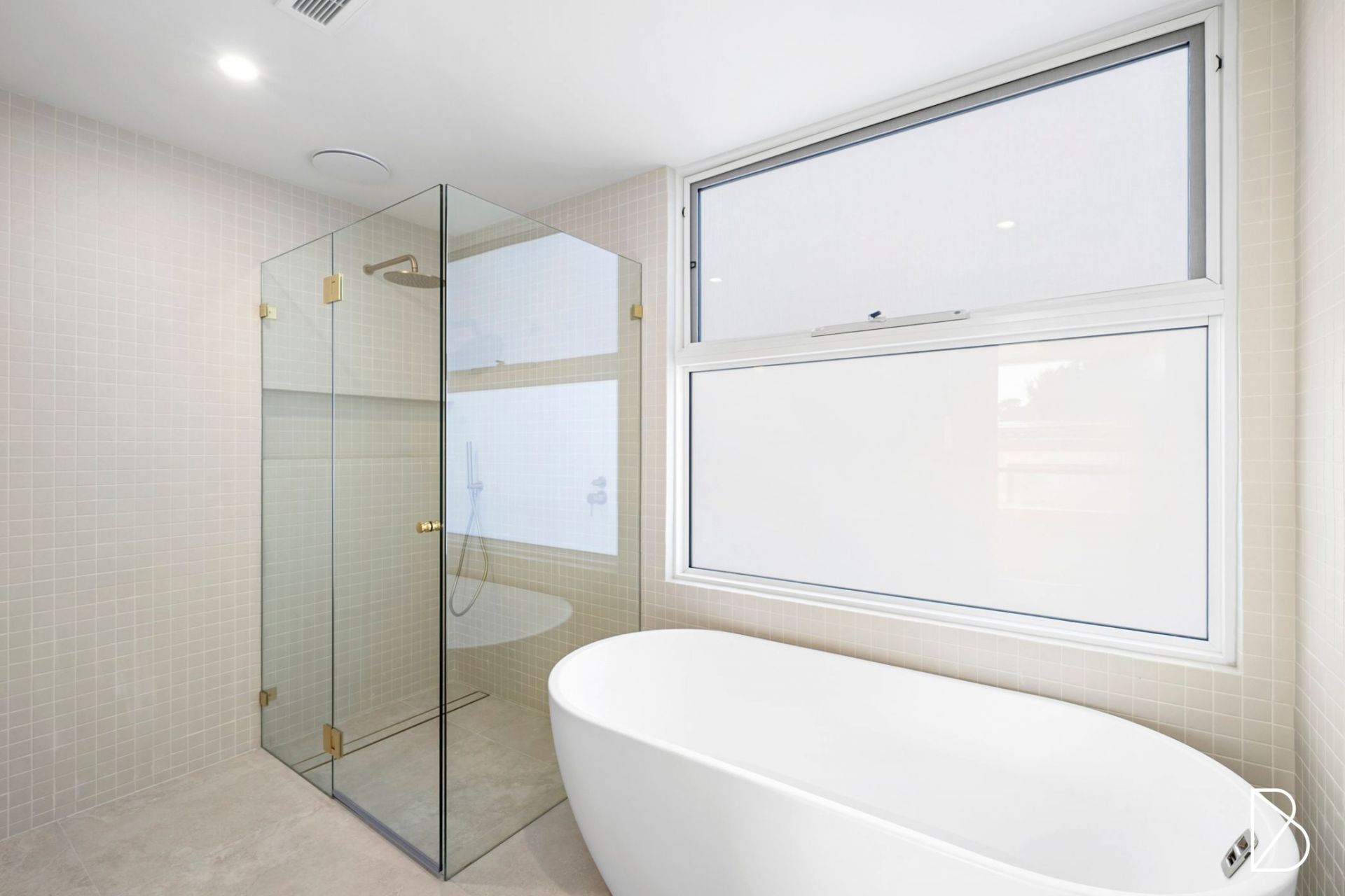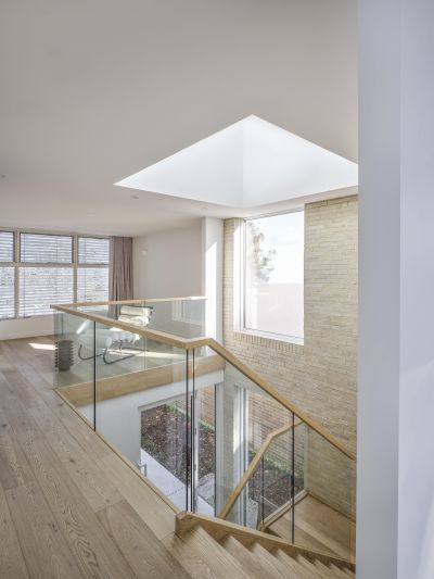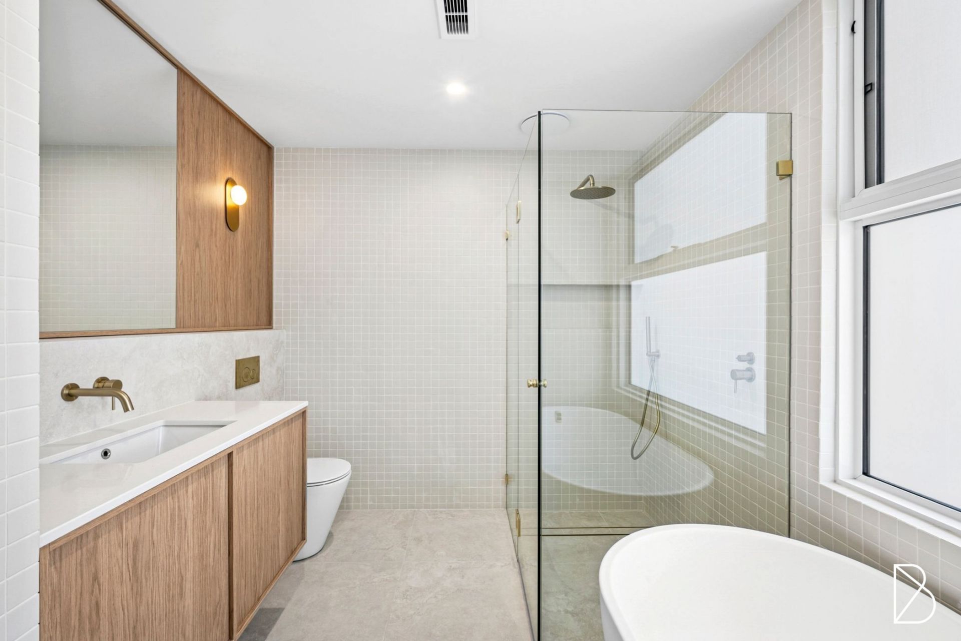 The property features a refined, minimalist design with clean lines, light timber cabinetry. The soft, natural tones are complemented by textured brickwork, creating a warm yet modern atmosphere. Large windows invite plenty of natural light, enhancing the open and sophisticated feel of the space.