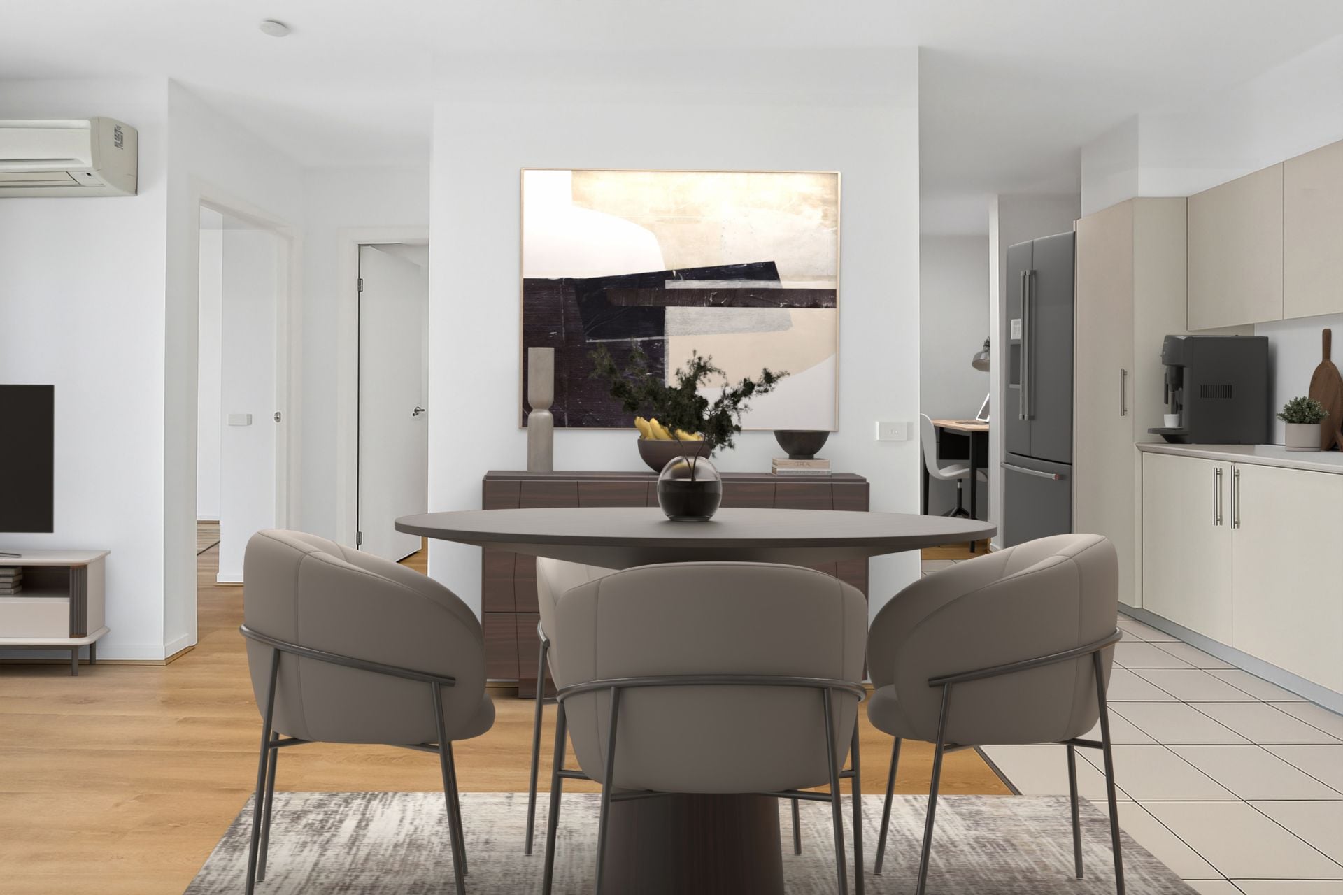 The interiors are cleverly arranged to maximise space and storage, blending chic finishes with a practical layout. From the well-equipped kitchen to the open-plan living and dining, every detail has been considered to create a comfortable and functional metropolitan lifestyle. The covered balcony extends the living area outdoors, providing a tranquil space to relax and entertain.