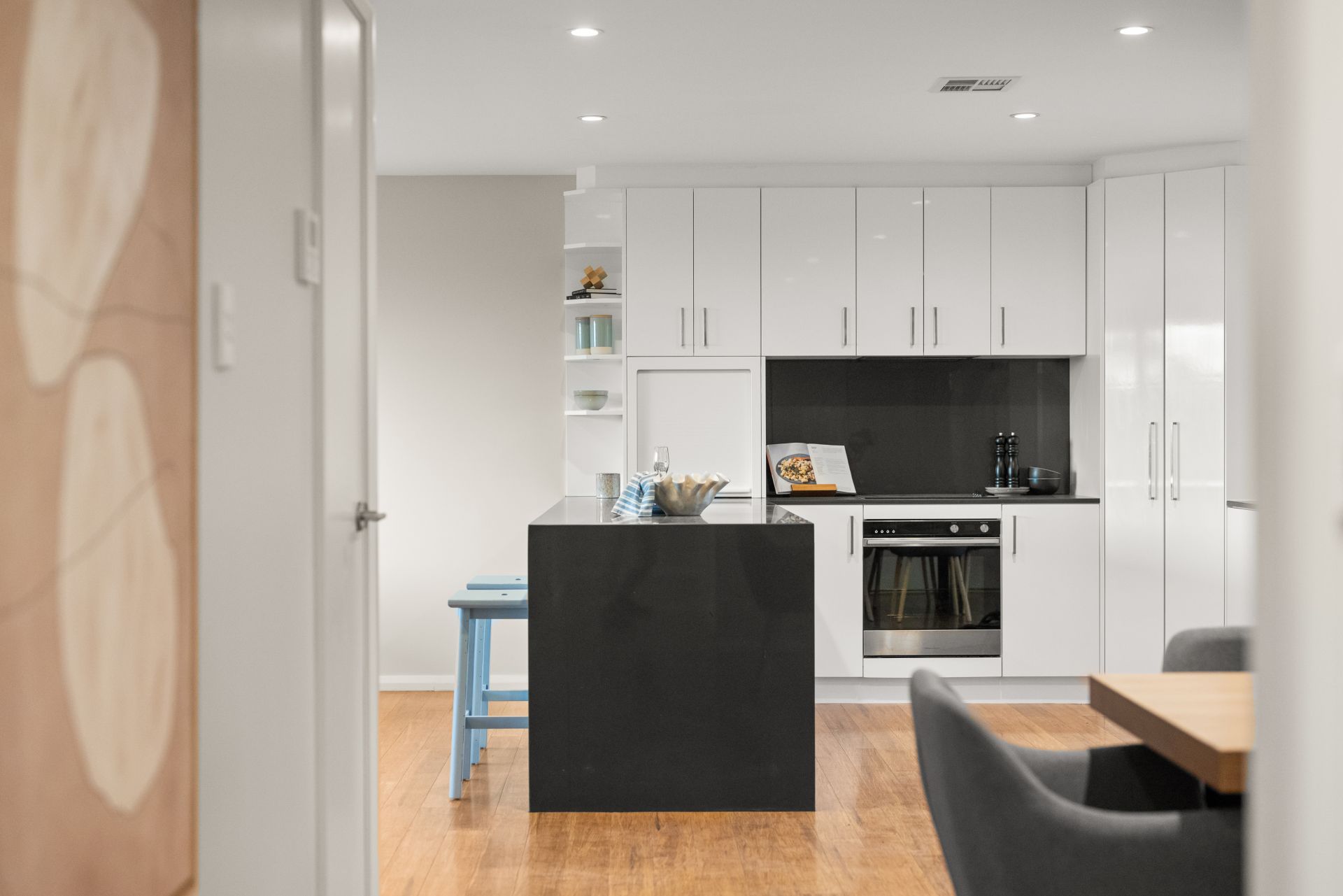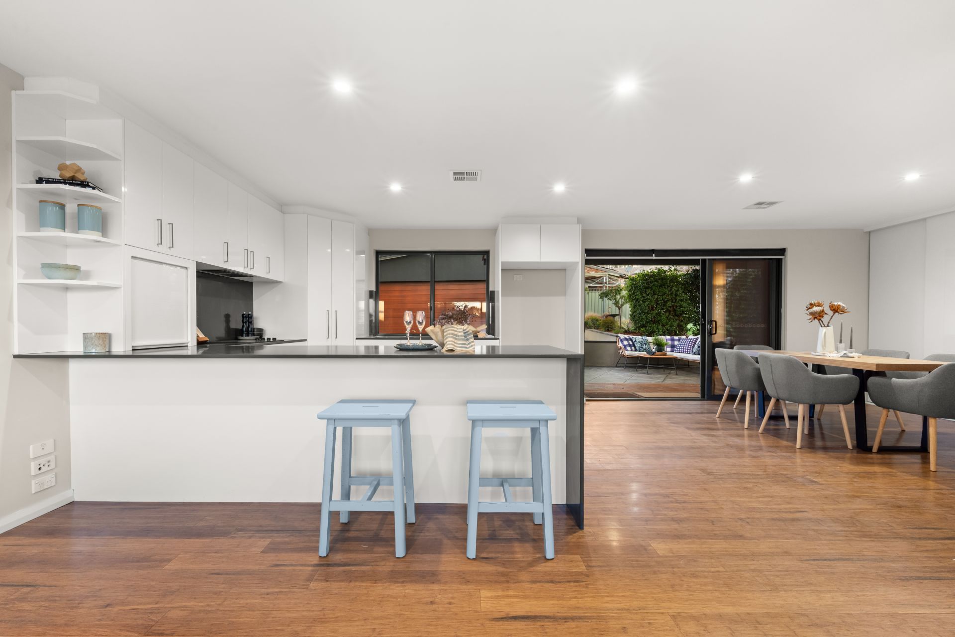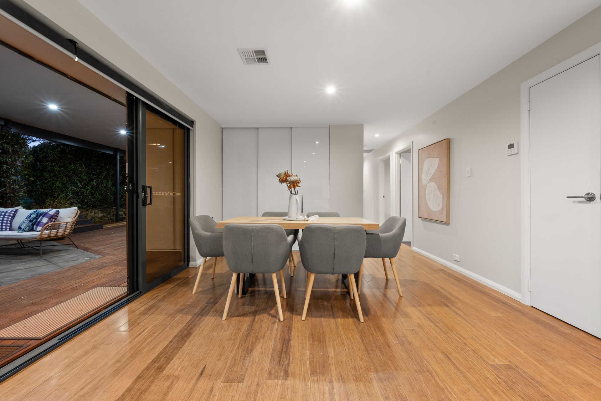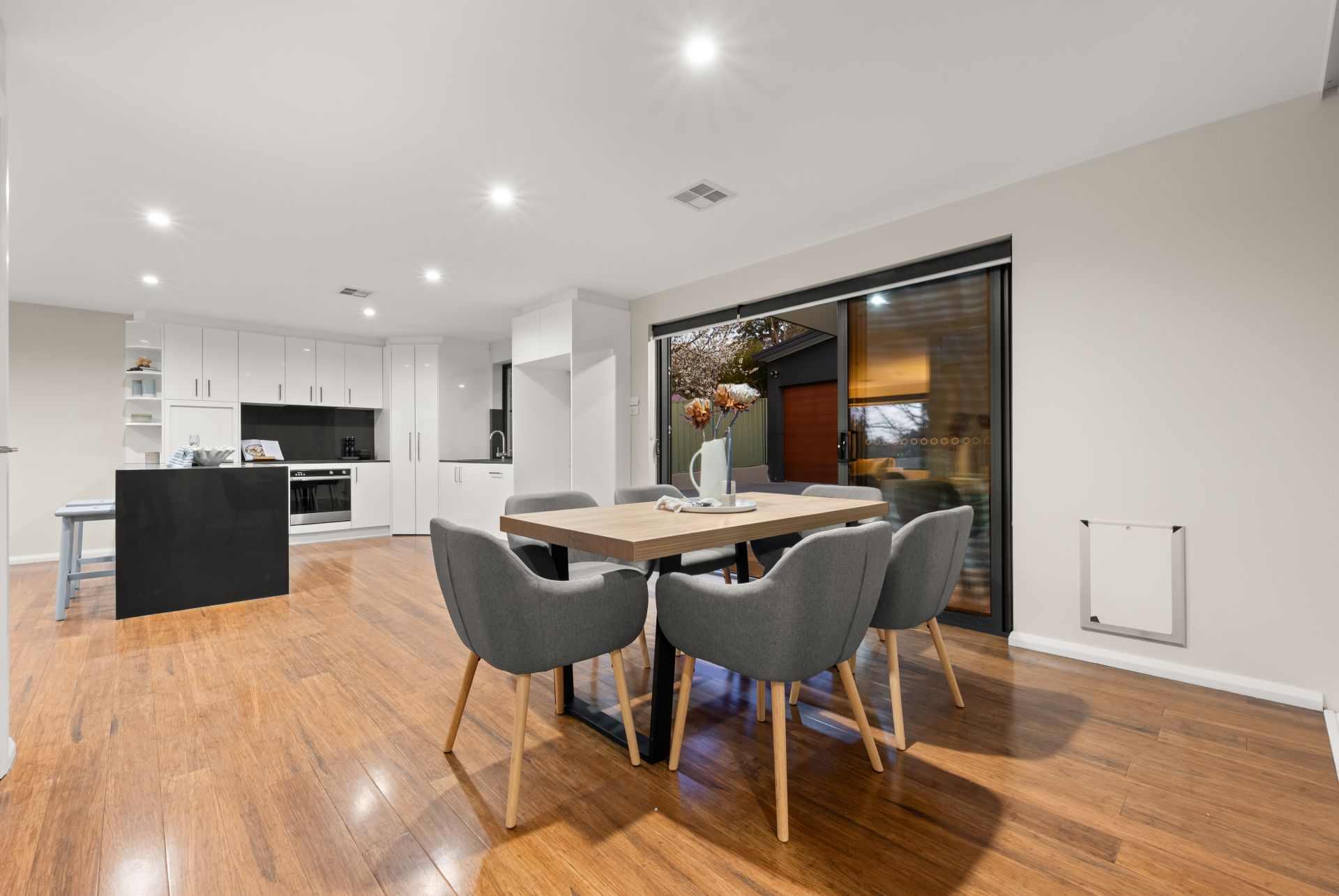 - open-plan living area with bamboo flooring.