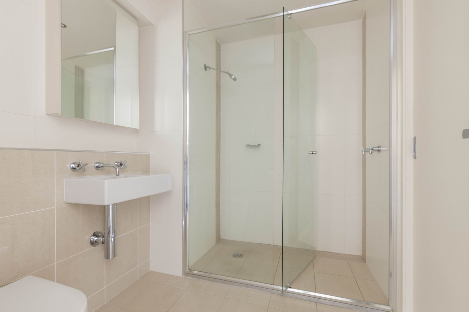 The well-proportioned bedroom includes built-in robes and opens onto a second private balcony, bringing in plenty of natural light. The bathroom is sleek and modern, with a large shower and neutral tones throughout.