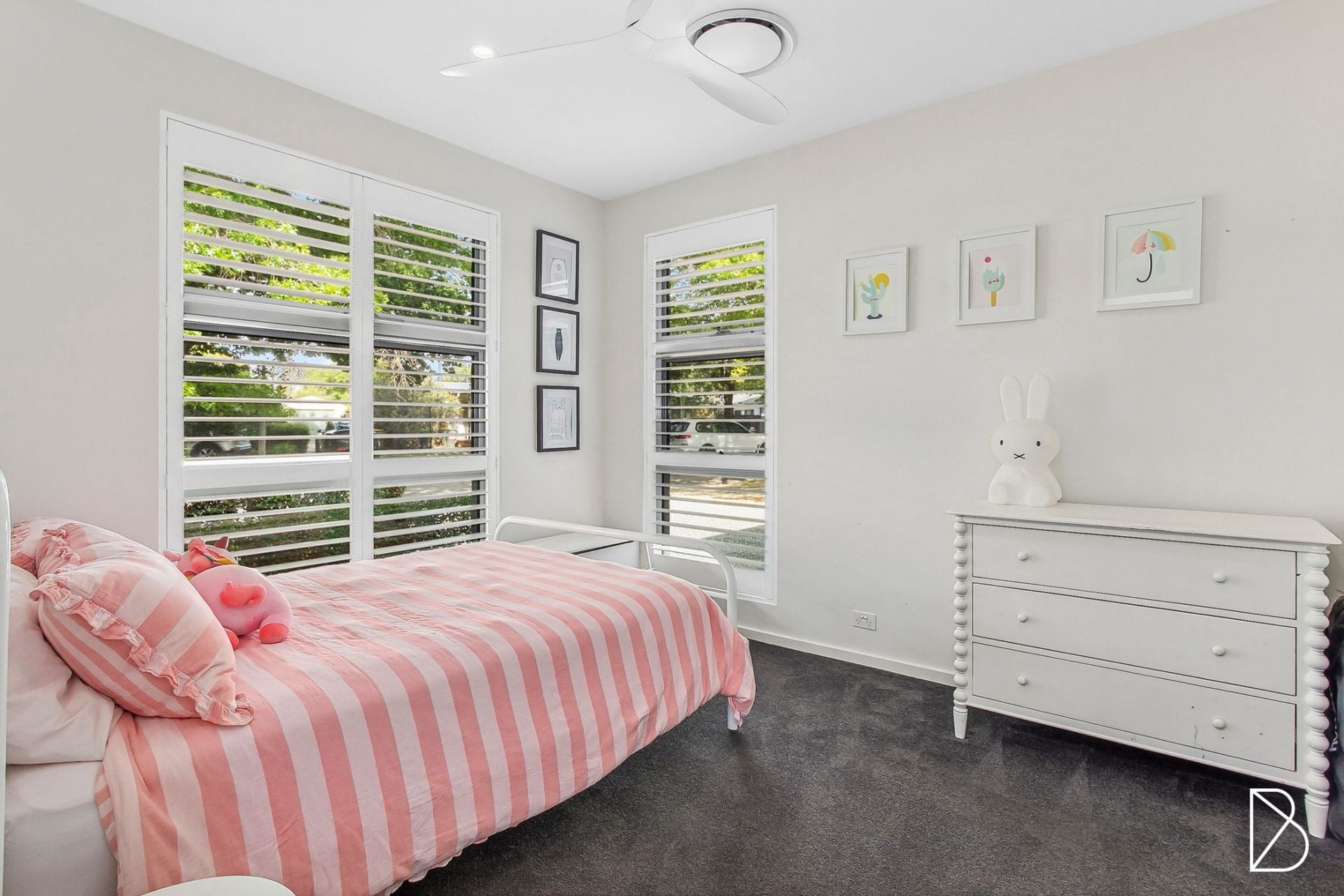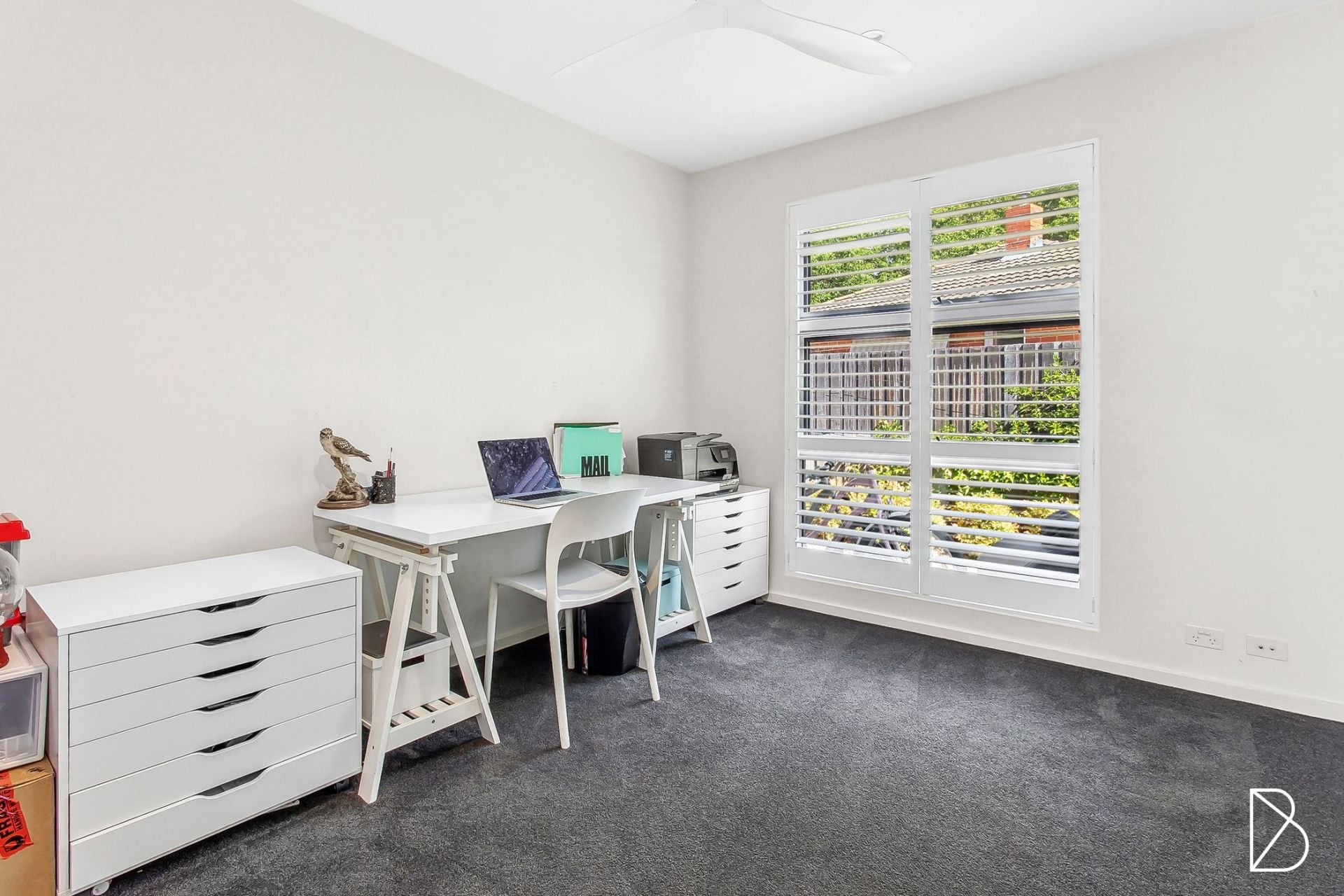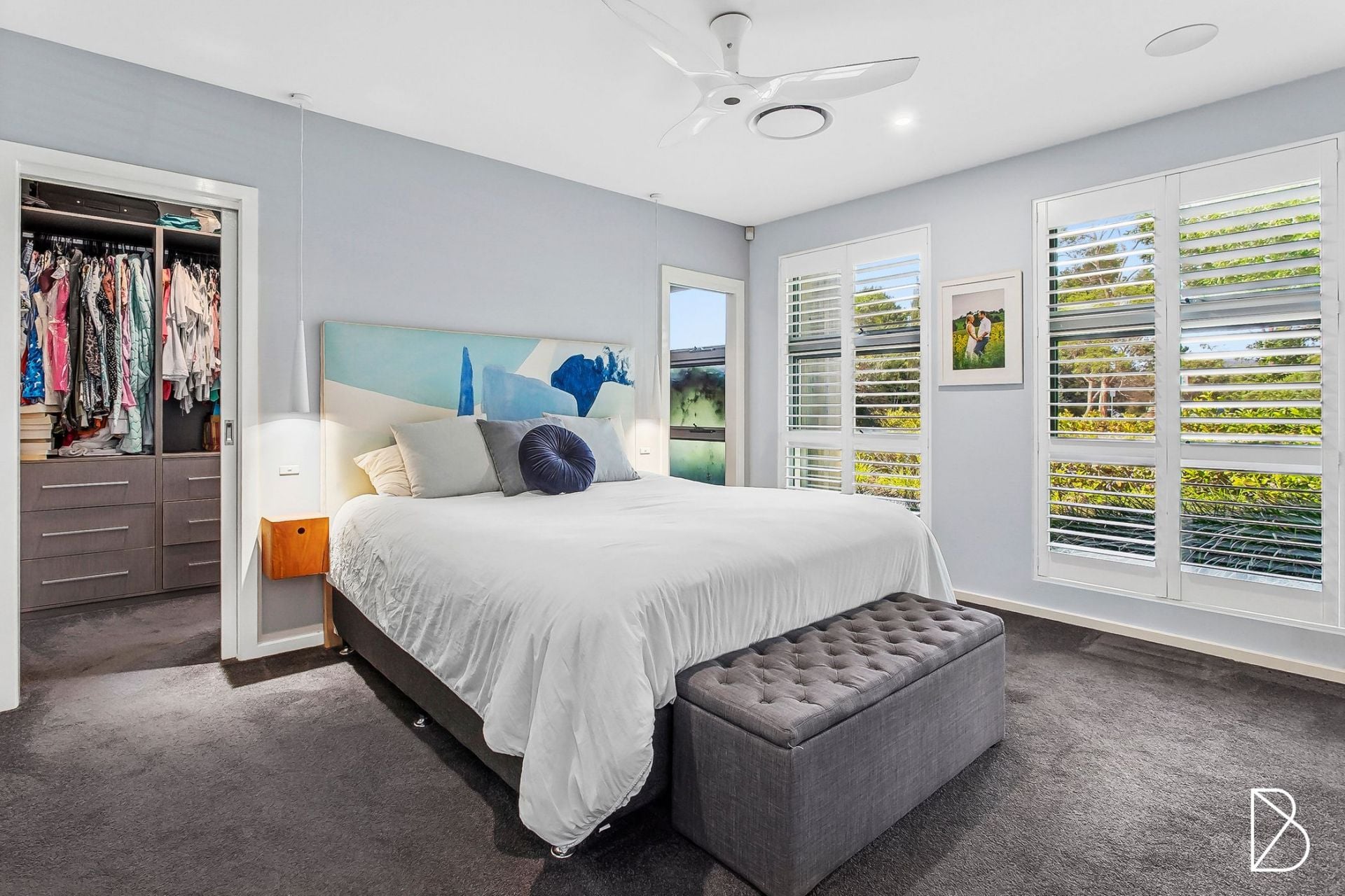 • The home features premium window treatments, including a stylish mix of shutter blinds, sheer curtains, and roller blinds.