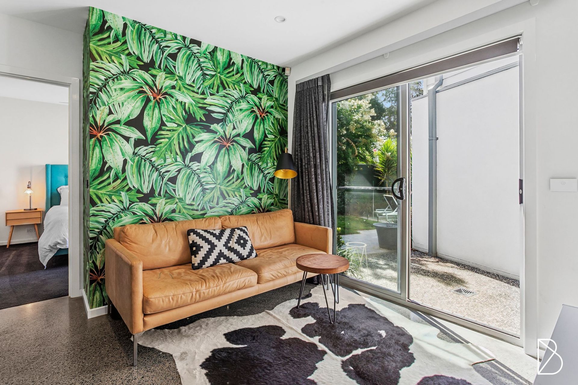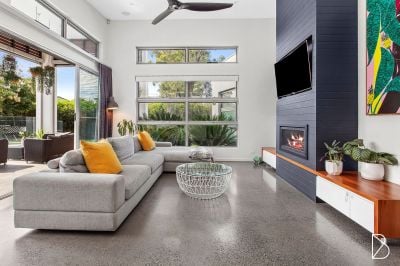 • Polished concrete flooring adds a sleek and stylish touch throughout the home, complemented by plush carpeting in the bedrooms.