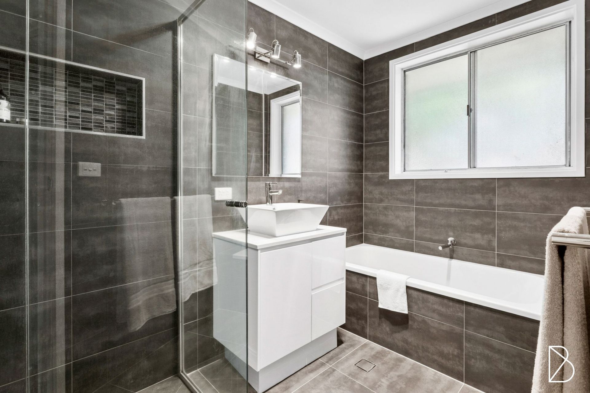 - renovated bathroom with floor-to-ceiling tiling