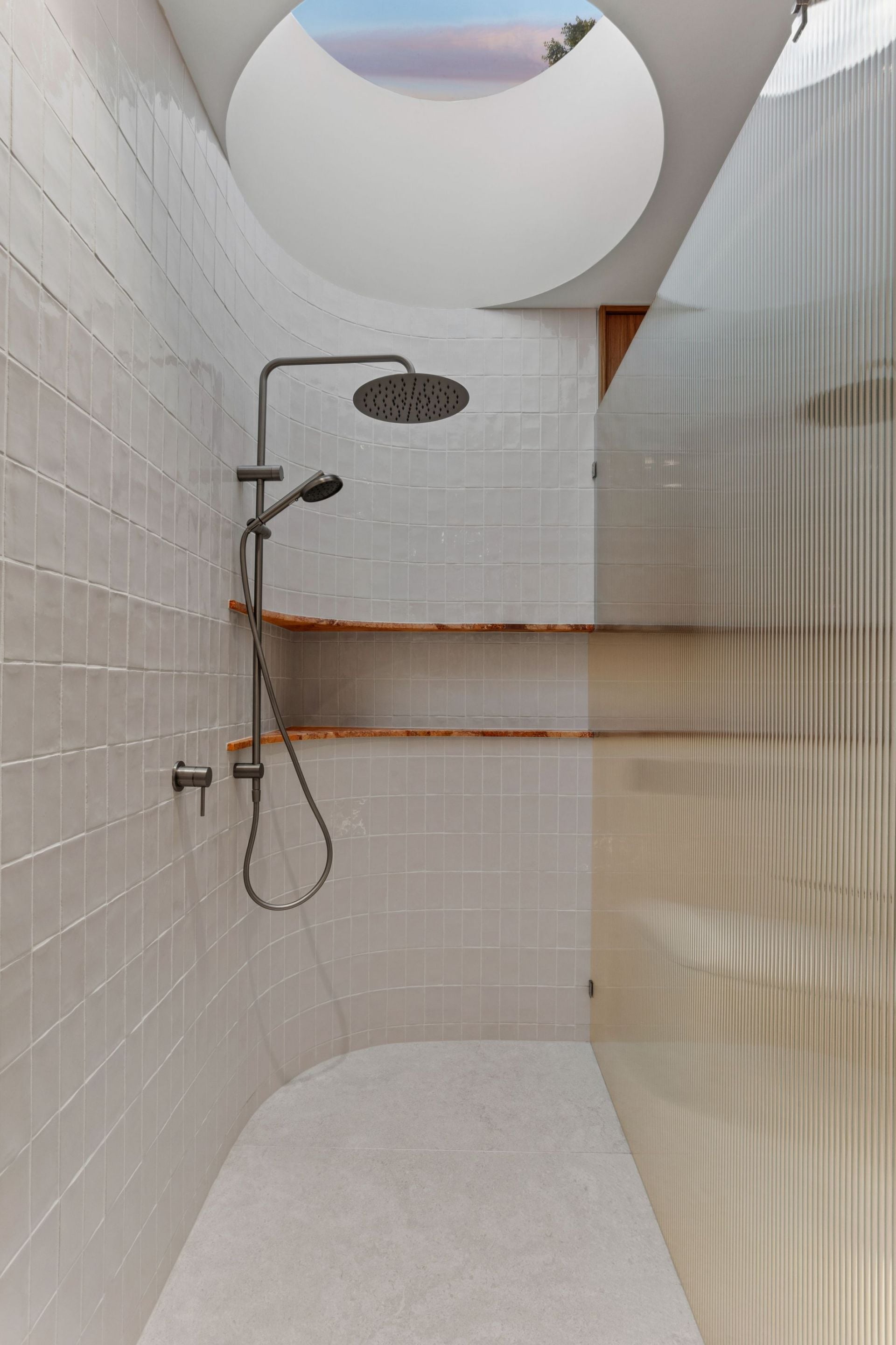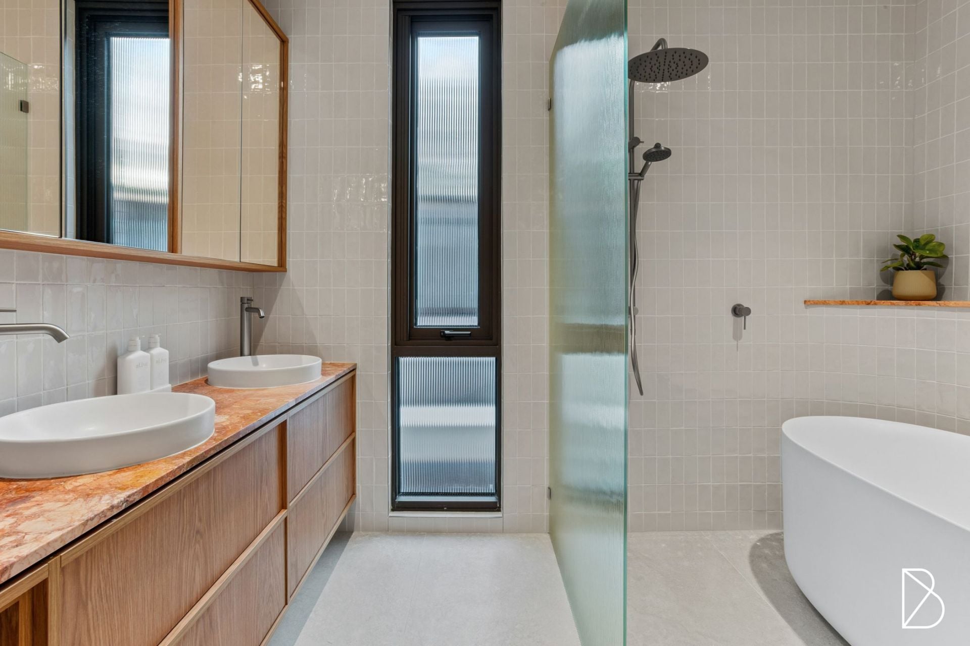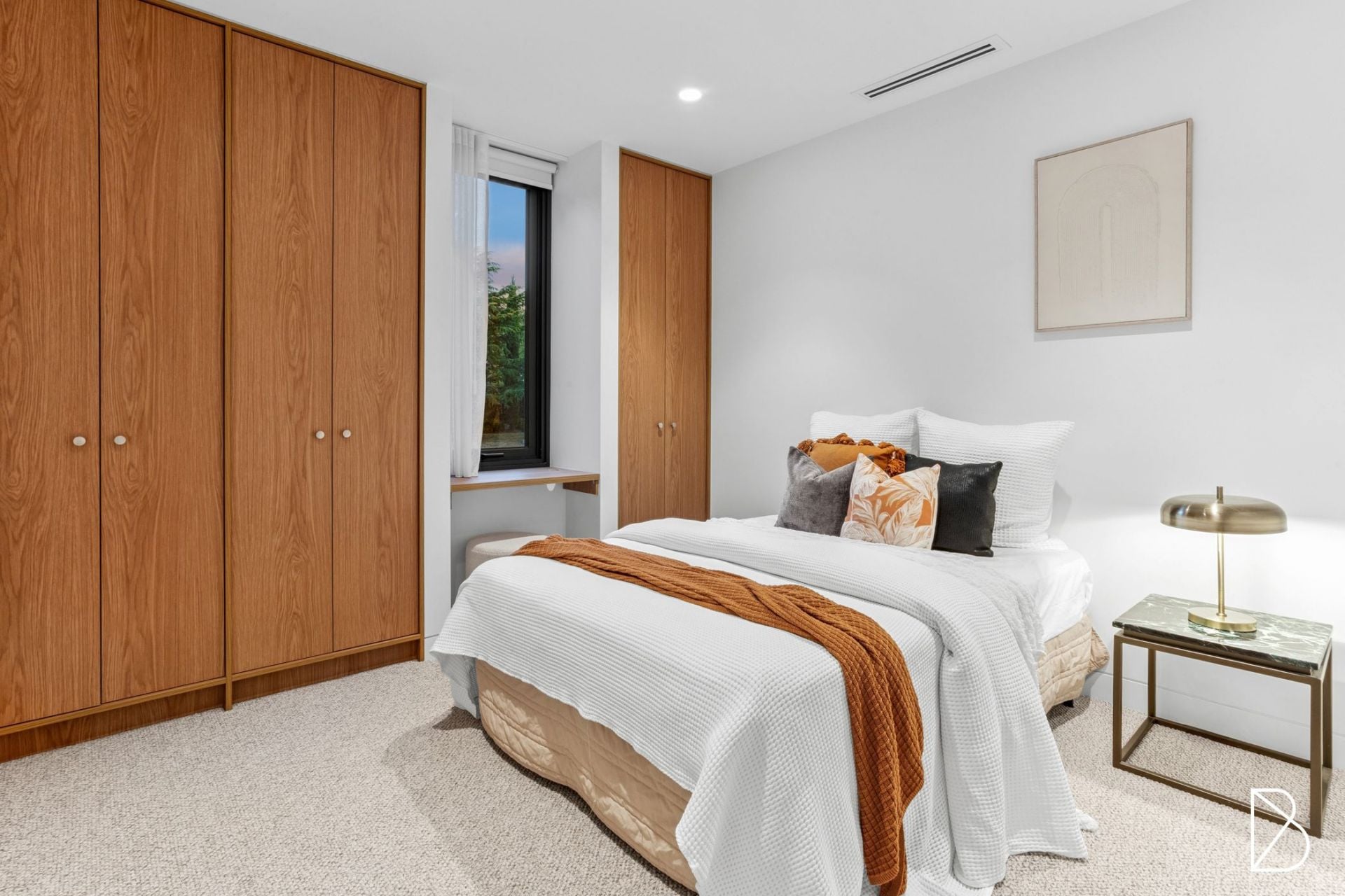 Upstairs, a central family living area connects four additional bedrooms, all featuring full height doors and wool blend carpets. The primary suite enjoys a private ensuite with heated flooring, custom American Oak joinery, skylights and access to its own rooftop irrigated garden-a rare and tranquil retreat.