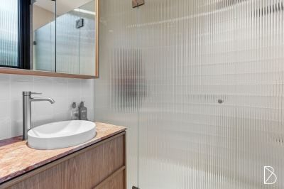 A separate lounge, complete with custom American Oak joinery, offers additional flexibility for media use or quiet retreat. The thoughtful layout continues with a ground floor guest suite - ideal for visitors or multigenerational living-accompanied by walk-in robe and a designer ensuite with custom oak vanity, marble finishes and fluted glass screens.